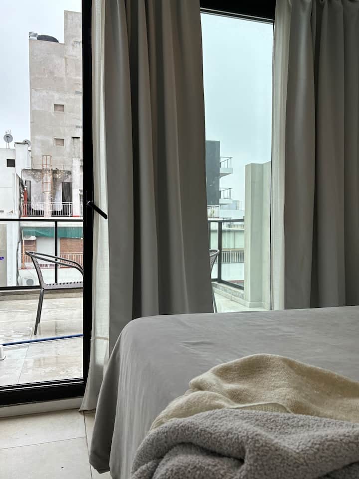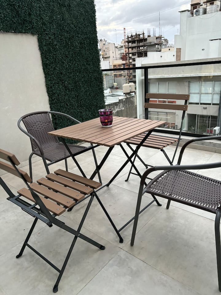 Квартира-студия в Palermo, на 9-м этаже в новом здании. В квартире полностью оборудованная кухня и мебель, есть выход на террасу. В студии кровать king-size и диван-кровать. За 3-го человека предусмотрена доплата в размере $15. В описании также указаны магазины и заведения поблизости: «Rita Specialty Coffee Matienzo», COTO, а также Market Pulgas в 15 минутах пешком.