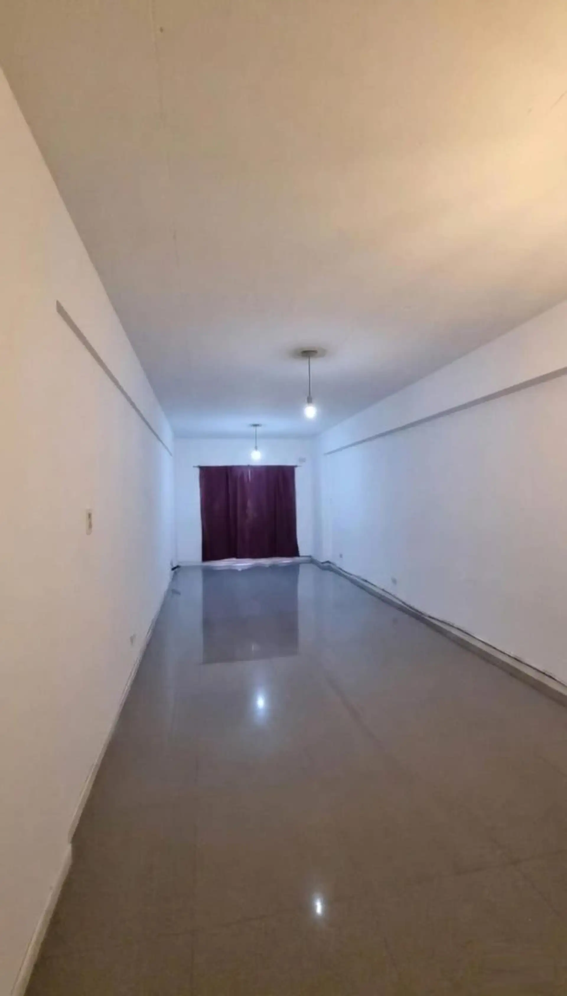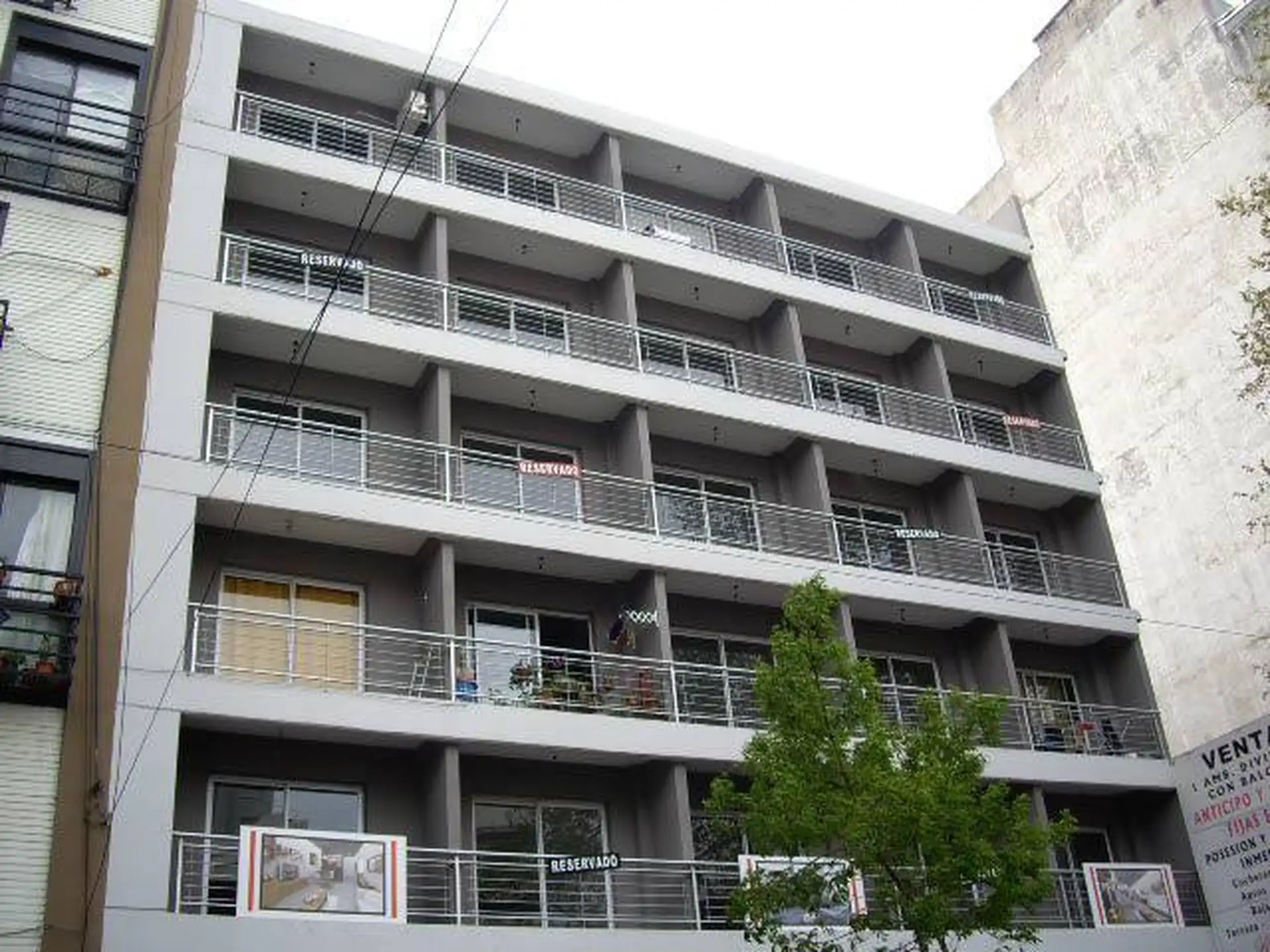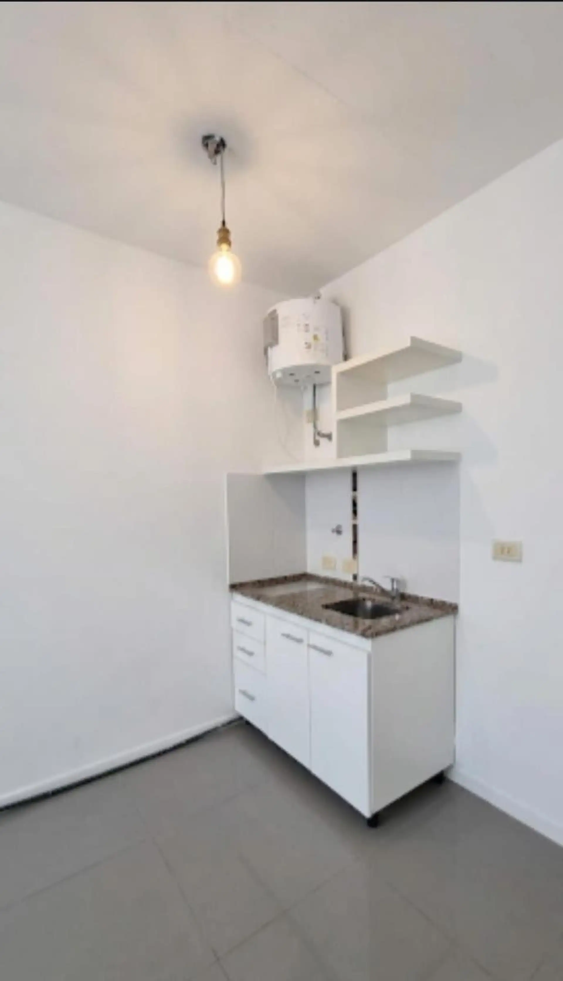 Квартира-студия в здании на Constitución, окна во двор (contrafrente). Площадь и этаж не указаны. Квартира без мебели; изображения носят иллюстративный характер. Внутри: основное помещение, интегрированная кухня и выход на балкон. Условия аренды: залог-страховка (caución) или гарантия собственника, по условиям объявления.
