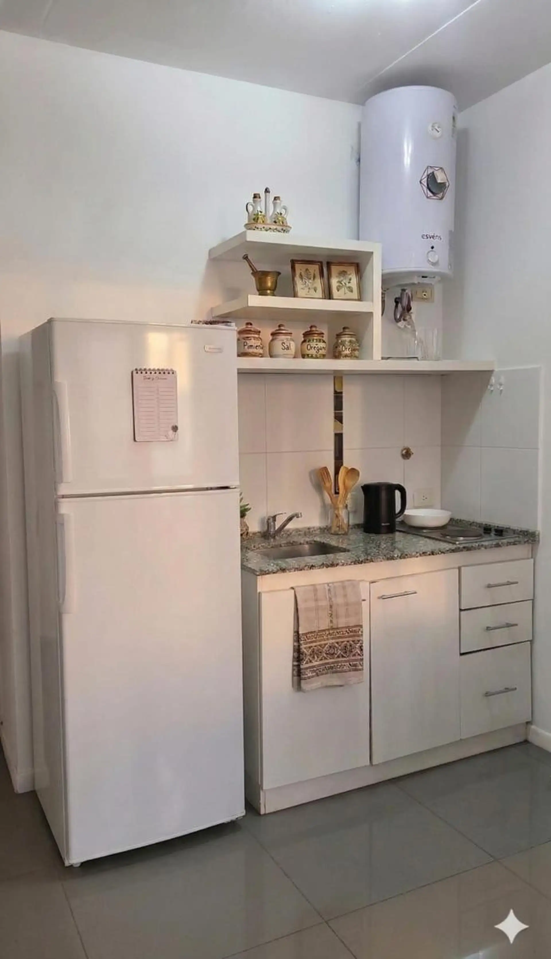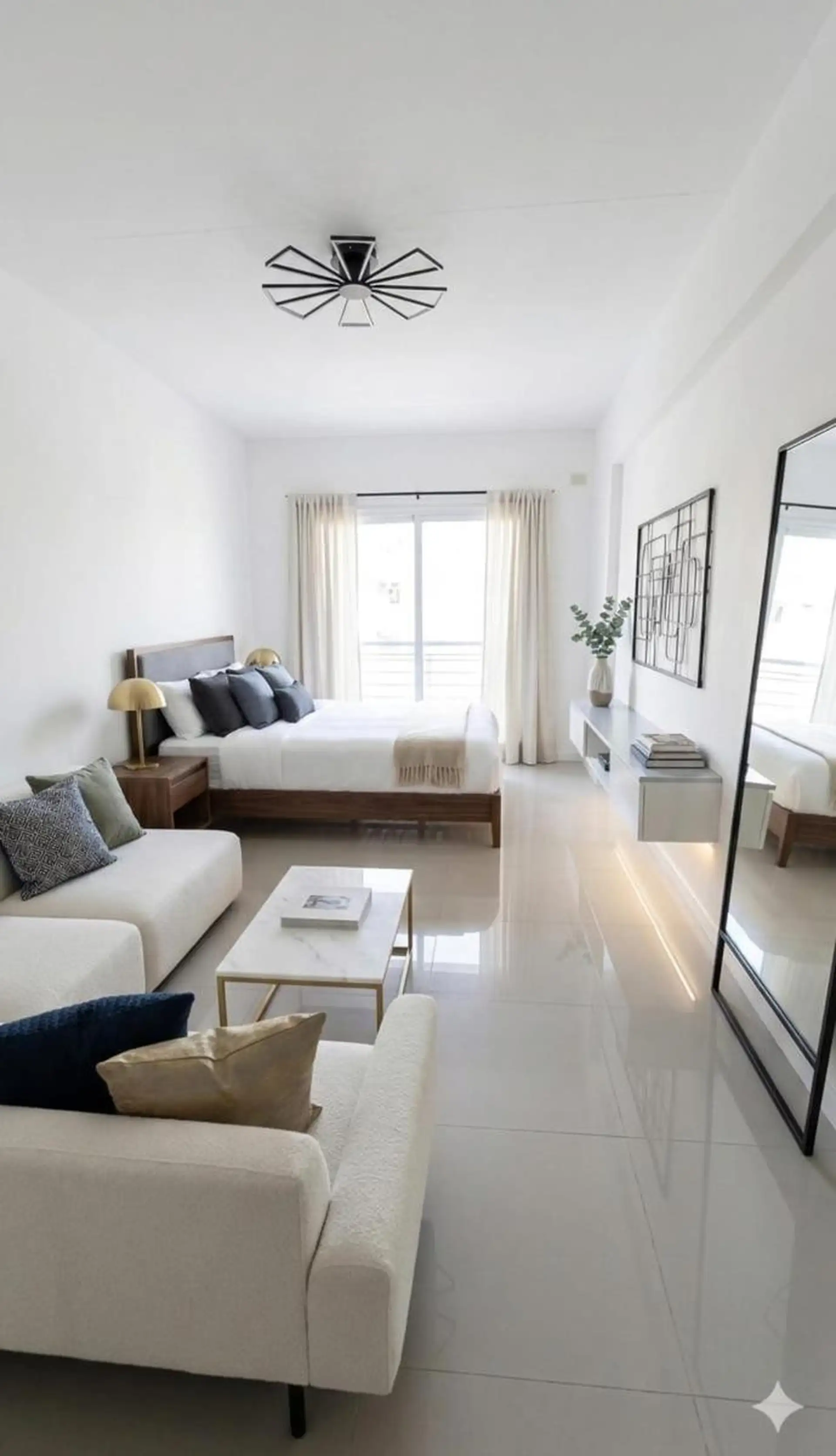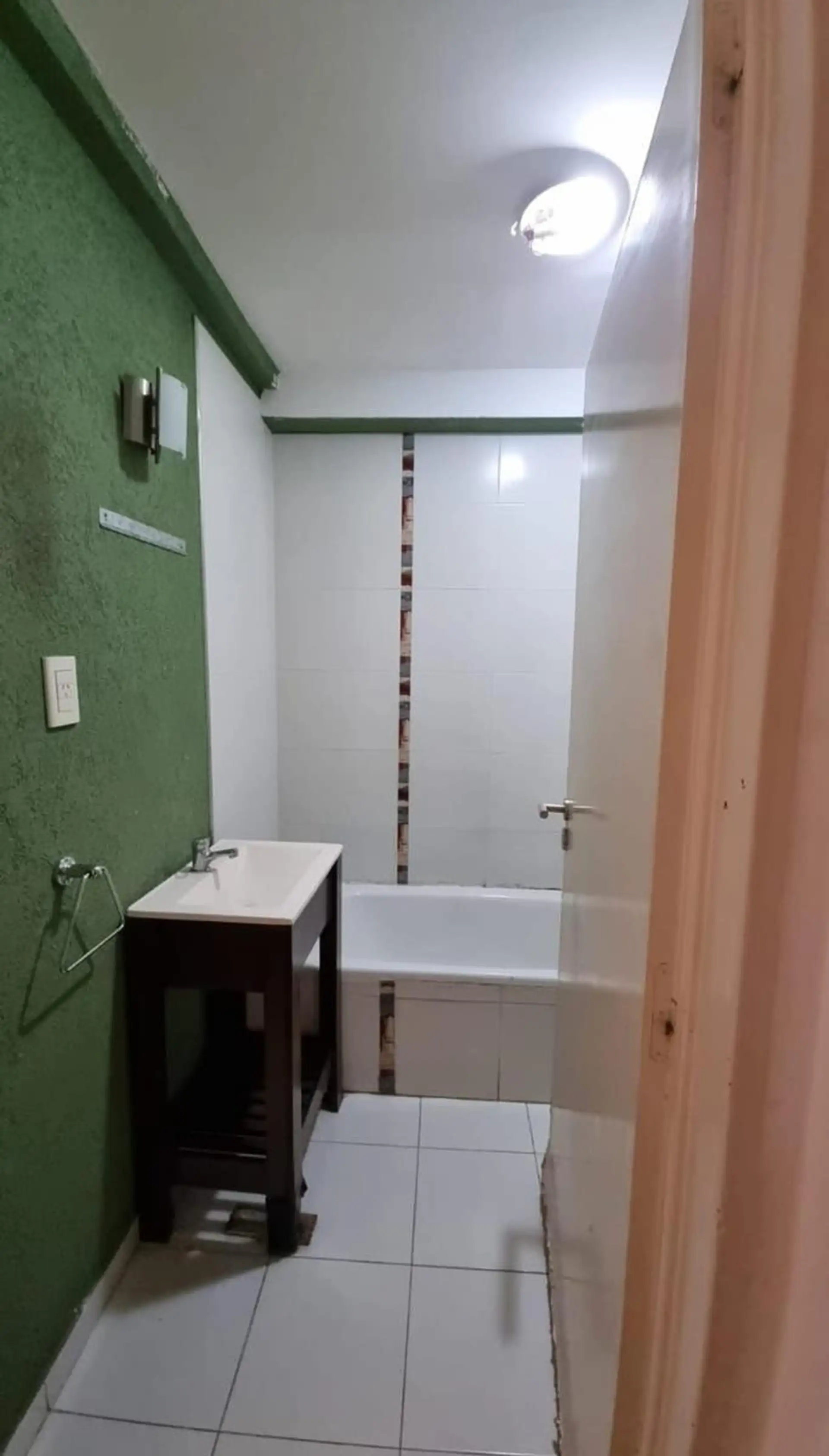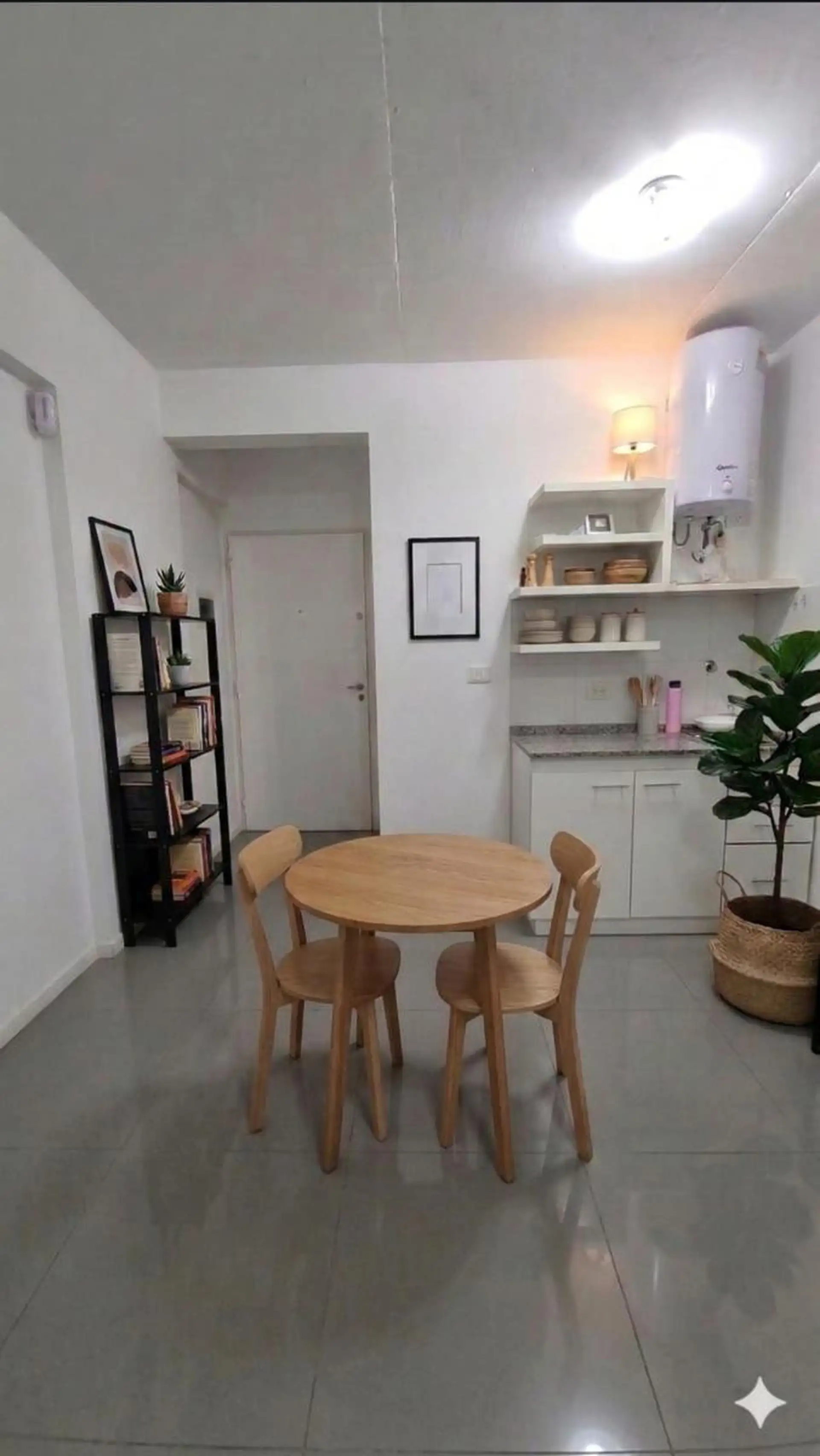 Квартира-студия в здании на Constitución, окна во двор (contrafrente). Площадь и этаж не указаны. Квартира без мебели; изображения носят иллюстративный характер. Внутри: основное помещение, интегрированная кухня и выход на балкон. Условия аренды: залог-страховка (caución) или гарантия собственника, по условиям объявления.