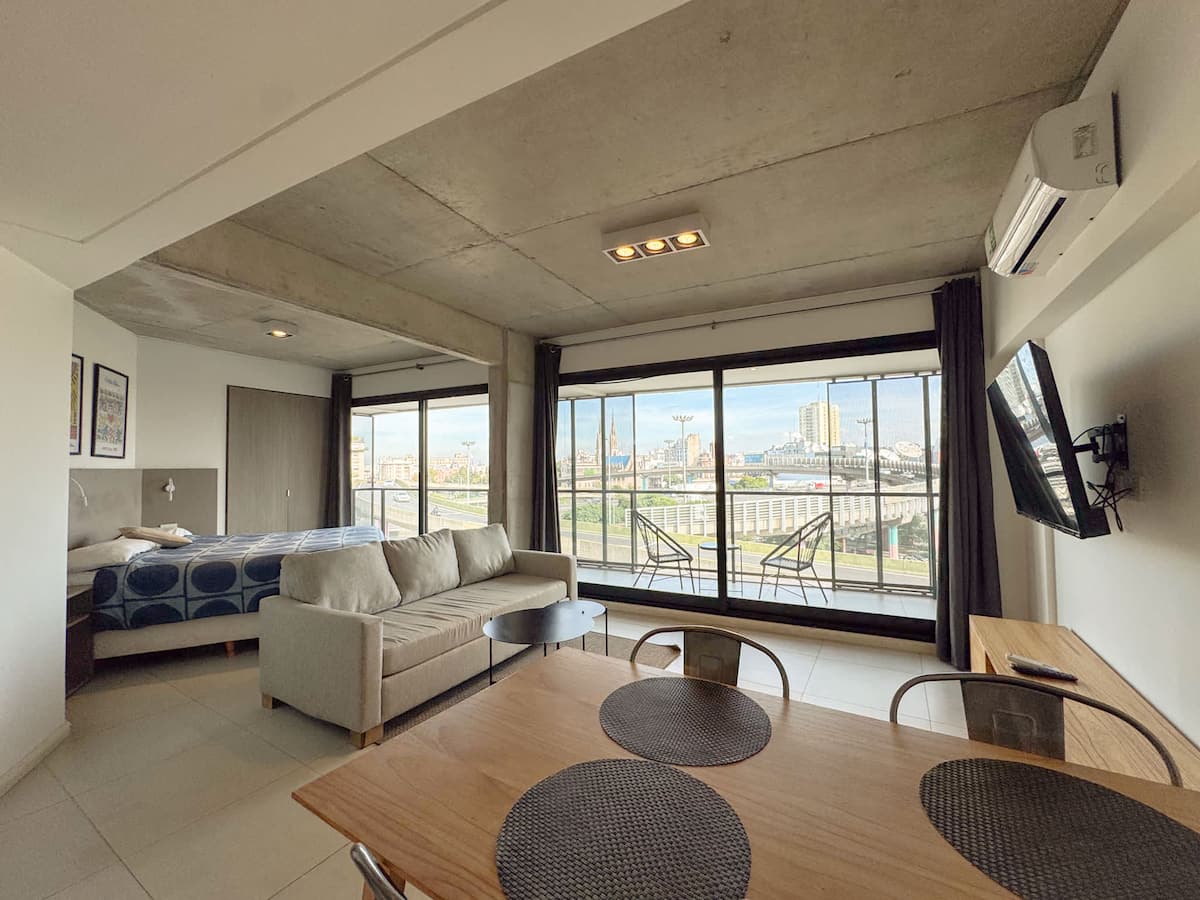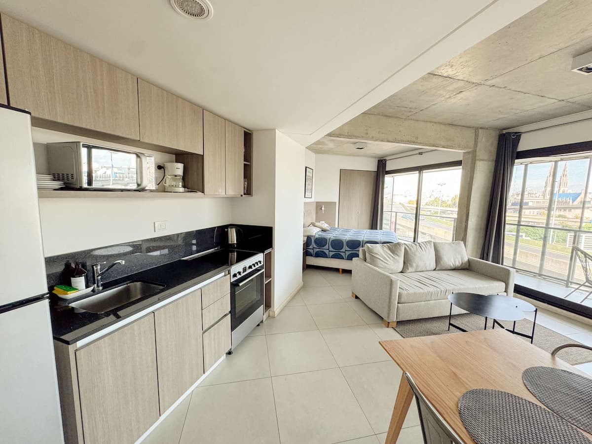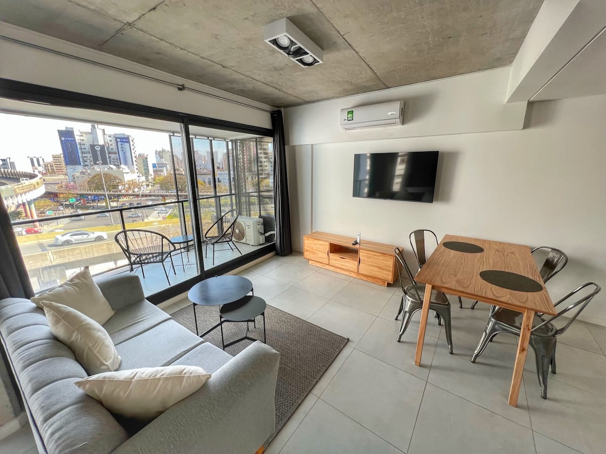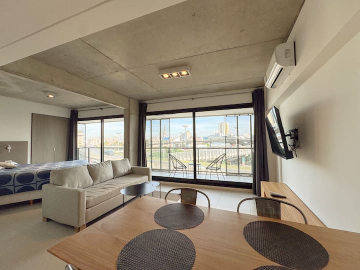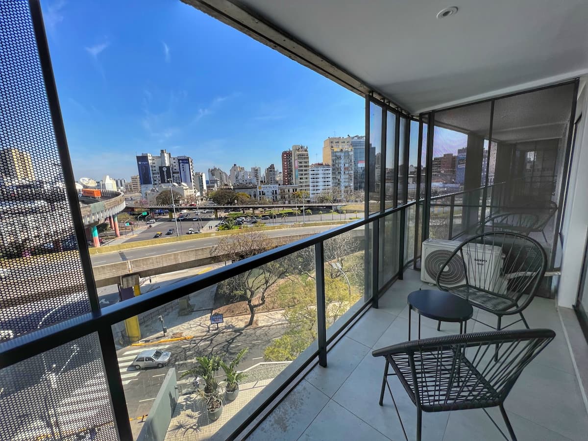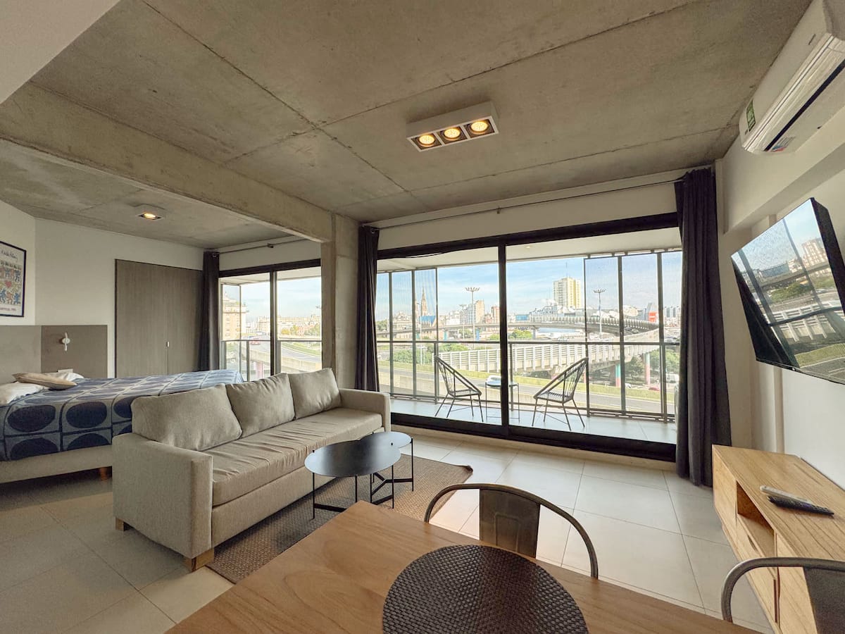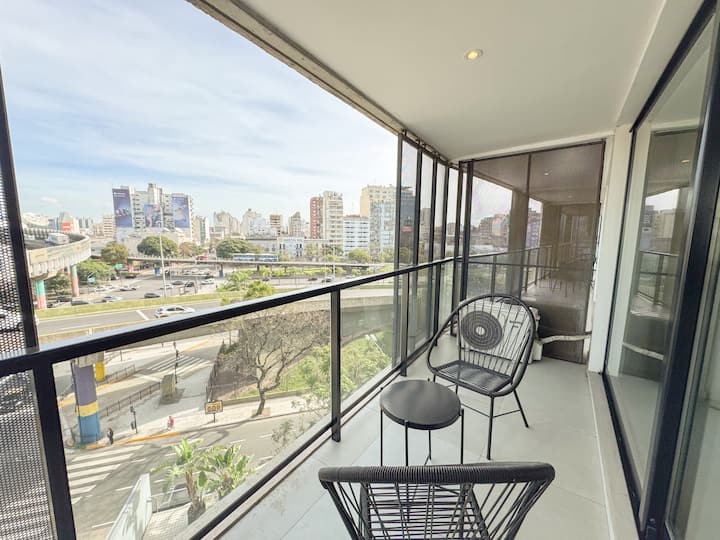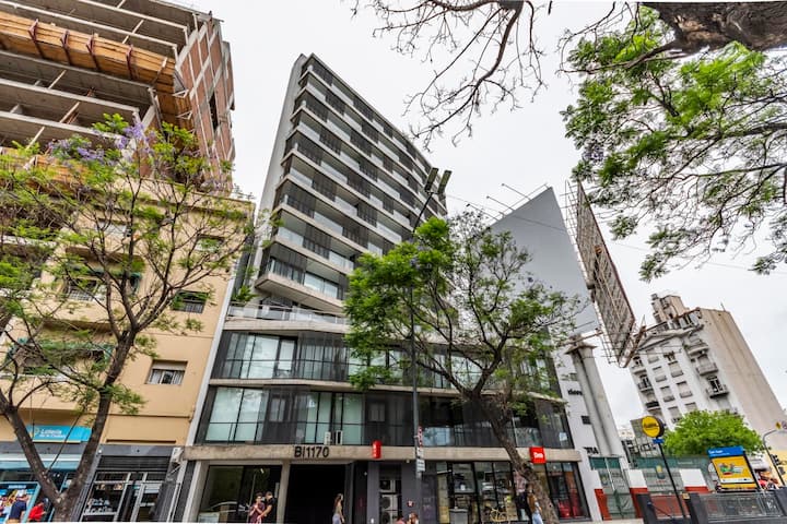 Квартира-лофт с 1 спальней и балконом на Av 9 de Julio, вид на Avenida 9 de Julio. Новая, кухня оборудована, в гостиной установлена smart TV. Предусмотрены кофеварка, электрический чайник, посуда; установлен электронный замок с кодом для входа в здание. В здании есть coworking и coliving на 3-м этаже с быстрым Wi‑Fi, душевыми, большими столами, зонами для йоги и общей террасой с видом.