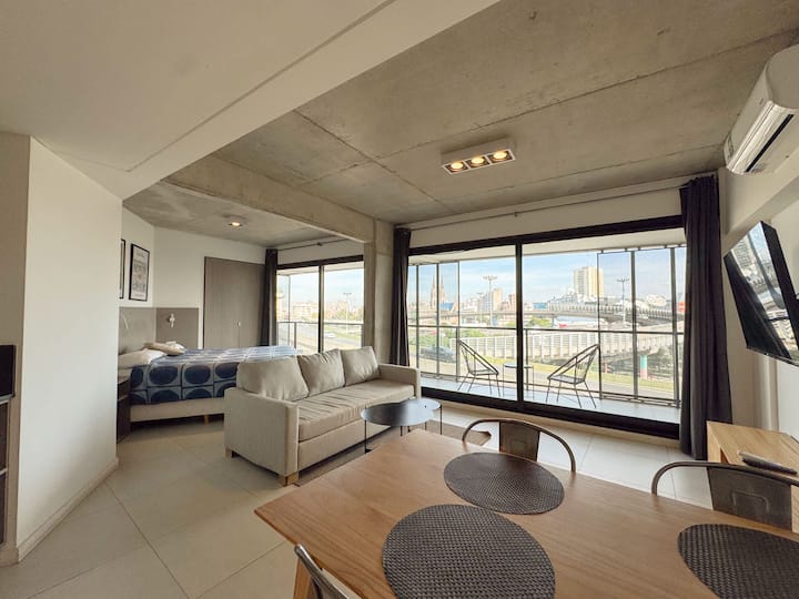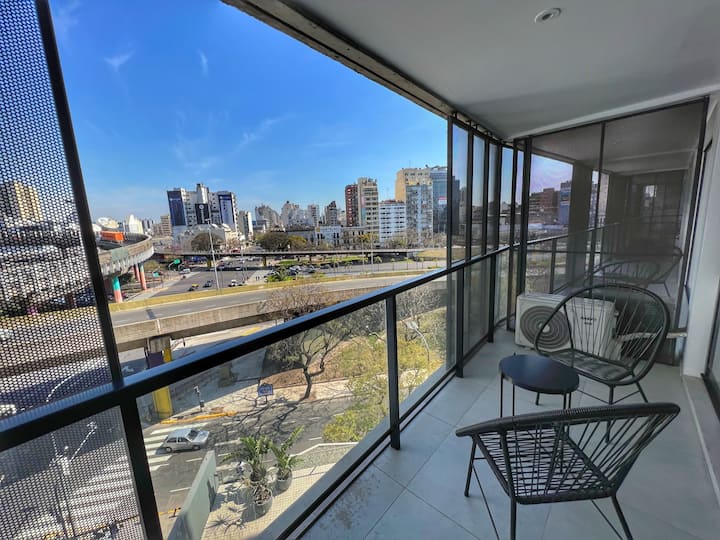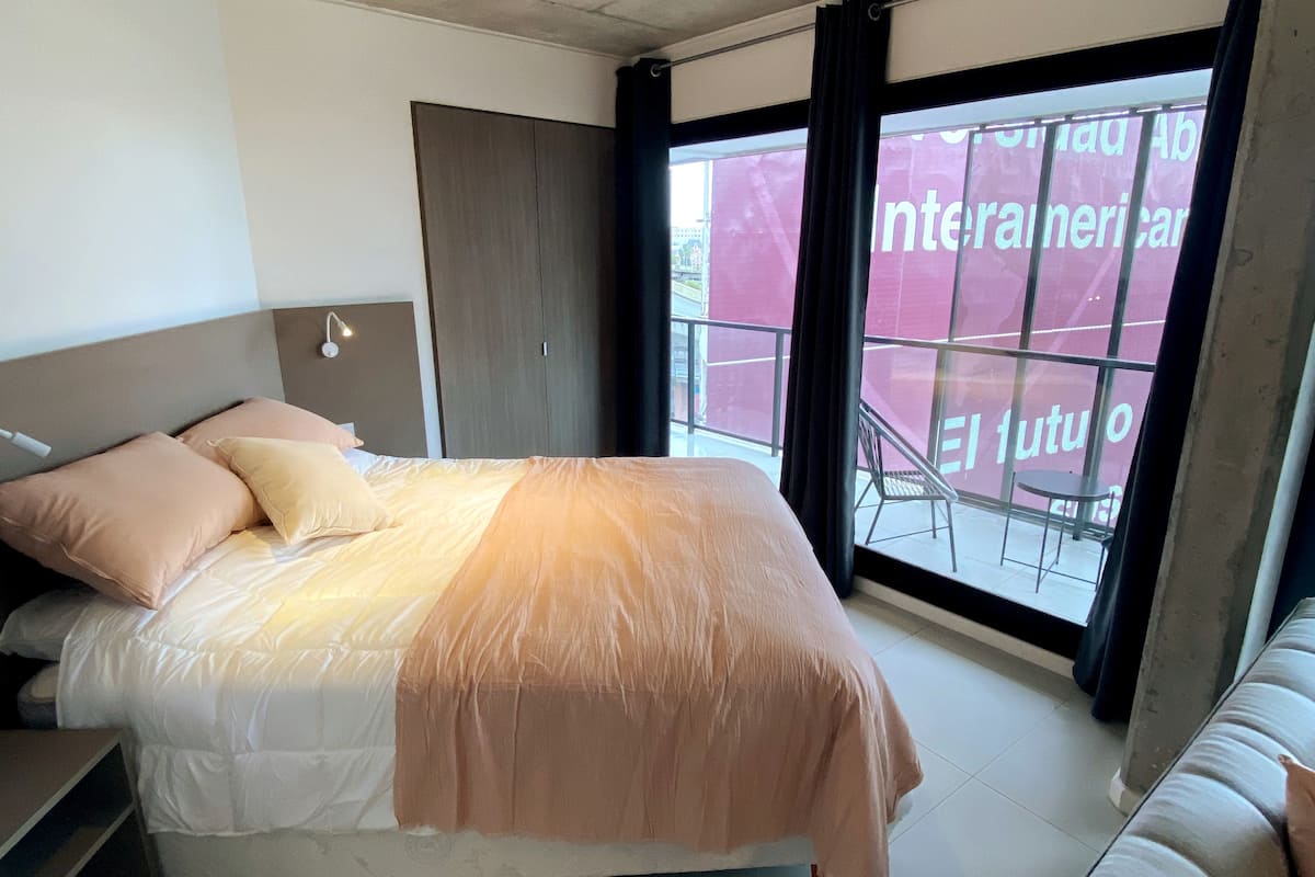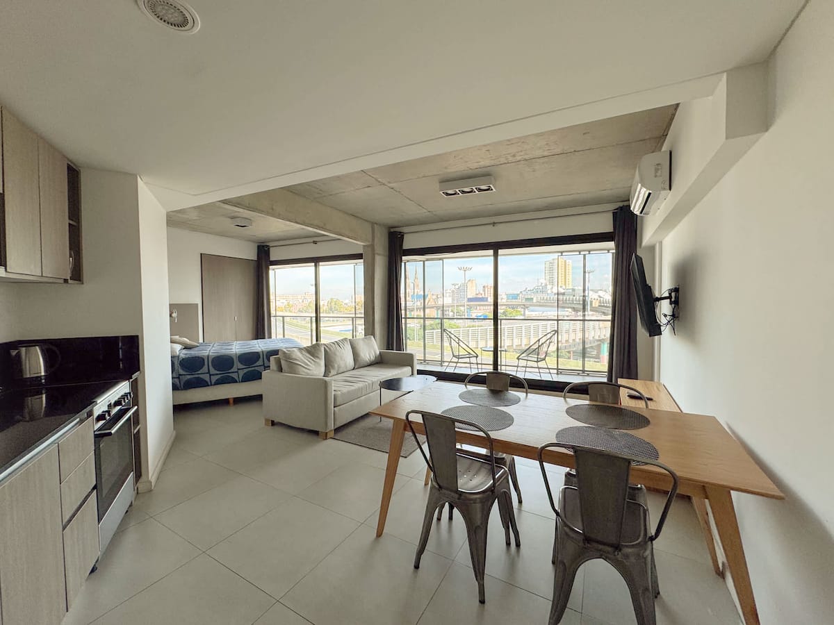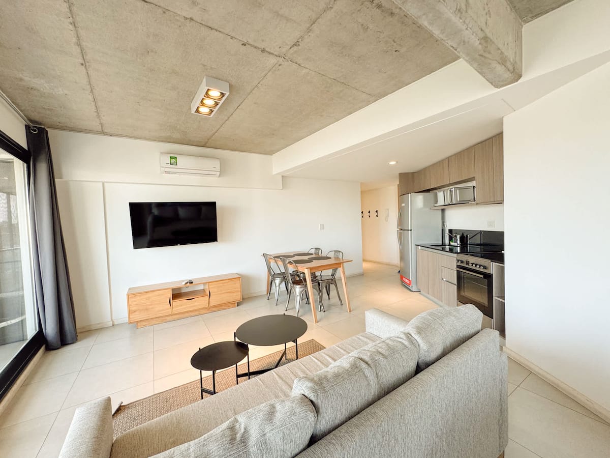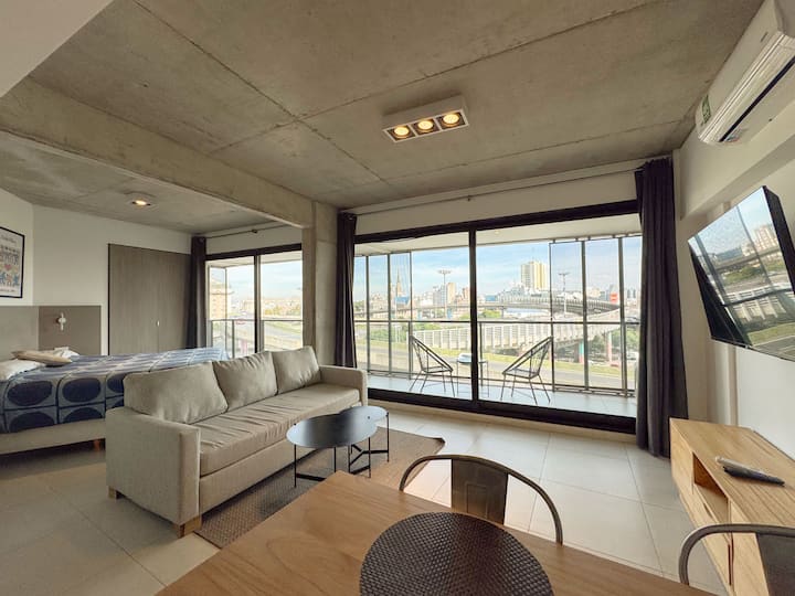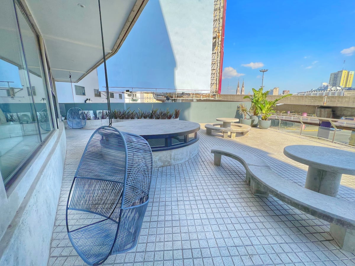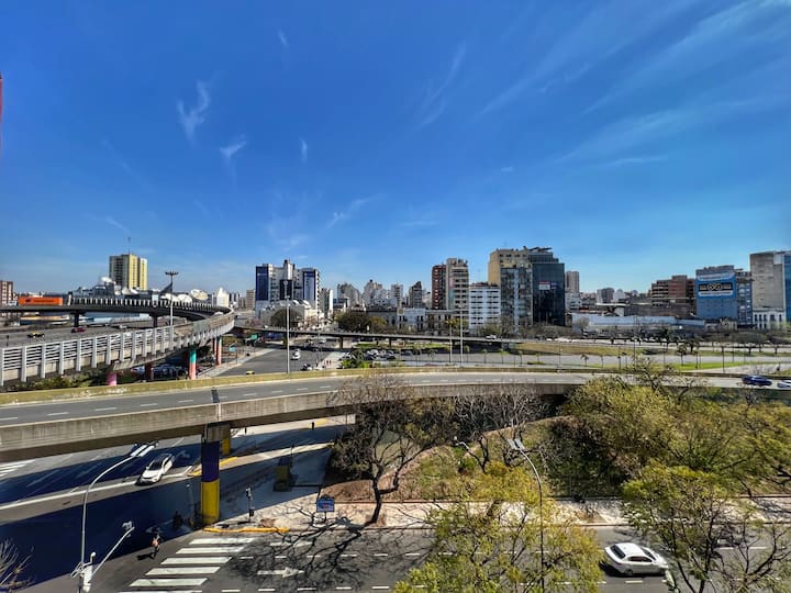Квартира-лофт с 1 спальней и балконом на Av 9 de Julio, вид на Avenida 9 de Julio. Новая, кухня оборудована, в гостиной установлена smart TV. Предусмотрены кофеварка, электрический чайник, посуда; установлен электронный замок с кодом для входа в здание. В здании есть coworking и coliving на 3-м этаже с быстрым Wi‑Fi, душевыми, большими столами, зонами для йоги и общей террасой с видом.