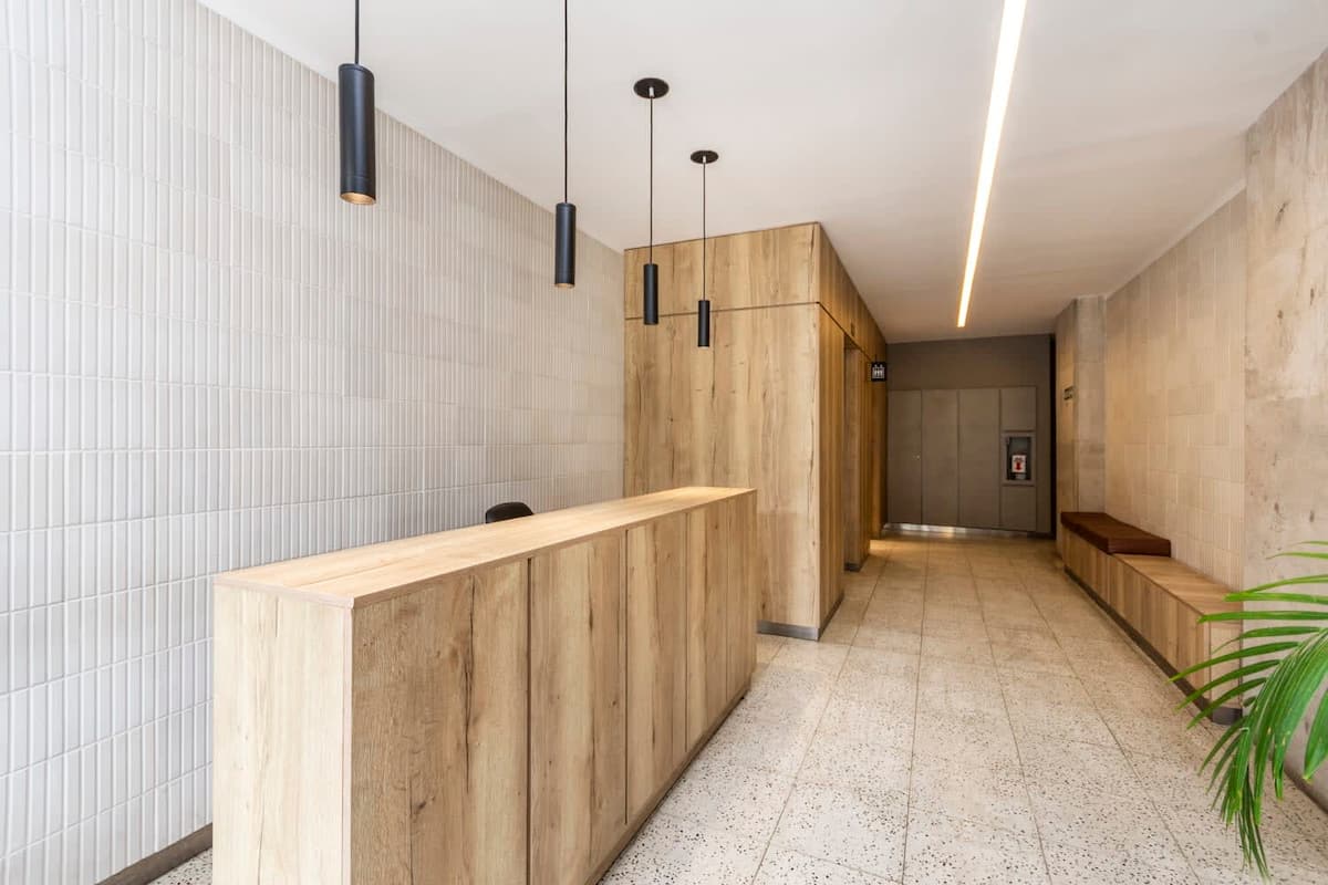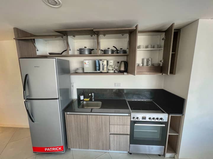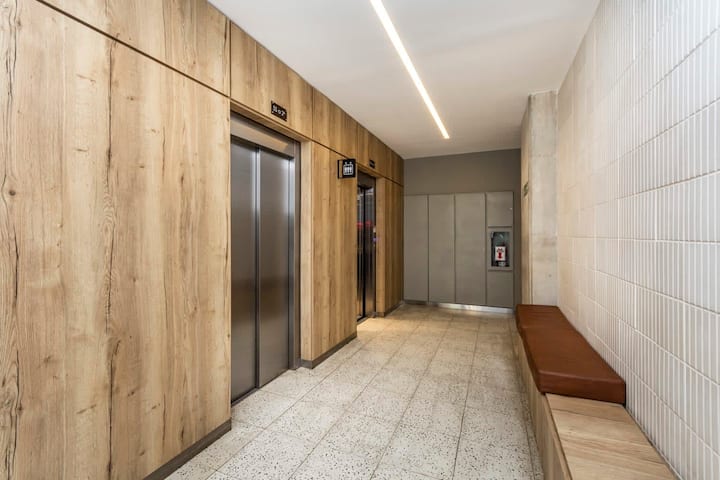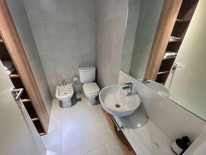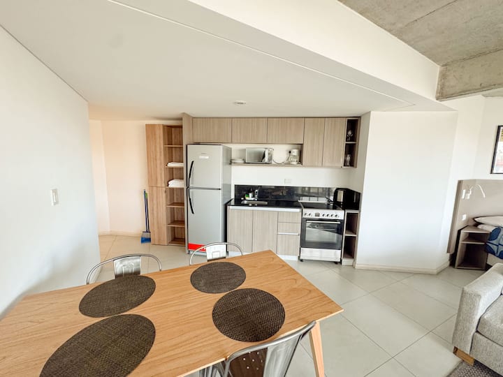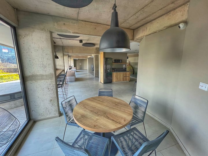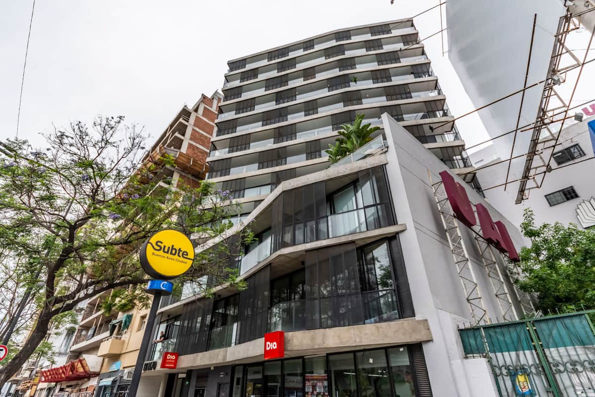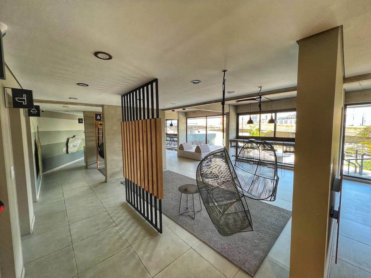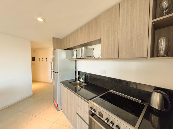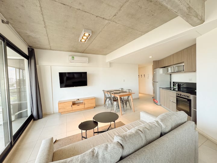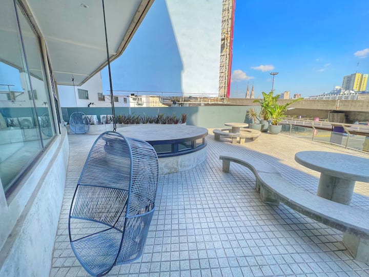 Квартира-лофт с 1 спальней и балконом на Av 9 de Julio, вид на Avenida 9 de Julio. Новая, кухня оборудована, в гостиной установлена smart TV. Предусмотрены кофеварка, электрический чайник, посуда; установлен электронный замок с кодом для входа в здание. В здании есть coworking и coliving на 3-м этаже с быстрым Wi‑Fi, душевыми, большими столами, зонами для йоги и общей террасой с видом.