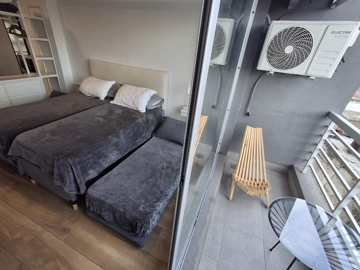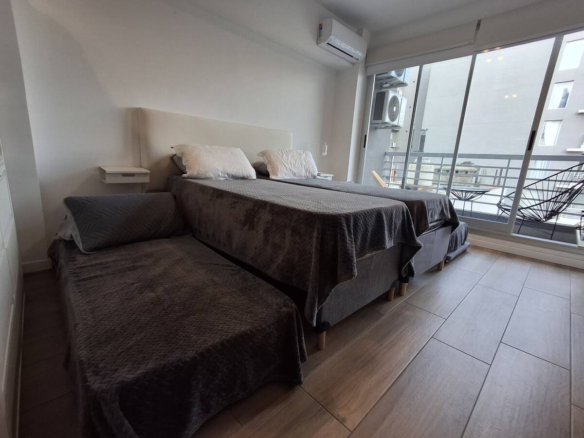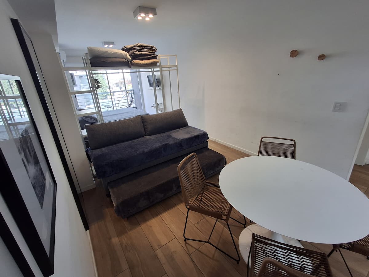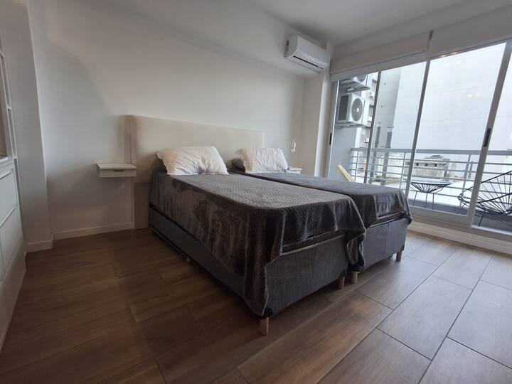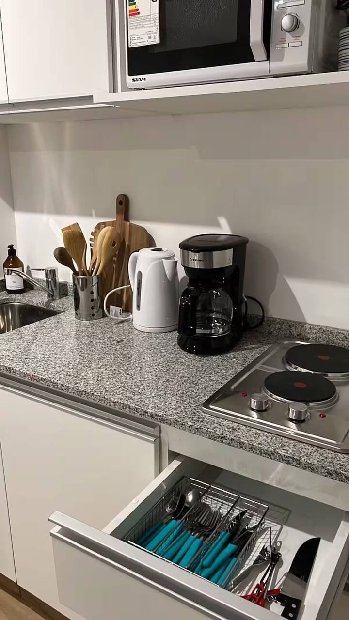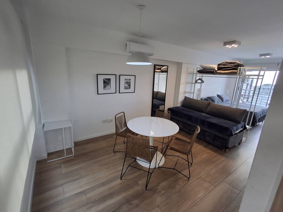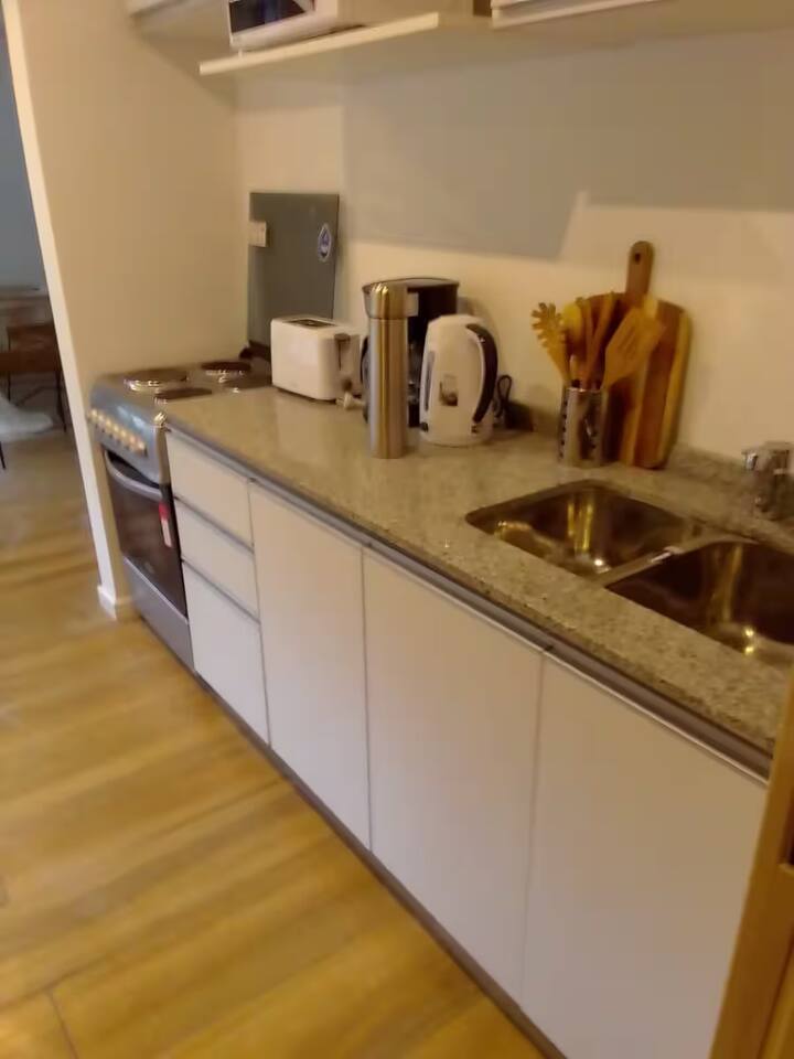 Апартаменты с 1 спальней в Constitución, в новом комплексе (ввод в июне 2023), 4-й этаж. Квартира предназначена для размещения до 6 человек. В здании заявлены гриль, бассейн, прачечная, спортзал и коворкинг, однако на момент размещения их использование не включено. В гостиной-столовой есть обеденный стол на 4 человека, Smart TV и WiFi 300MB. Кухня оснащена холодильником, плитой, тостером, кофемашиной, микроволновой печью и электрической духовкой, а также блендером.