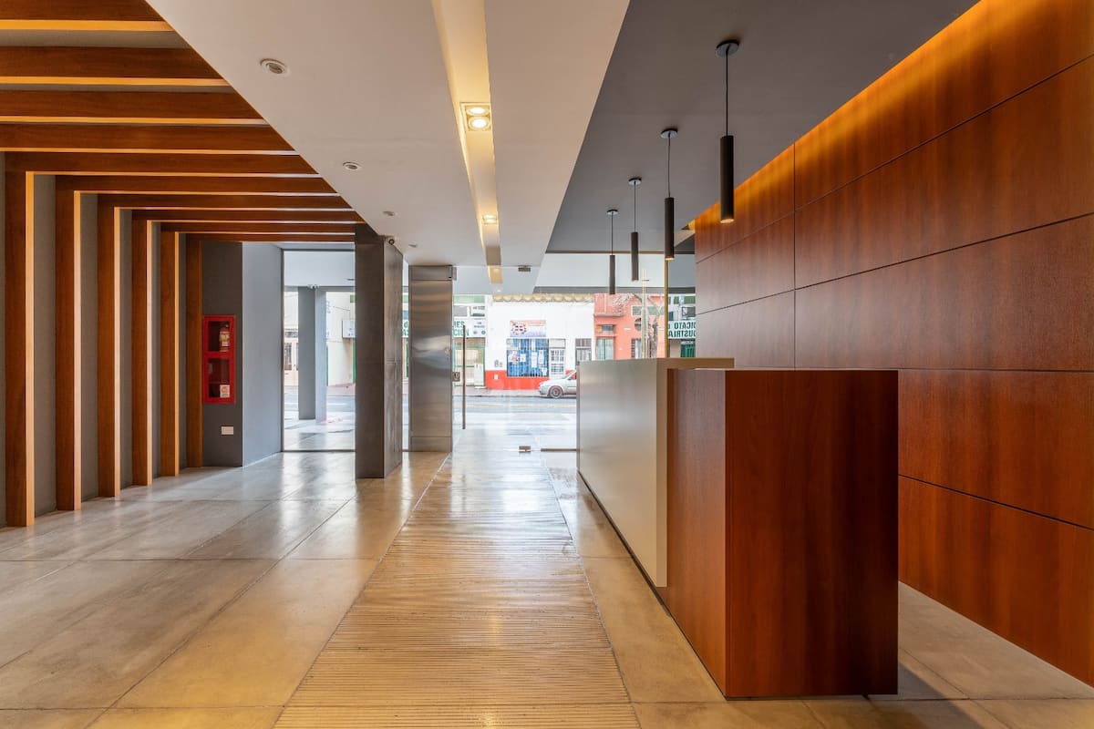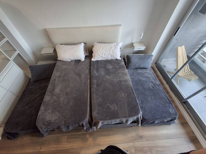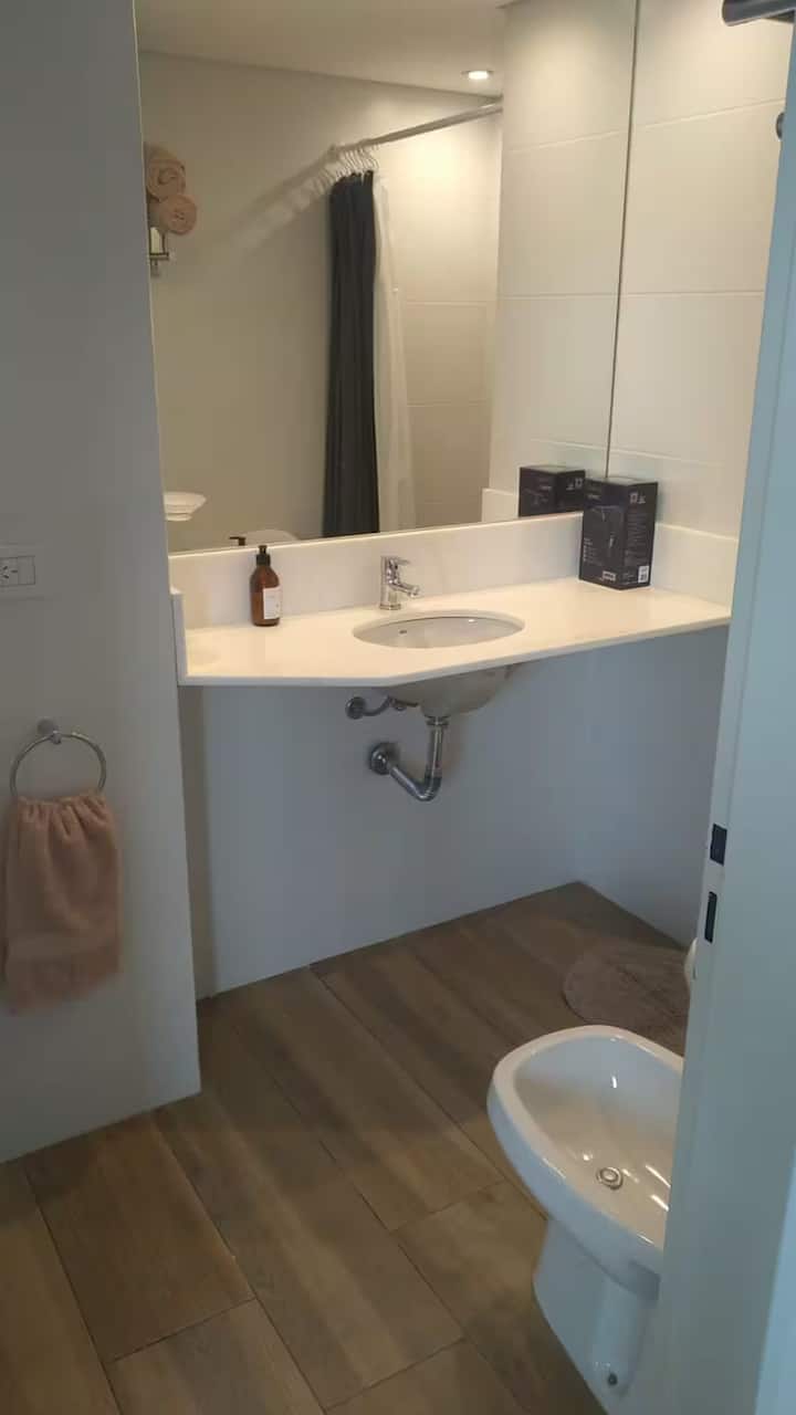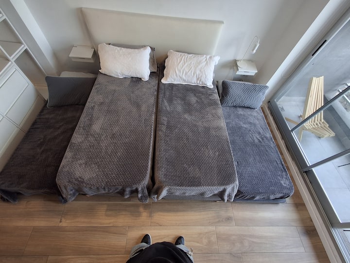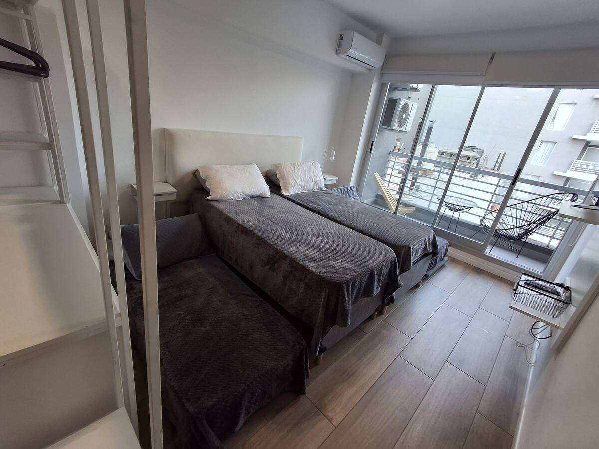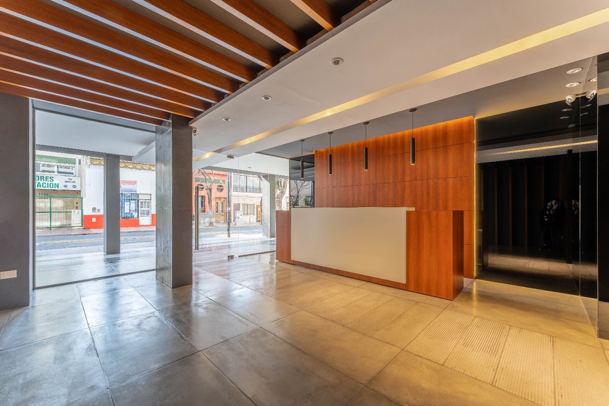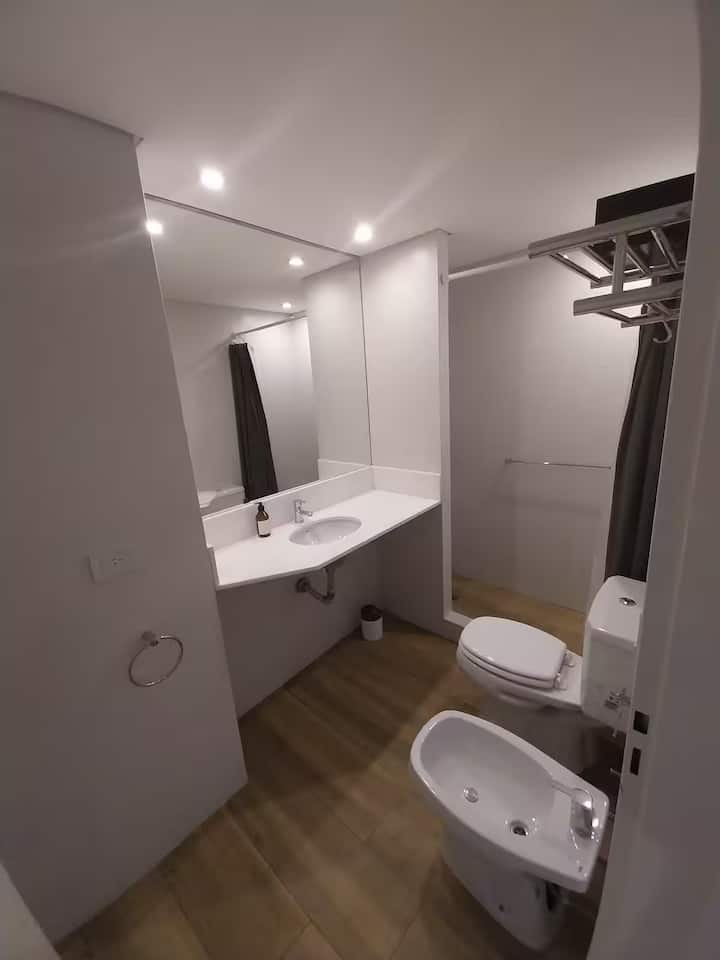 Апартаменты с 1 спальней в Constitución, в новом комплексе (ввод в июне 2023), 4-й этаж. Квартира предназначена для размещения до 6 человек. В здании заявлены гриль, бассейн, прачечная, спортзал и коворкинг, однако на момент размещения их использование не включено. В гостиной-столовой есть обеденный стол на 4 человека, Smart TV и WiFi 300MB. Кухня оснащена холодильником, плитой, тостером, кофемашиной, микроволновой печью и электрической духовкой, а также блендером.