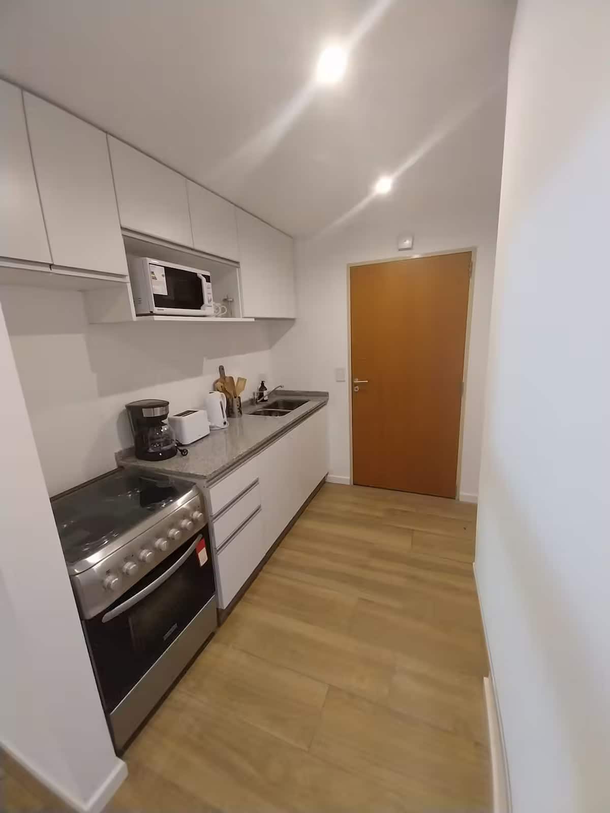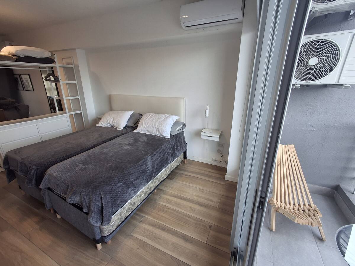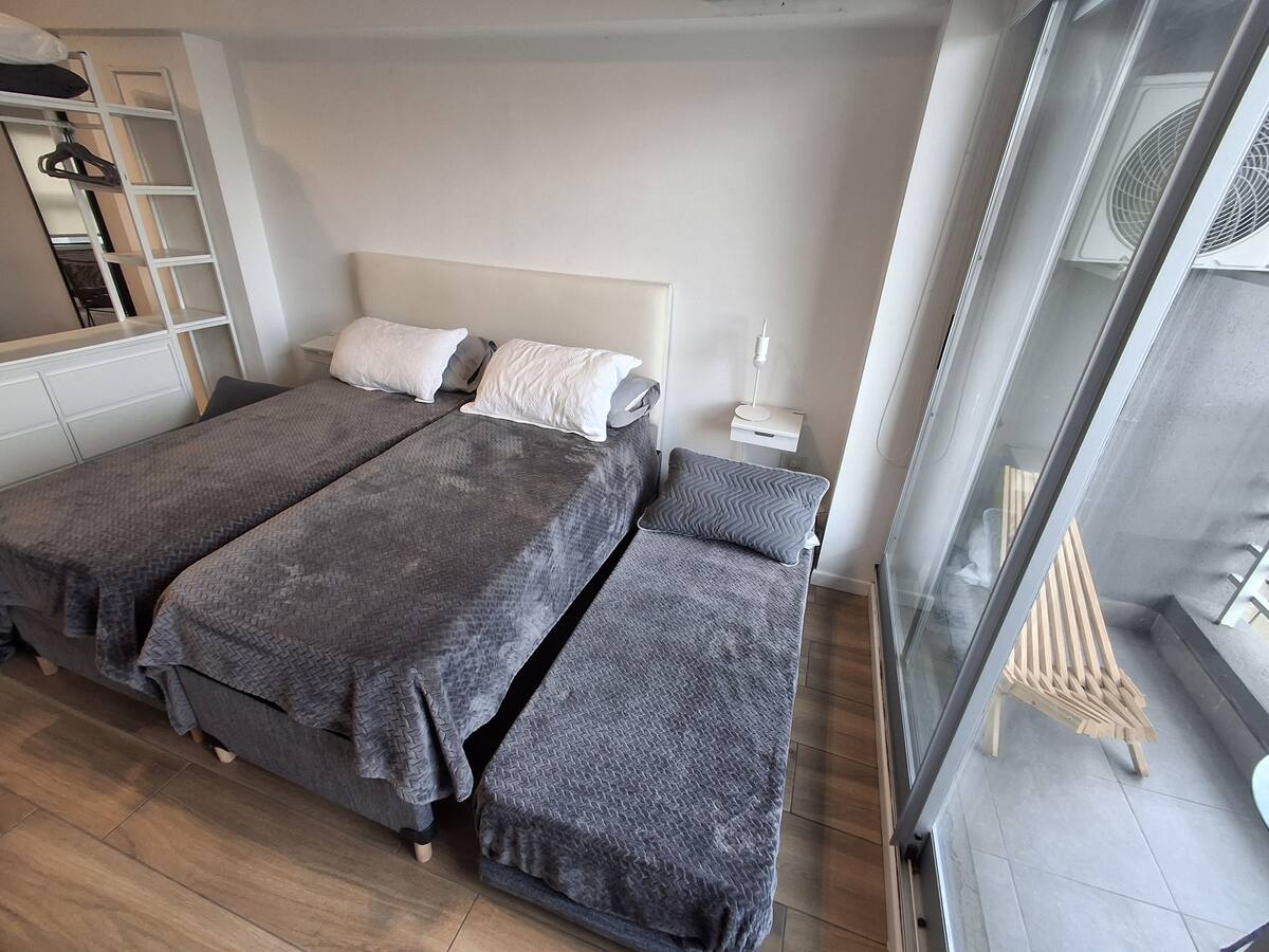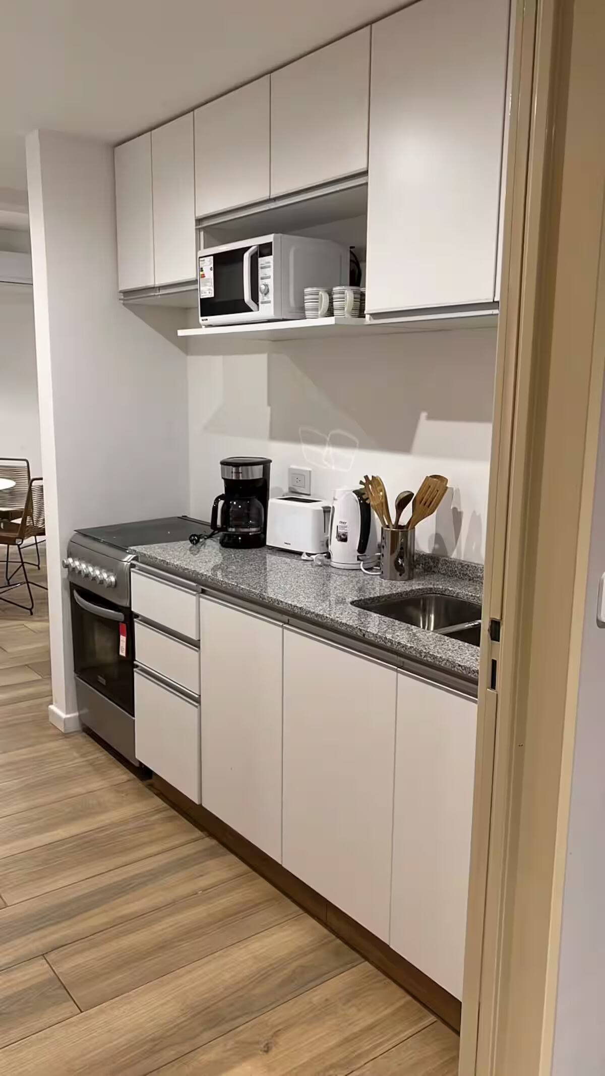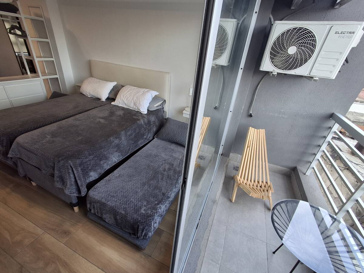 Апартаменты с 1 спальней в Constitución, в новом комплексе (ввод в июне 2023), 4-й этаж. Квартира предназначена для размещения до 6 человек. В здании заявлены гриль, бассейн, прачечная, спортзал и коворкинг, однако на момент размещения их использование не включено. В гостиной-столовой есть обеденный стол на 4 человека, Smart TV и WiFi 300MB. Кухня оснащена холодильником, плитой, тостером, кофемашиной, микроволновой печью и электрической духовкой, а также блендером.