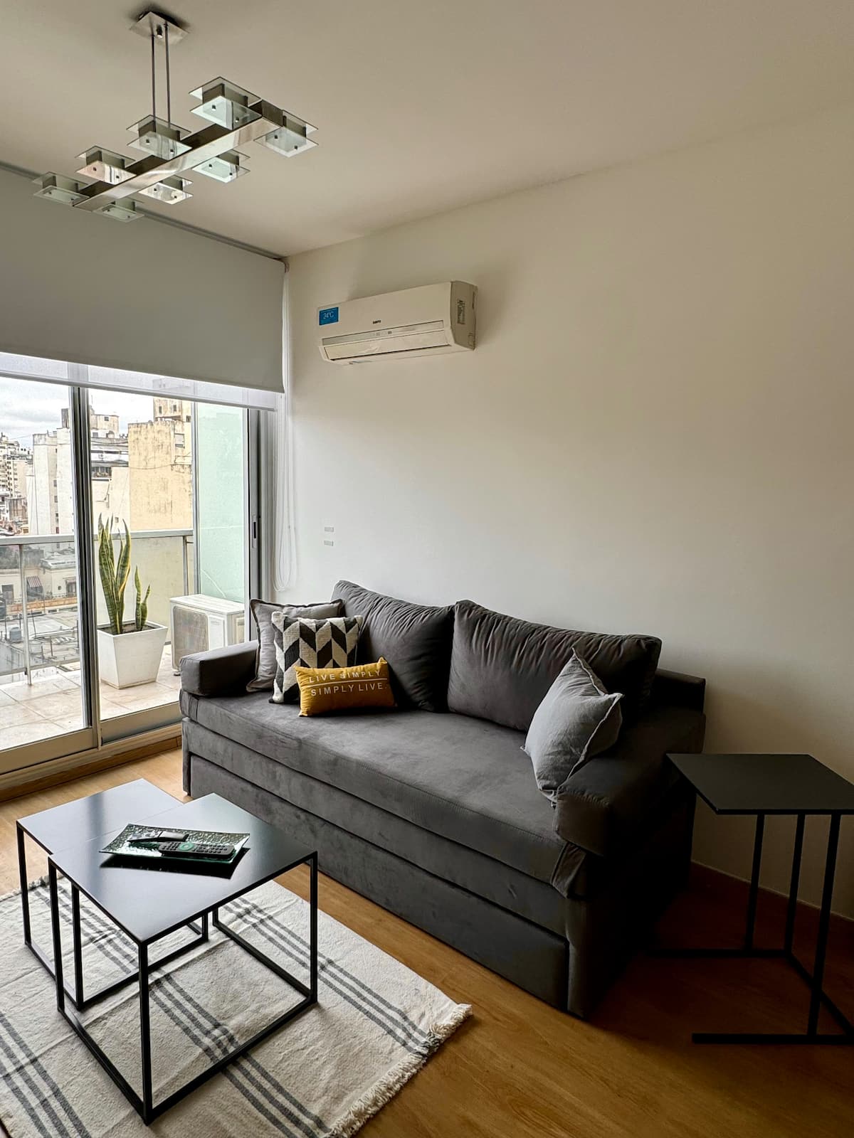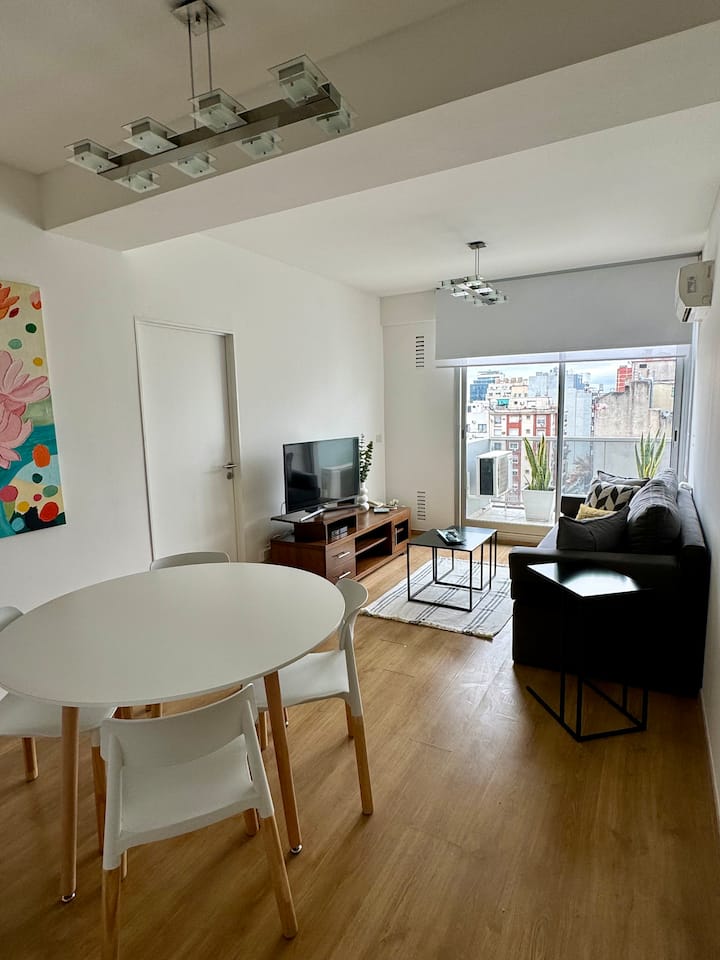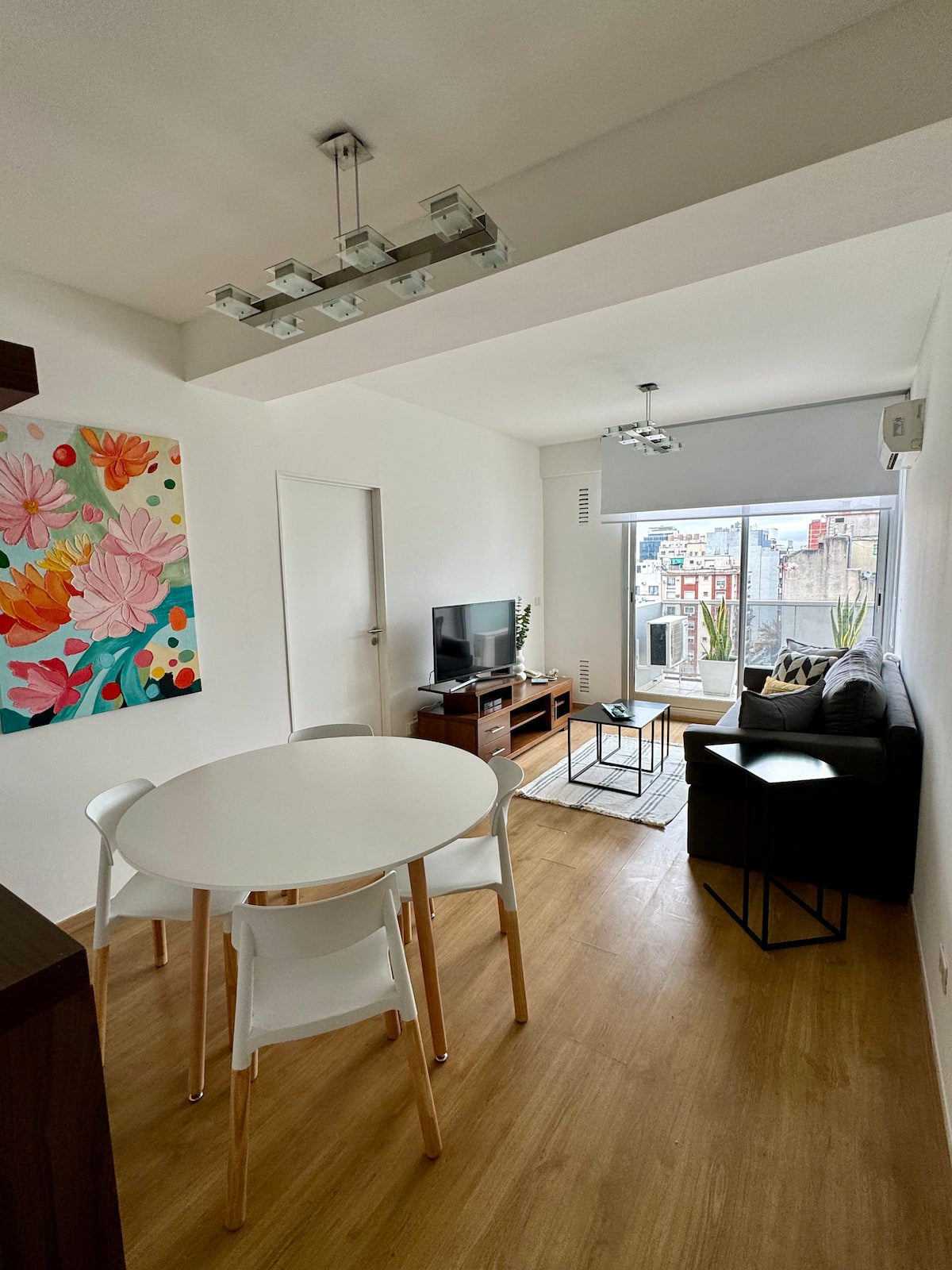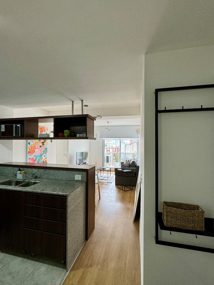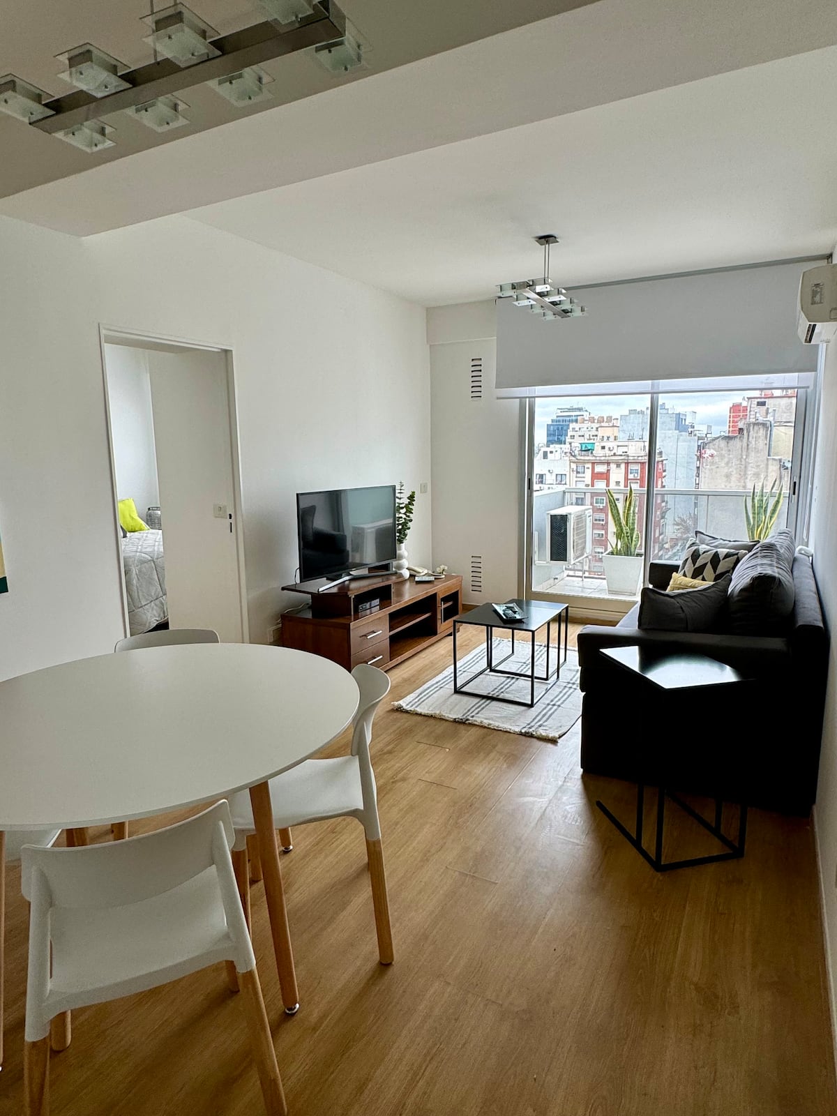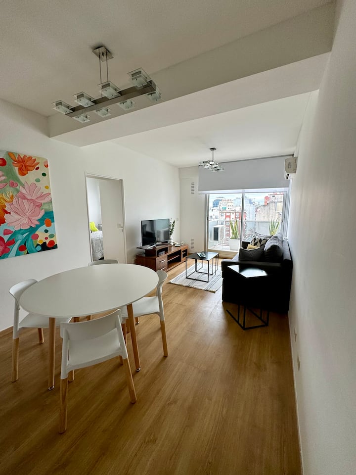 Квартира с двумя комнатами в Constitución. Спальня с ванной комнатой и большим встроенным шкафом, гостиная, отдельный туалет. Кухня интегрированная: холодильник с морозильной камерой, газовая варочная панель и электрическая духовка, микроволновая печь, кофемашина, электрический чайник, полный набор посуды. В квартире есть кондиционирование с 2 установками, кабельное телевидение и Wi‑Fi; балкон выходит на Av Independencia с видом на Av 9 de Julio. В здании предусмотрены прачечная, бассейн и зона