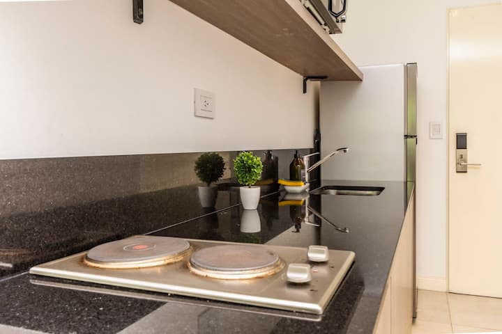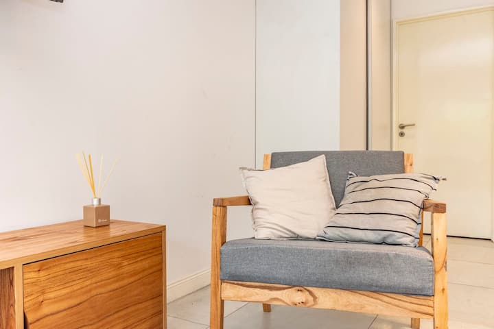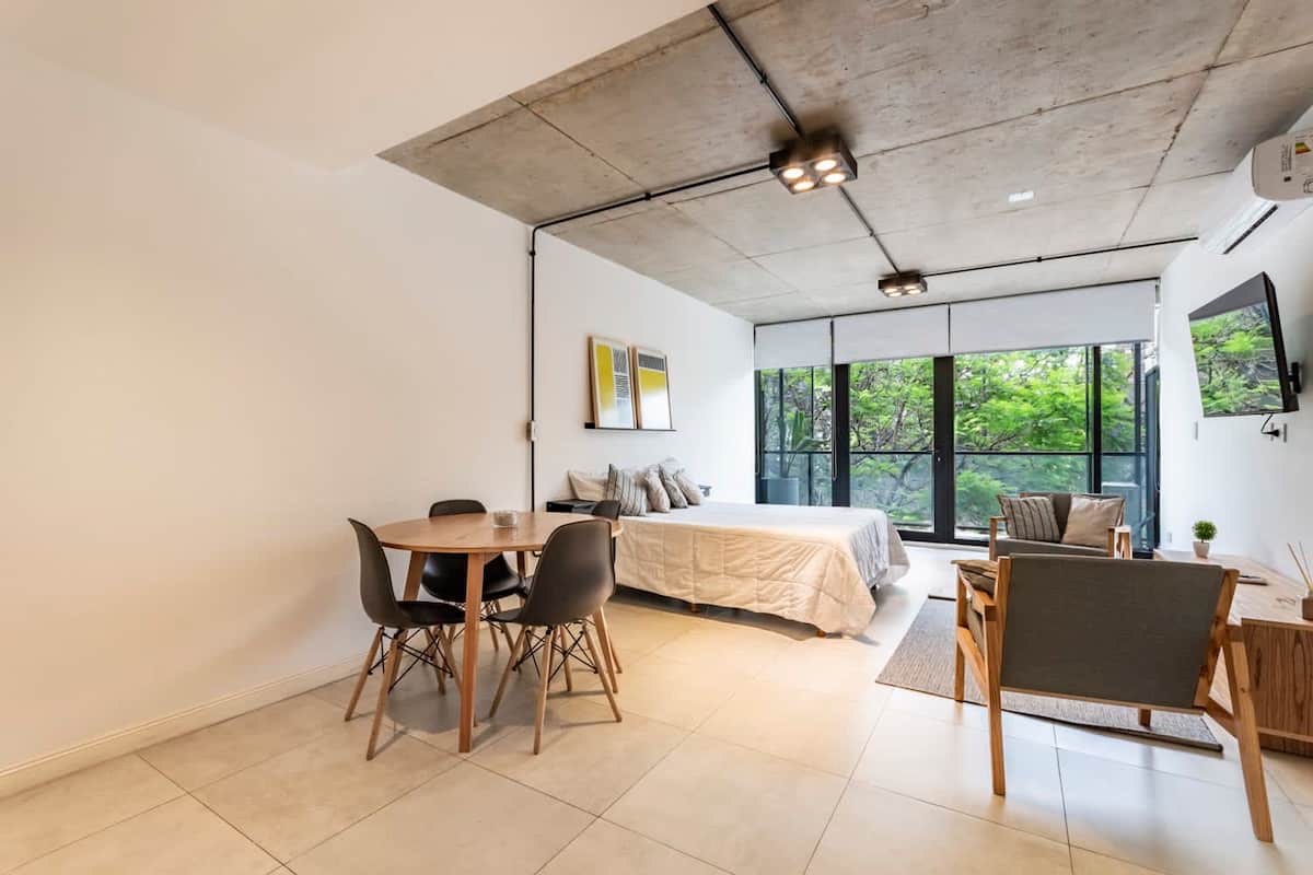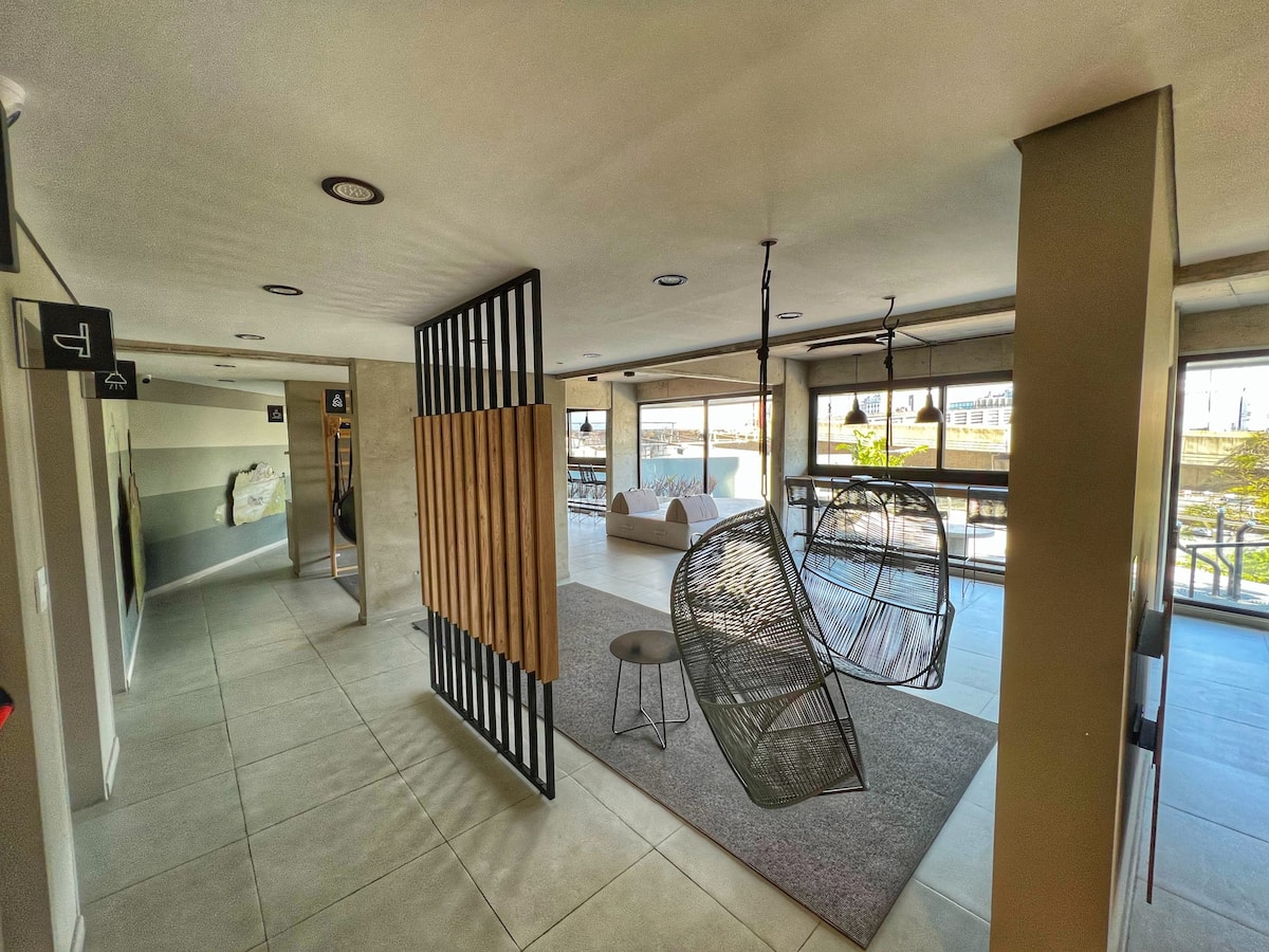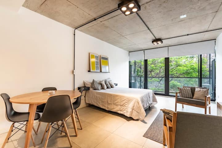 Новая квартира-лофт в Constitución, в 5 минутах от Puerto Madero. Кухня полностью оборудована, в квартире есть гостиная. Установлены кофеварка, электрический чайник и Smart TV; телевизор работает через подключение телефона, кабельное ТВ не предусмотрено. В здании на 3-м этаже есть общая рабочая зона и зона для встреч с быстрым Wi‑Fi. Доступ в здание осуществляется по ключу из сейфа, вход в квартиру — электронным замком с кодом. В указанной локации окна выходят в сторону станции San Juan линии C