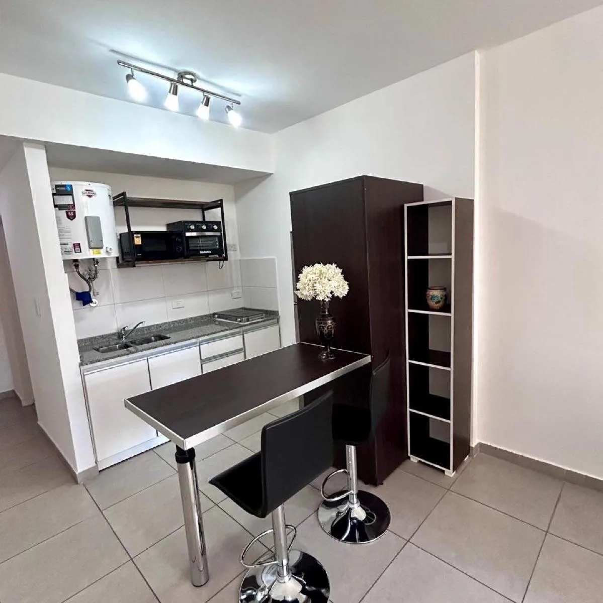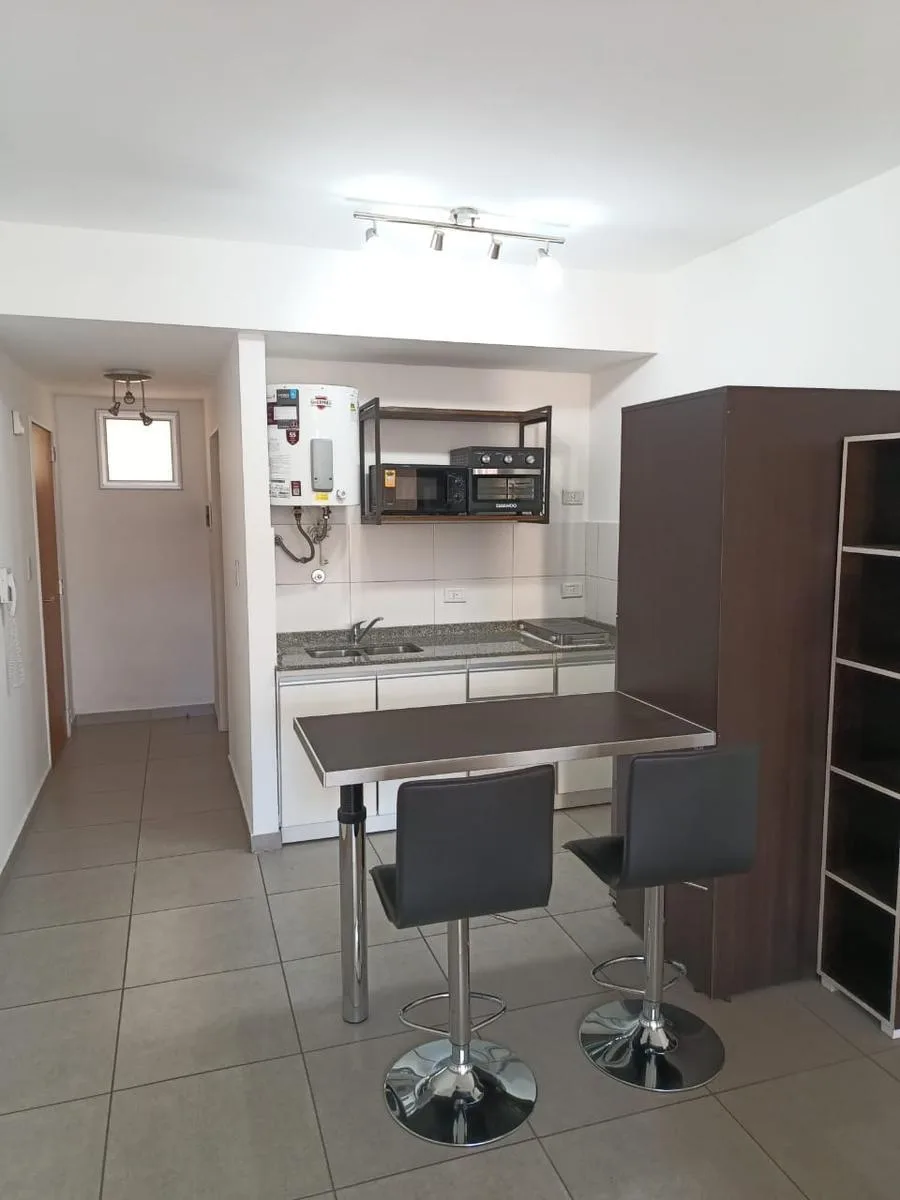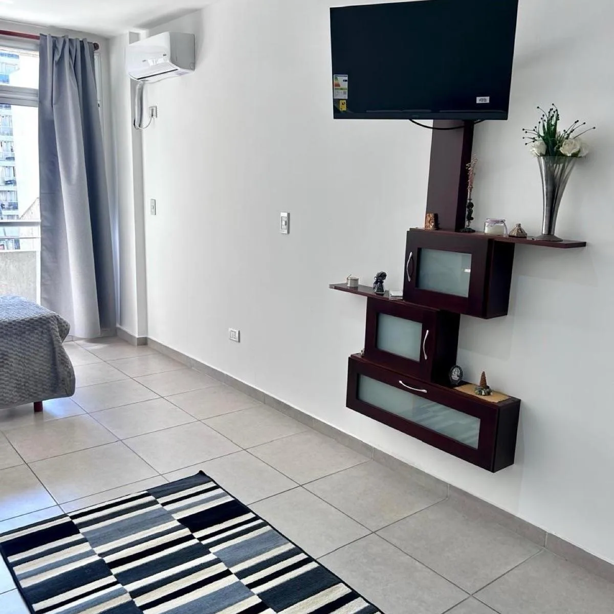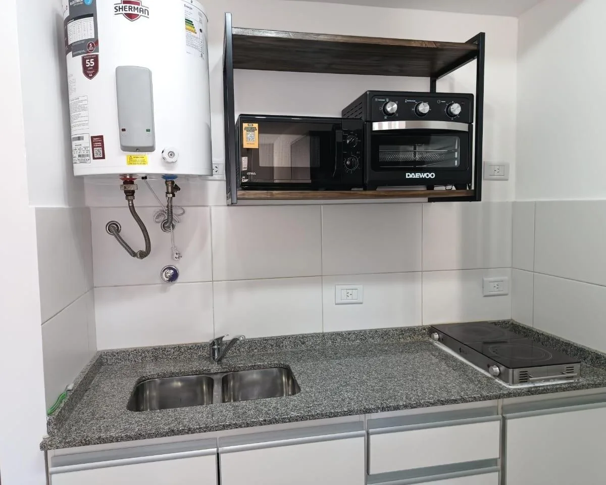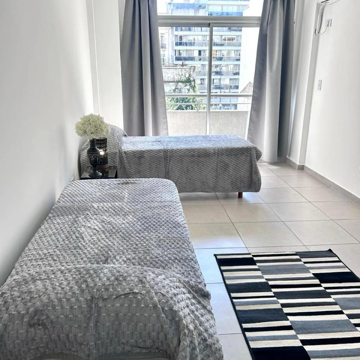 Квартира-студия с мебелью площадью 1 комната на 3-м этаже, окна во двор (contrafrente), с открытым видом и хорошим естественным освещением. Двухместный спальный участок организован двумя односпальными кроватями, которые могут объединяться, есть шкаф (placard). В студии есть кондиционер холод/тепло, 32-дюймовый smart TV, балкон временного типа, а также кухня с холодильником с морозильной камерой, микроволновой печью, электрической духовкой с встроенным airfryer и электрическим бойлером. В ванной
