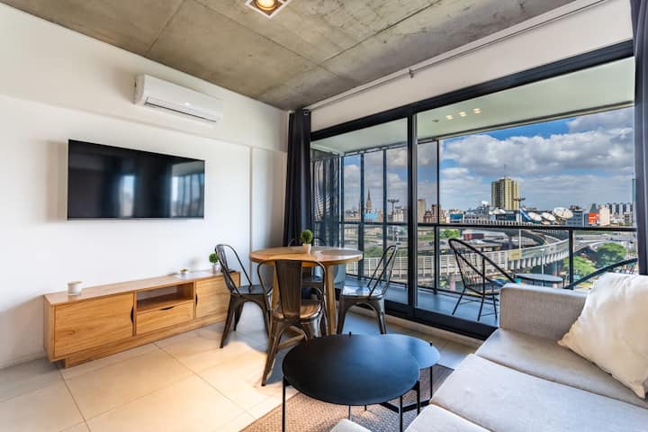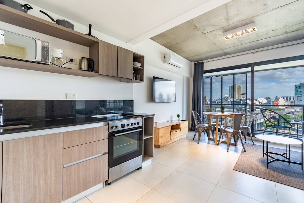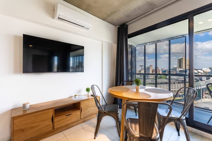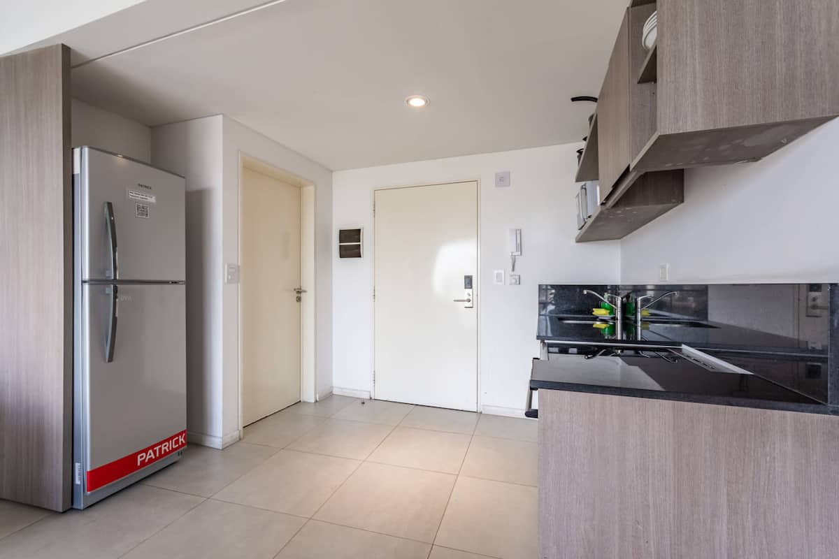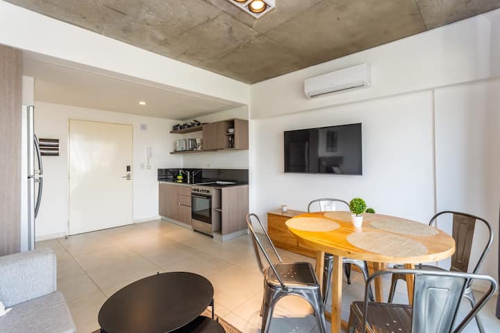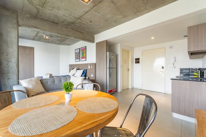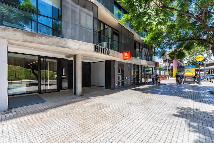 Лофт в Constitución в новом доме, окна и большая терраса-балкон. Гостиная с оборудованной кухней, предусмотрена мебель с выбором кроватей: king-size или 2 односпальные. В квартире есть бытовая техника и электрооборудование, в том числе кофеварка, смарт TV, электрочайник, посуда. Вход в здание осуществляется по коду через электронный замок. На 3-м этаже дома предусмотрены пространство coworking и coliving с Wi‑Fi, душевыми, большими столами и зонами для йоги, а также общая терраса с видом на Av.