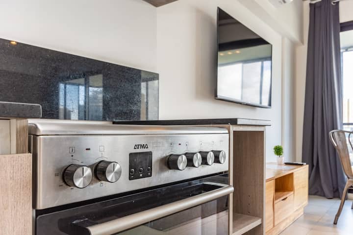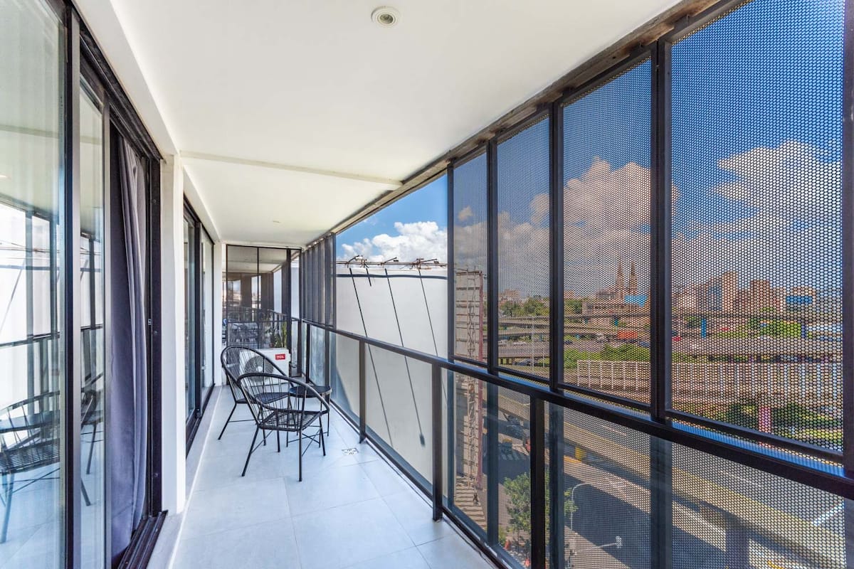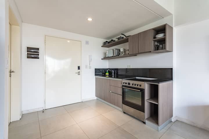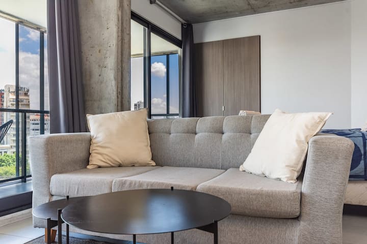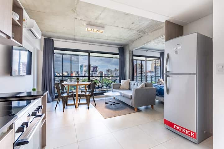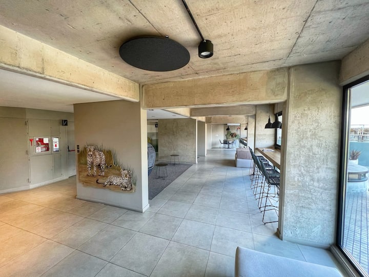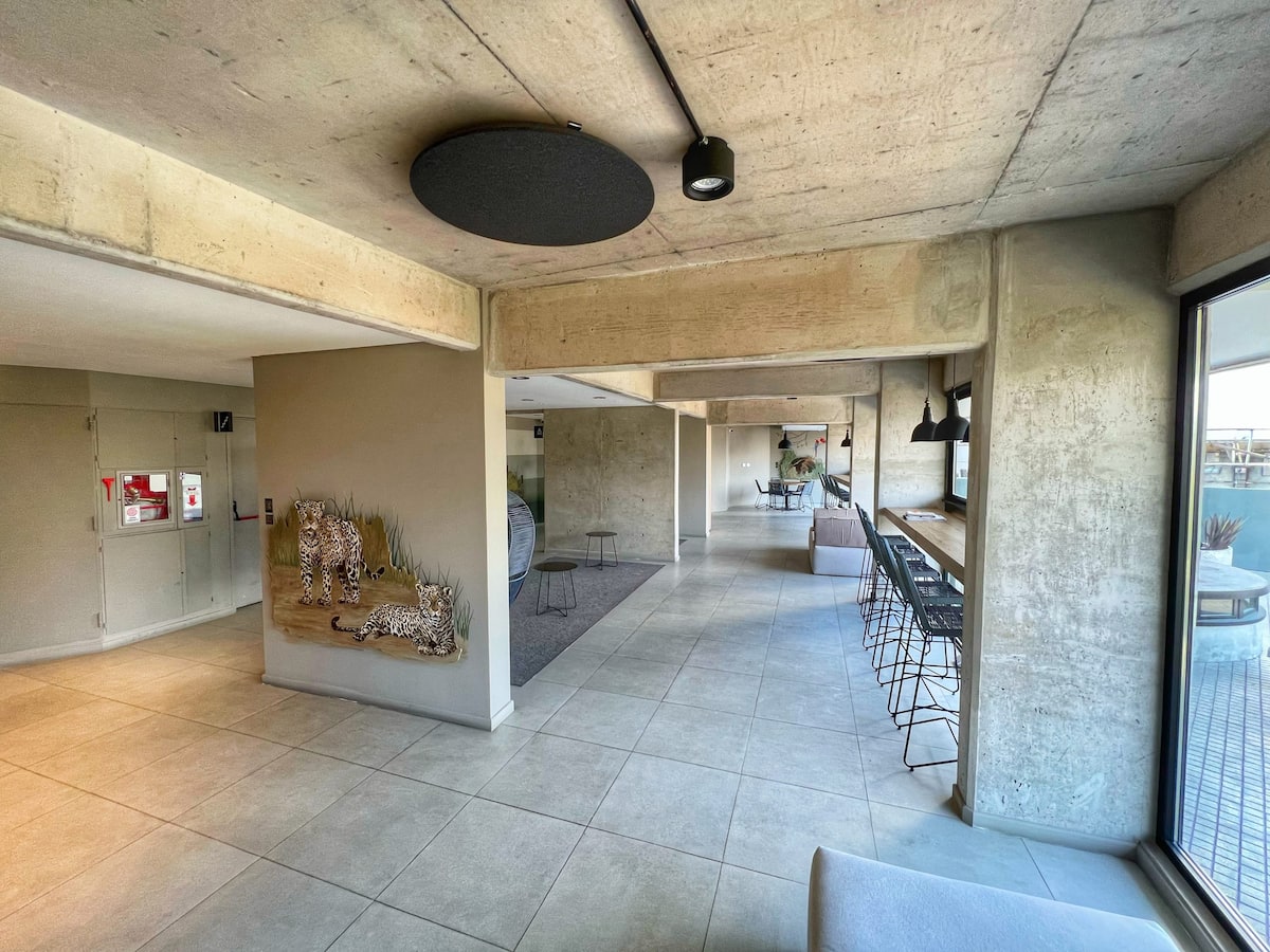 Квартира-лофт с 1 спальней в Constitución, новая. Кухня полностью оборудована, в гостиной установлен Smart TV. В числе принадлежностей кофеварка, электрочайник и посуда. В здании на 3-м этаже есть общая рабочая зона и переговорная с быстрым Wi‑Fi. Квартира выходит на сторону станции San Juan линии C метро. Вход в здание осуществляется через сейф с ключом, в квартиру — с электронным замком с кодом; кабельное телевидение отсутствует.