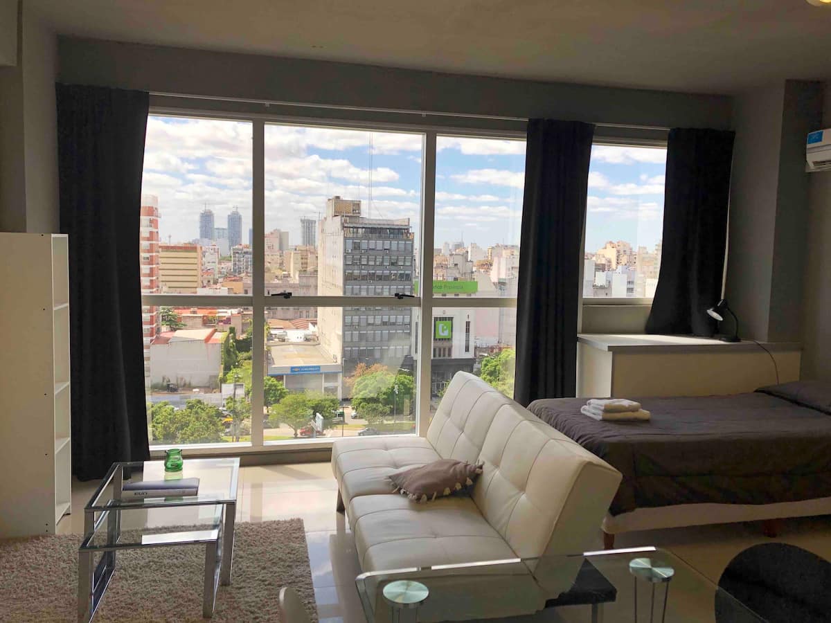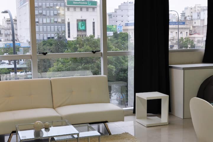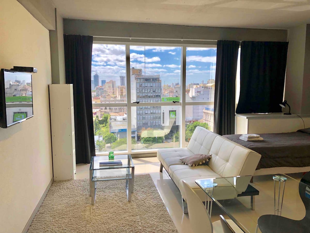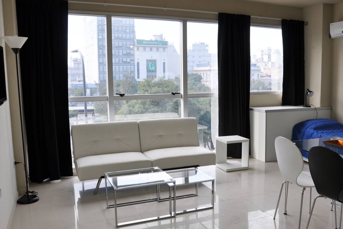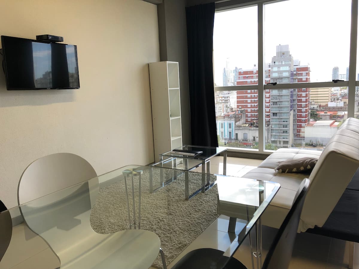 Квартира площадью 35 m² в Constitución расположена на Av. 9 de Julio, в нескольких шагах от San Telmo. В квартире окна на улицу, установлен кондиционер «холод/тепло». Кухонная зона оснащена холодильником с морозильной камерой, электрической духовкой и посудой, в гостиной есть диван, стол и 32" LED TV с кабельным телевидением. В ванной — душ. В здании есть терраса на 13-м этаже, предусмотрена зона для курения. Возможность пользоваться зоной гриля — по предварительной договорённости с администраци