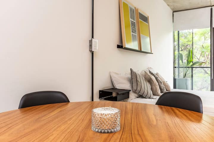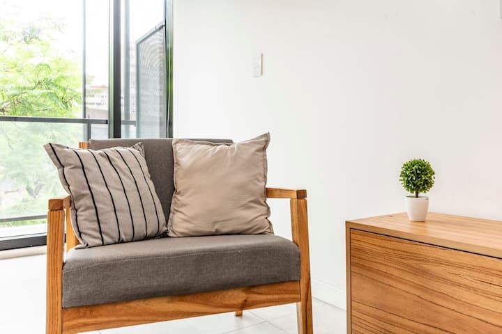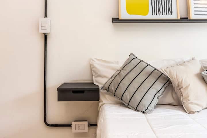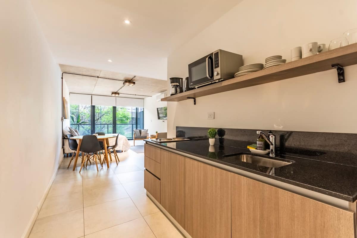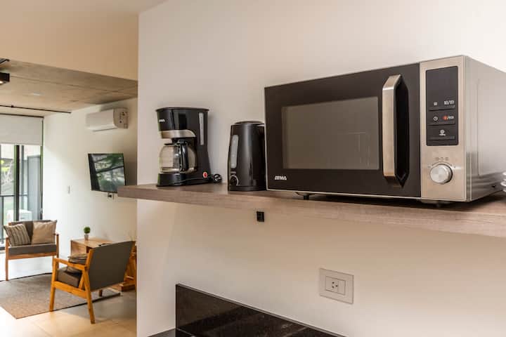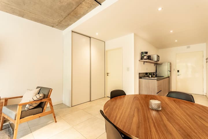 Новая квартира-лофт в Constitución. Внутри современная планировка с полностью оборудованной кухней и просторной гостиной. На территории здания есть общая рабочая зона и переговорная на 3-м этаже с быстрым Wi-Fi. В квартире установлены кофеварка, Smart TV, электрический чайник и посуда; телевидение идёт через подключение контента со смартфона, кабельного ТВ нет. Доступ в здание осуществляется по ключу из сейфа, вход в квартиру — по электронному замку с кодом. Оплата резервирования и дополнительны