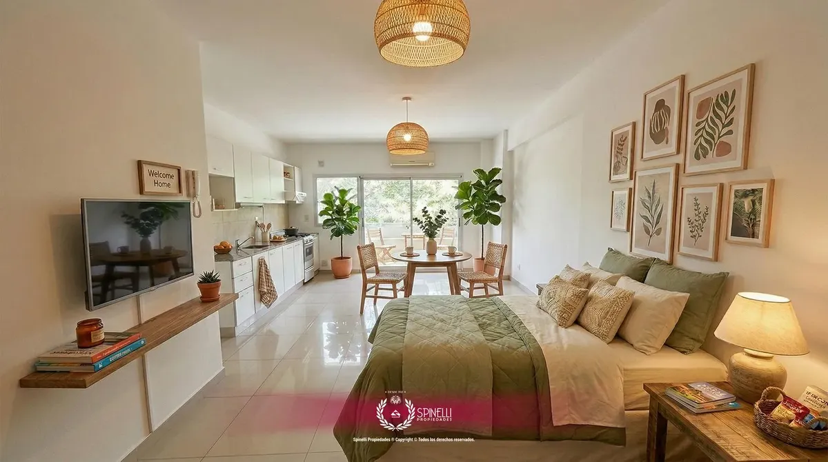 Квартира-студия в Flores, 1-й этаж, окна на улицу и балкон на общий двор (в описании указано как balcón dispuesto al frente и указаны размеры балкона hacia el contrafrente). Площадь в объявлении не указана. Кухня интегрирована в помещение в формате американской кухни. В ванной с ванной предусмотрены размеры 1.60 m x 2.00 m, площадь помещения указана как 7.00 m x 3.25 m. Балкон corrido размером 3.25 m x 1.10 m.