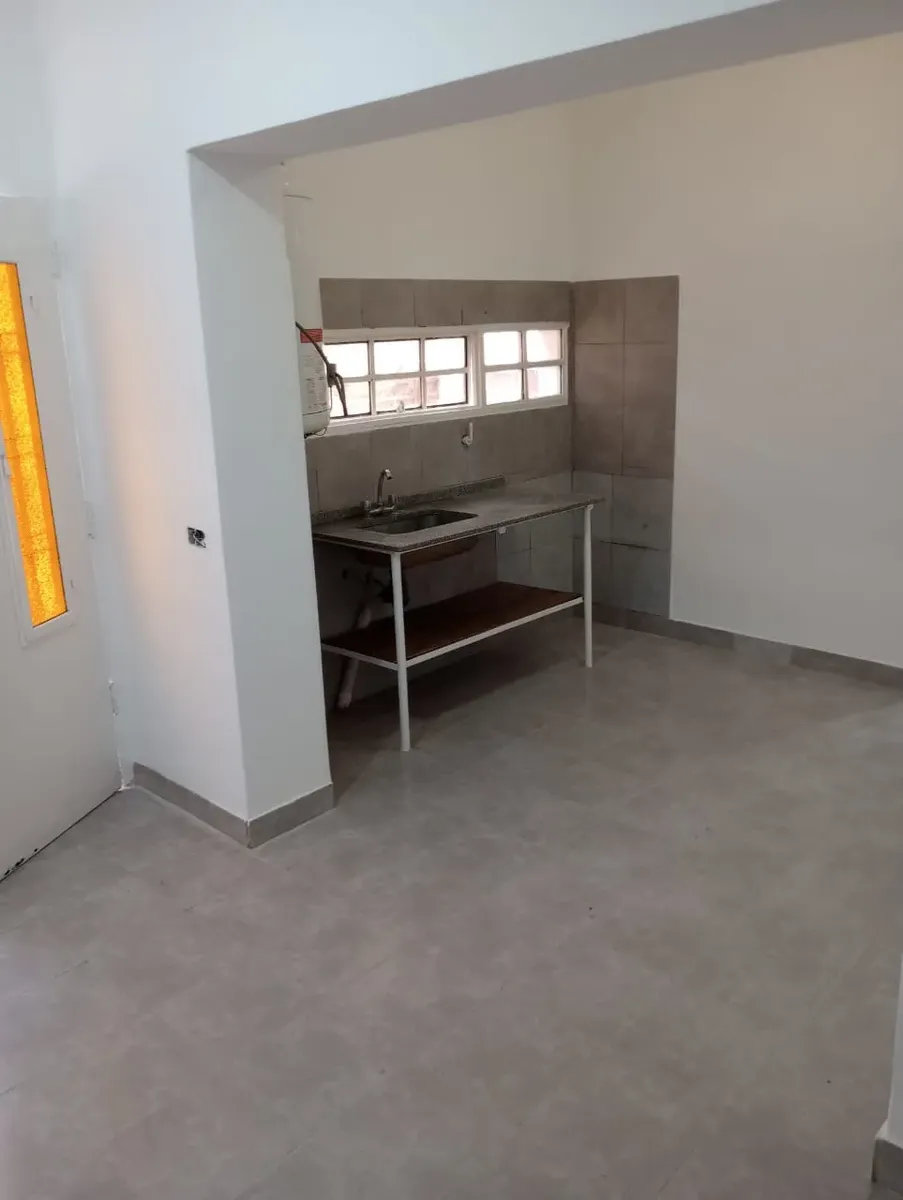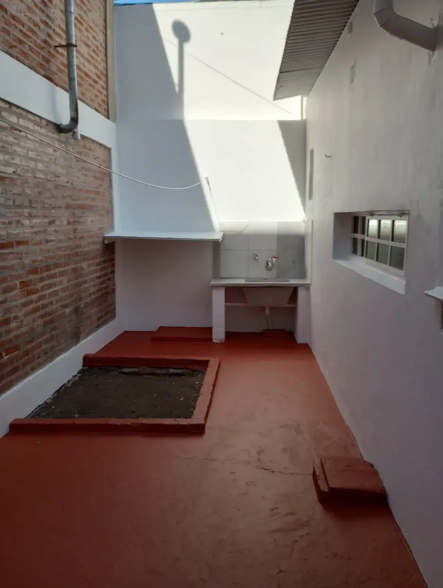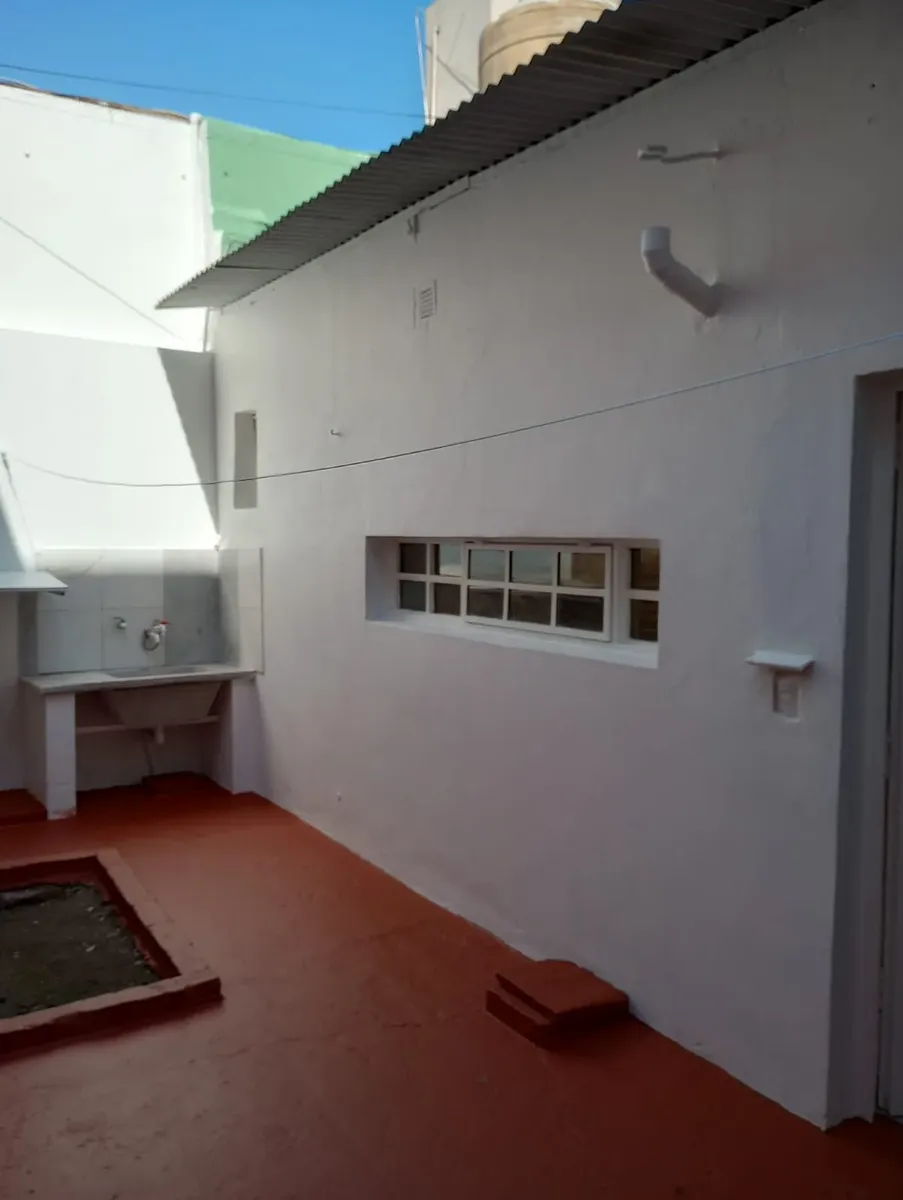 Квартира типа casa в Hurlingham с 1 спальней. Планировка включает кухню-гостиную, коридор, ванную комнату и отдельную прачечную/помещение для стирки. Есть внутренний двор с закрытым по периметру ограждением. Коммуникации: газ, электричество и городская канализация. Указано, что объект расположен рядом с общественным транспортом.