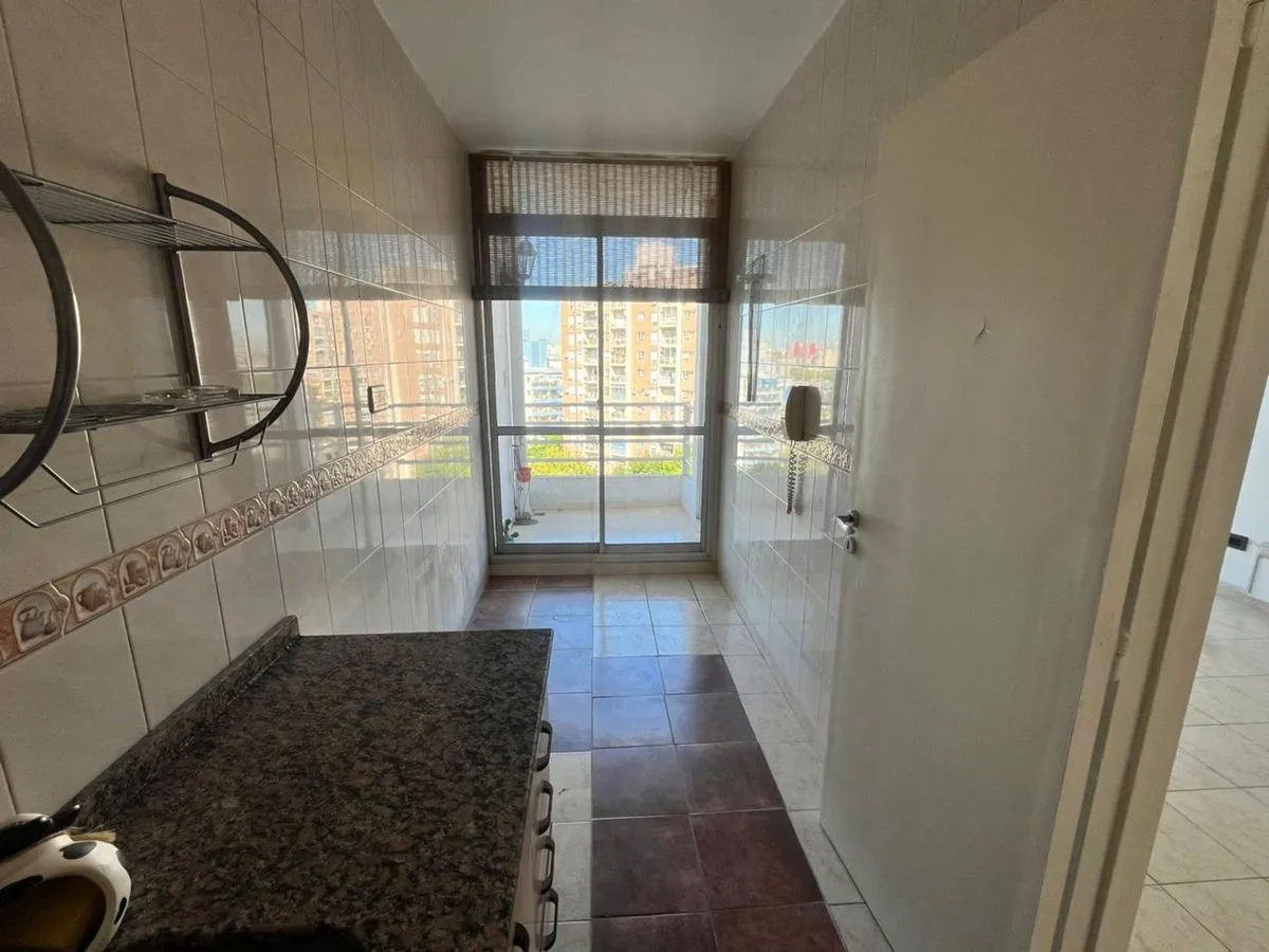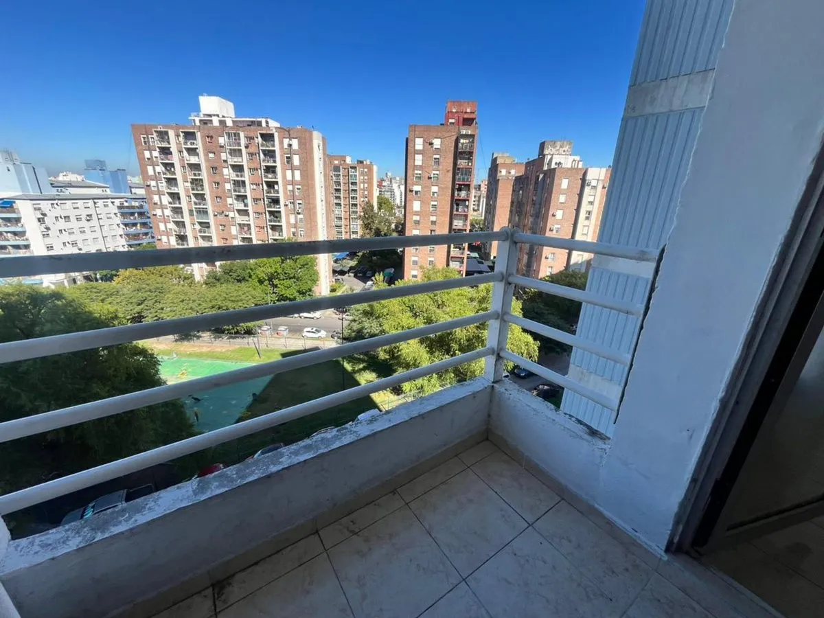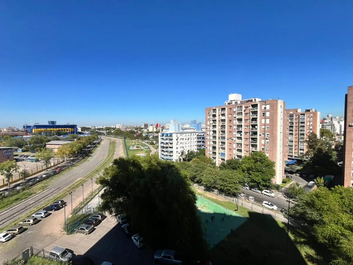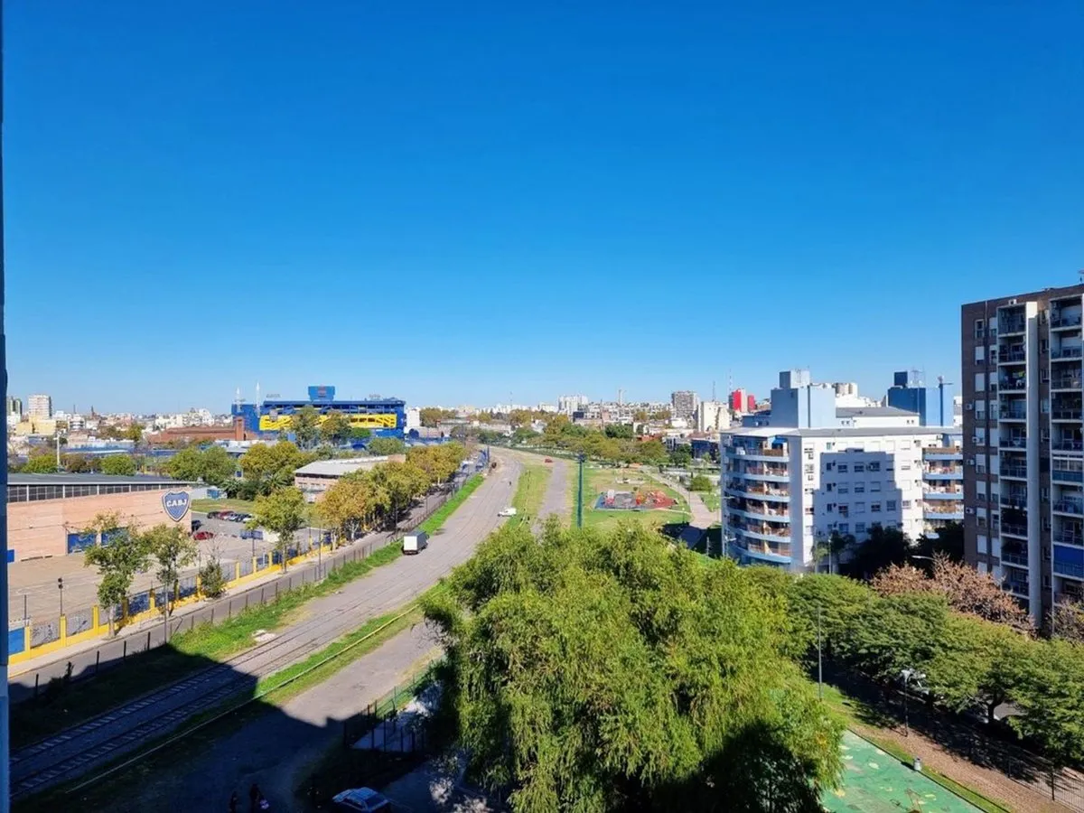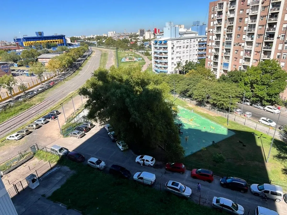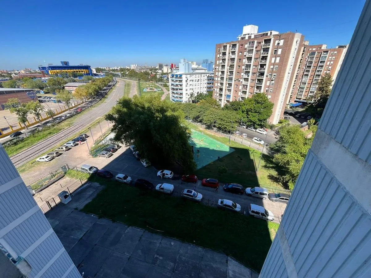 Квартира в La Boca, 2 комнаты, находится на 8-м этаже и выходит во двор квартала. Окна направлены на внутренний двор и на территорию Boca Juniors в Casa Amarilla; на дальнем плане виден стадион La Bombonera. В гостиной-столовой есть выход на балкон-террасу. Спальня с встроенным шкафом, отдельная кухня с собственным выходом на балкон, полная ванная комната. В аренду указаны коммунальные платежи здания (expensas) и доступность транспорта и инфраструктуры в районе, включая Caminito и Hospital Arger