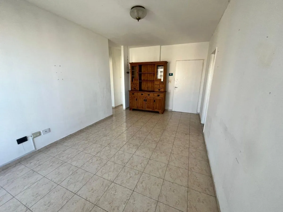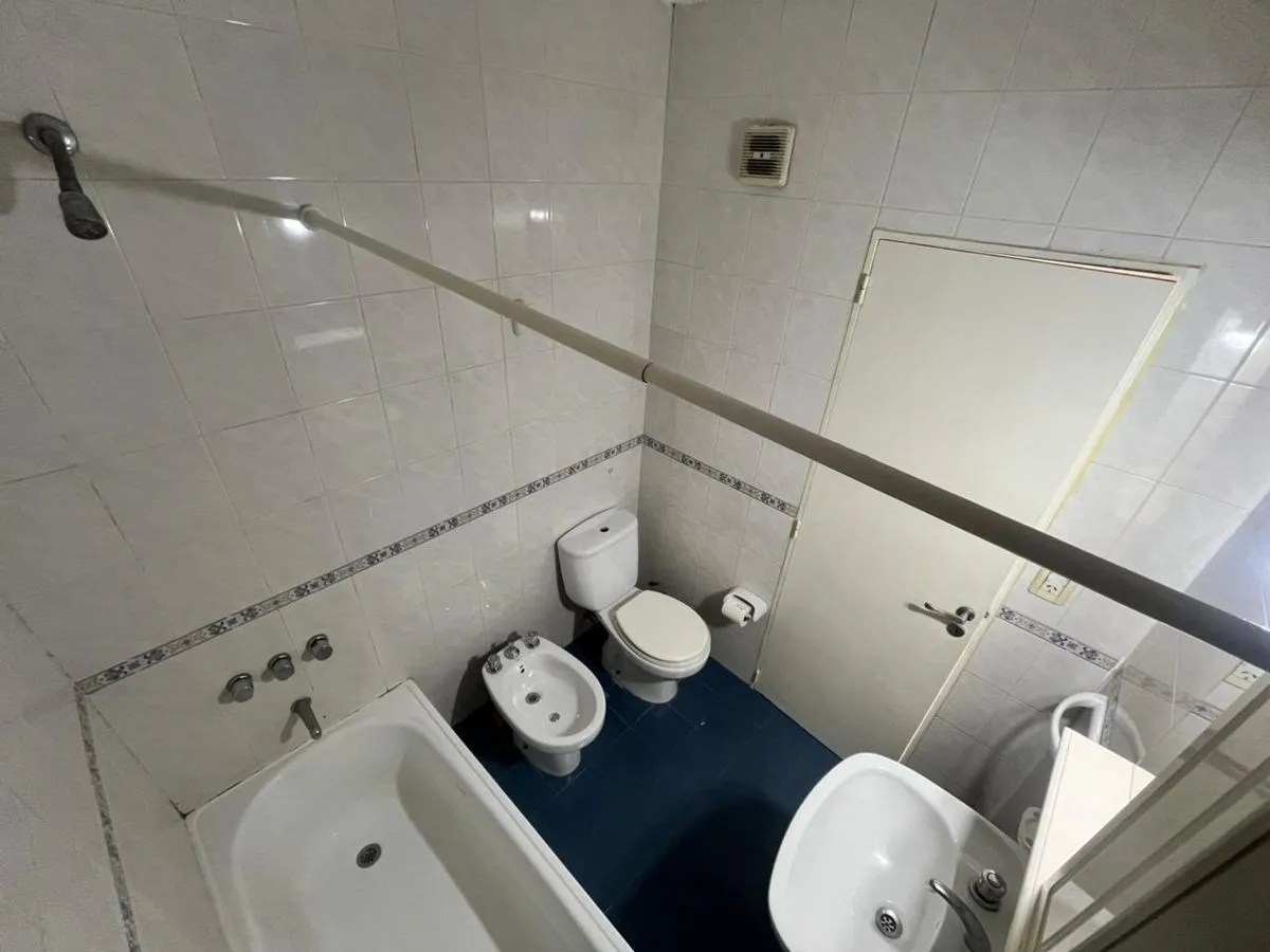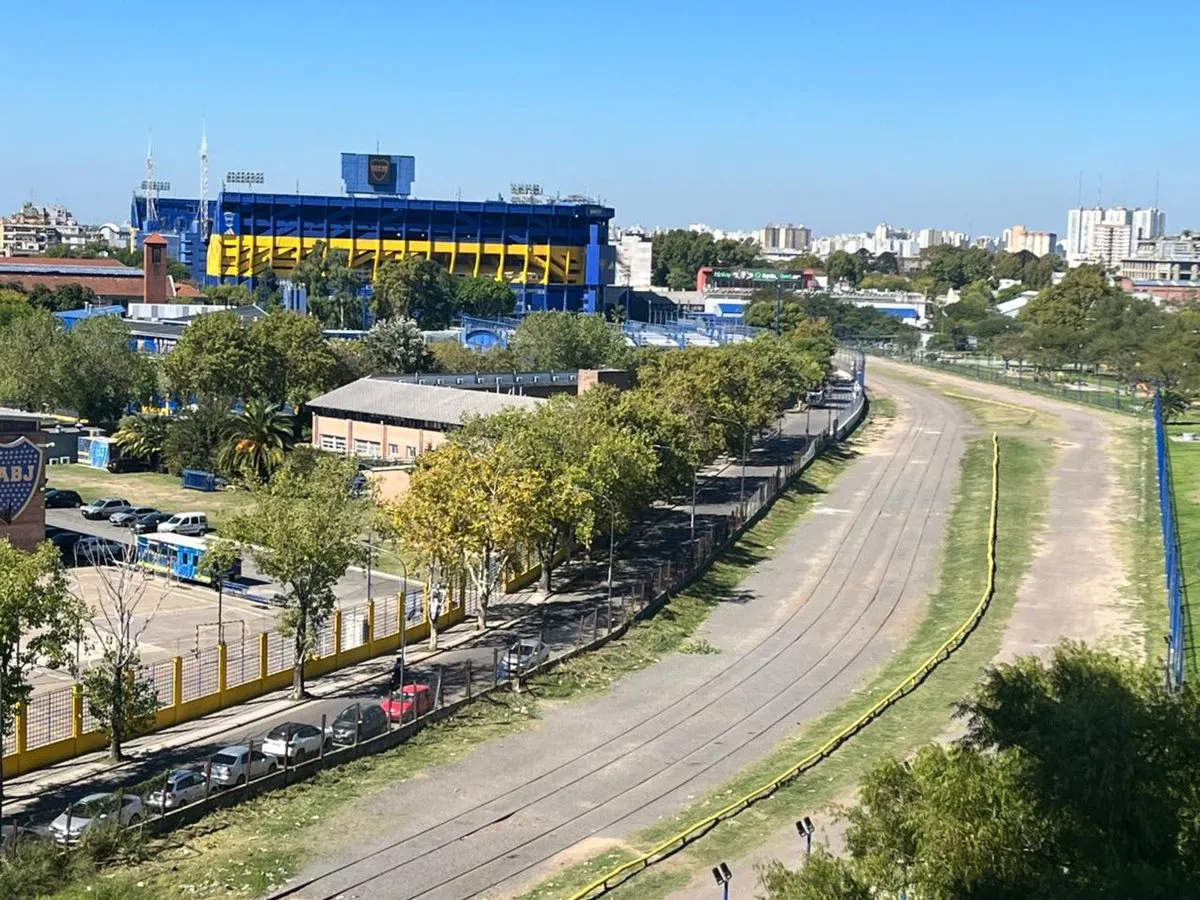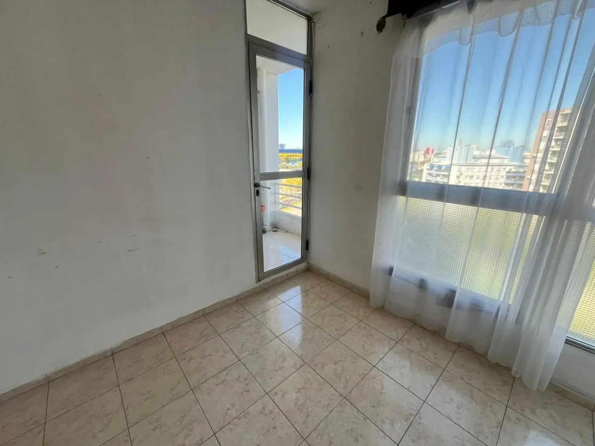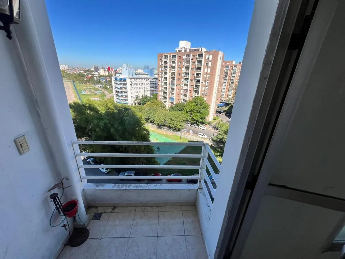 Квартира в La Boca, 2 комнаты, находится на 8-м этаже и выходит во двор квартала. Окна направлены на внутренний двор и на территорию Boca Juniors в Casa Amarilla; на дальнем плане виден стадион La Bombonera. В гостиной-столовой есть выход на балкон-террасу. Спальня с встроенным шкафом, отдельная кухня с собственным выходом на балкон, полная ванная комната. В аренду указаны коммунальные платежи здания (expensas) и доступность транспорта и инфраструктуры в районе, включая Caminito и Hospital Arger