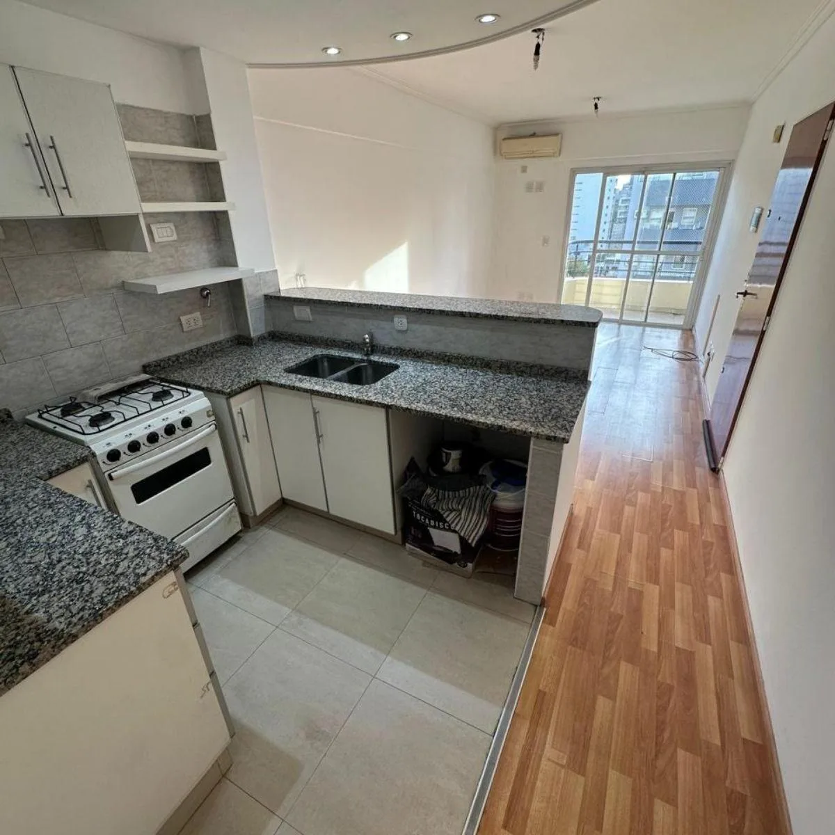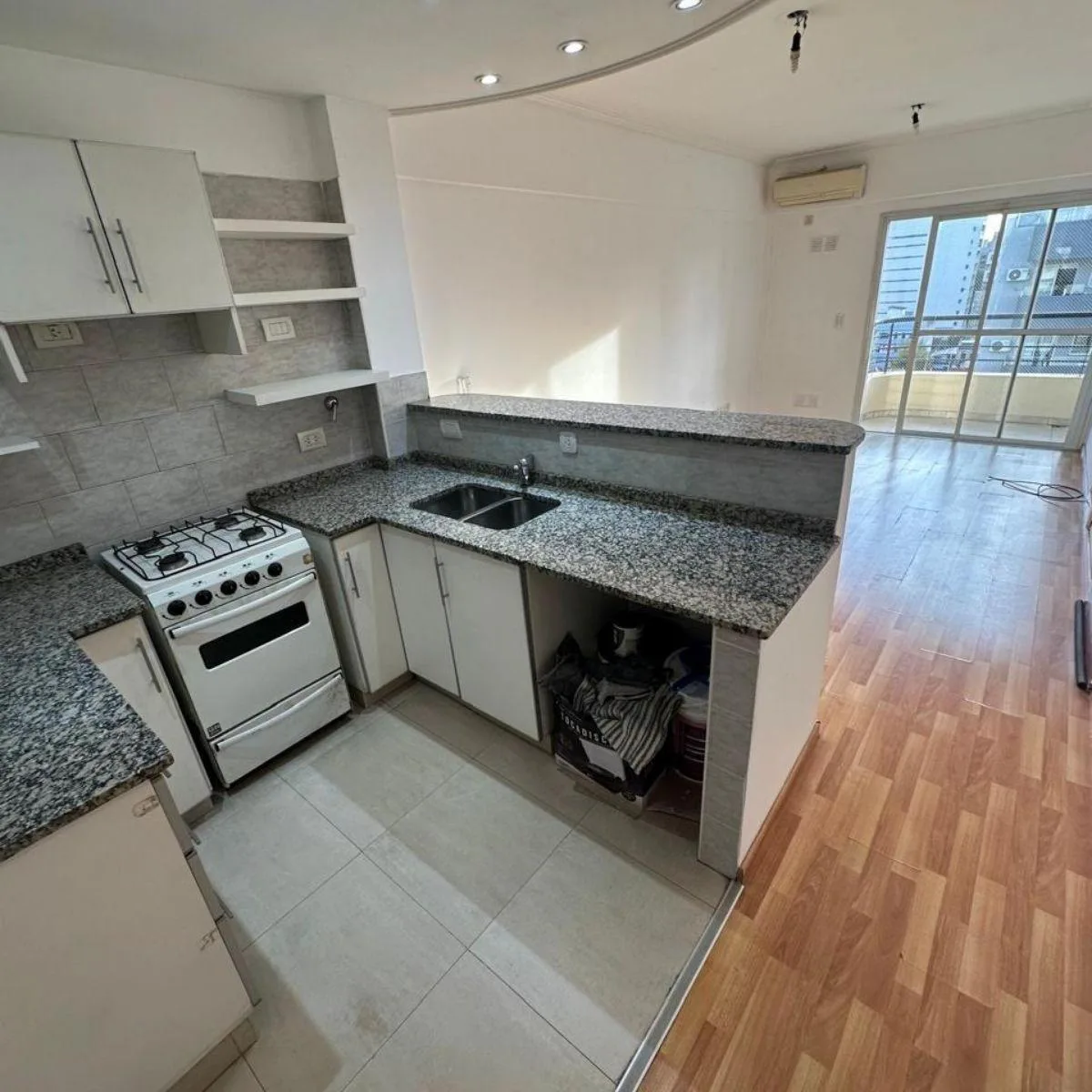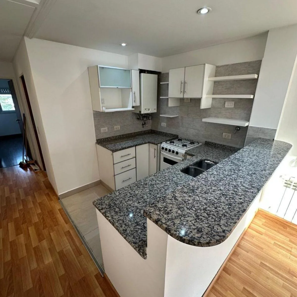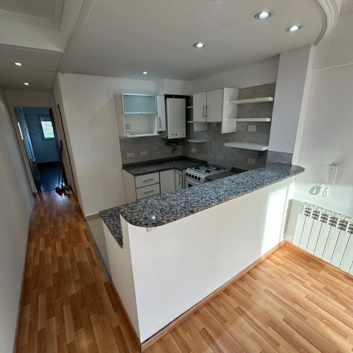Квартира с 2 комнатами площадью 2 ambientes в Lanús Oeste, 9-й этаж. Окна на улицу, есть балкон. В квартире гостиная-столовая с выходом на балкон, кухня с барной стойкой и мебелью, спальня с встроенным шкафом. Отопление — радиаторы от котла. Полноценная ванная комната. В стоимость включено (закреплённое) парковочное место (cochera).