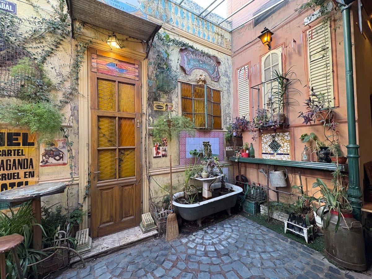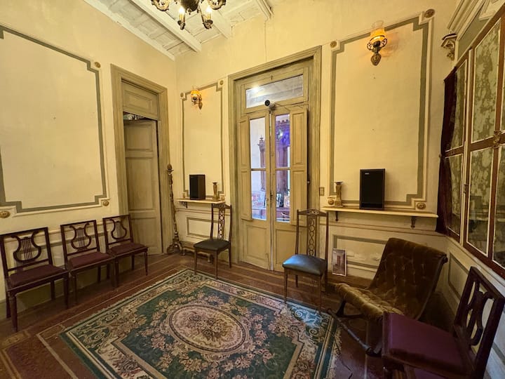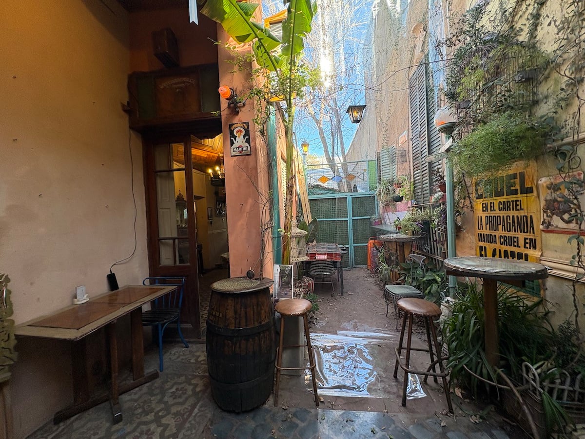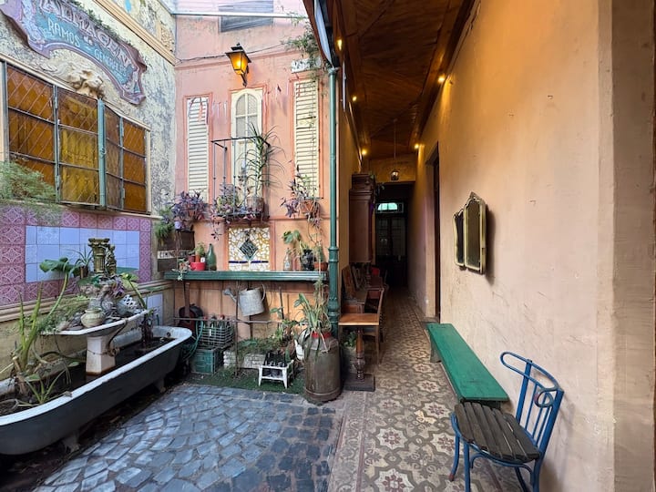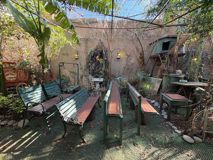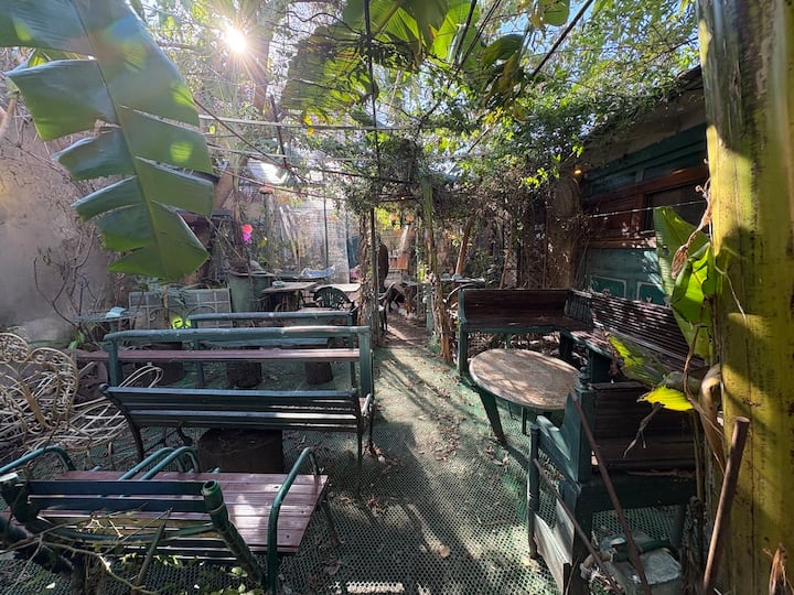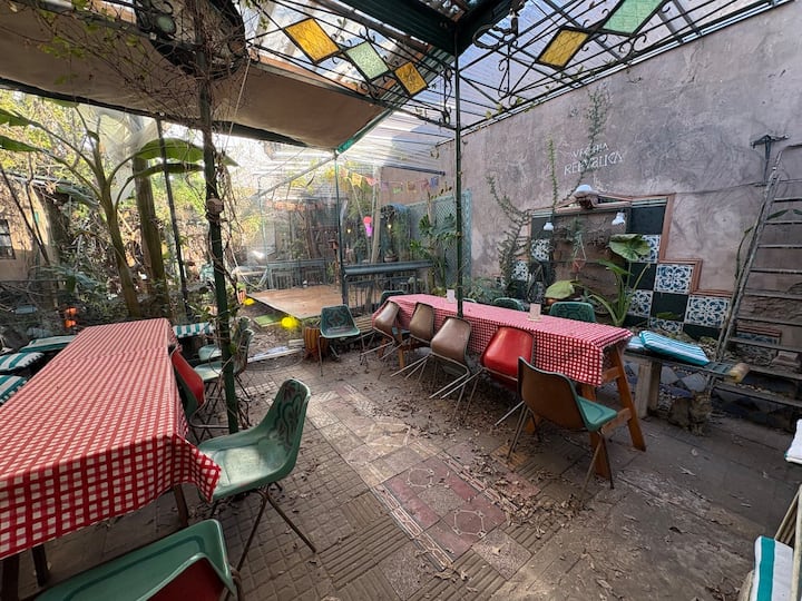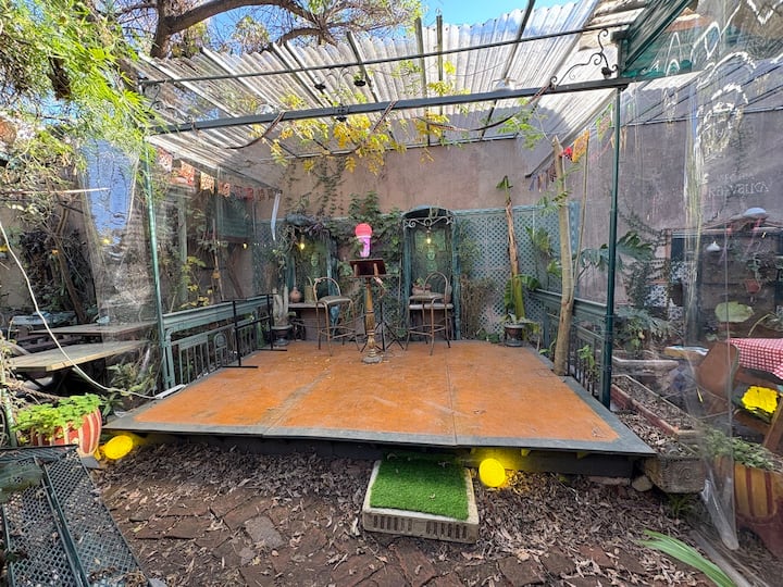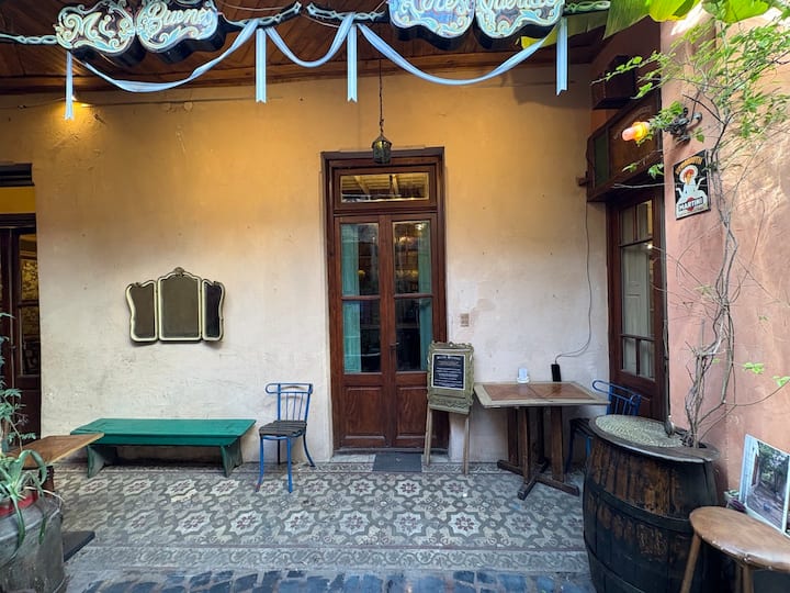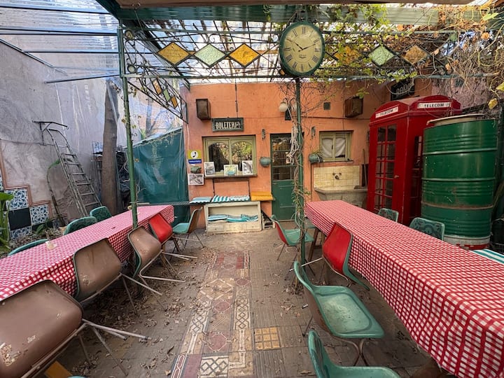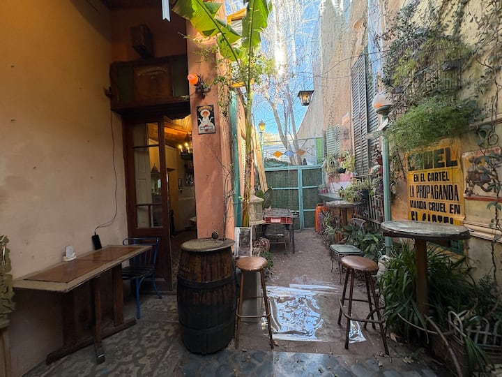 В объявлении упоминается Art House «Vieja República» в Mataderos. Рассматривается пространство с входными воротами и внутренней садовой зоной, оформленной как «room set» в старых железнодорожных вагонах.