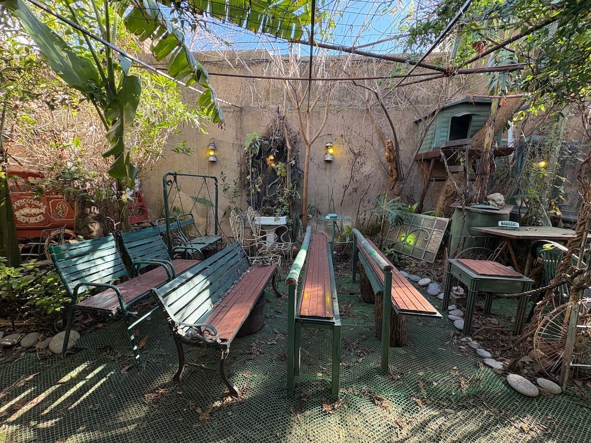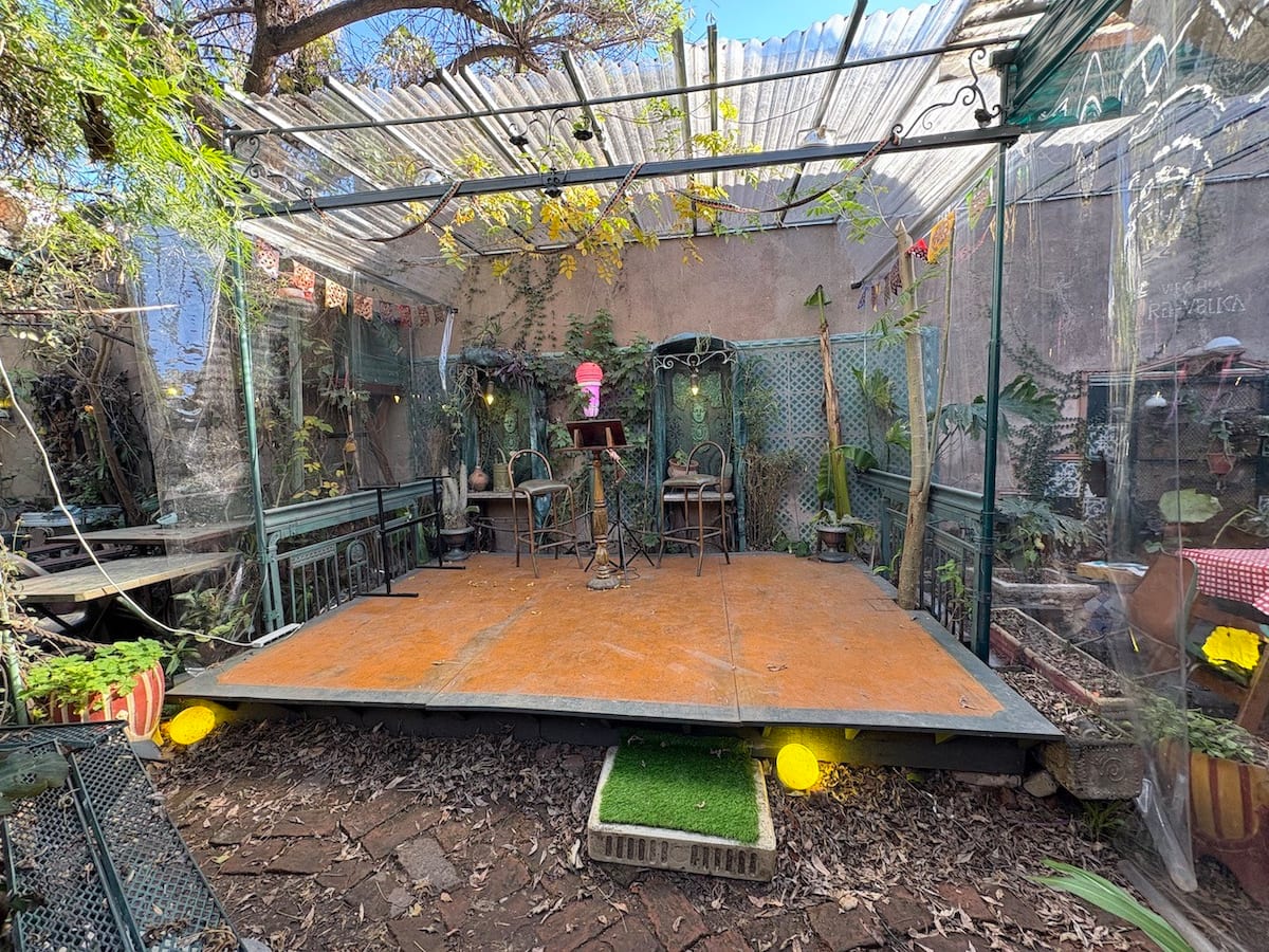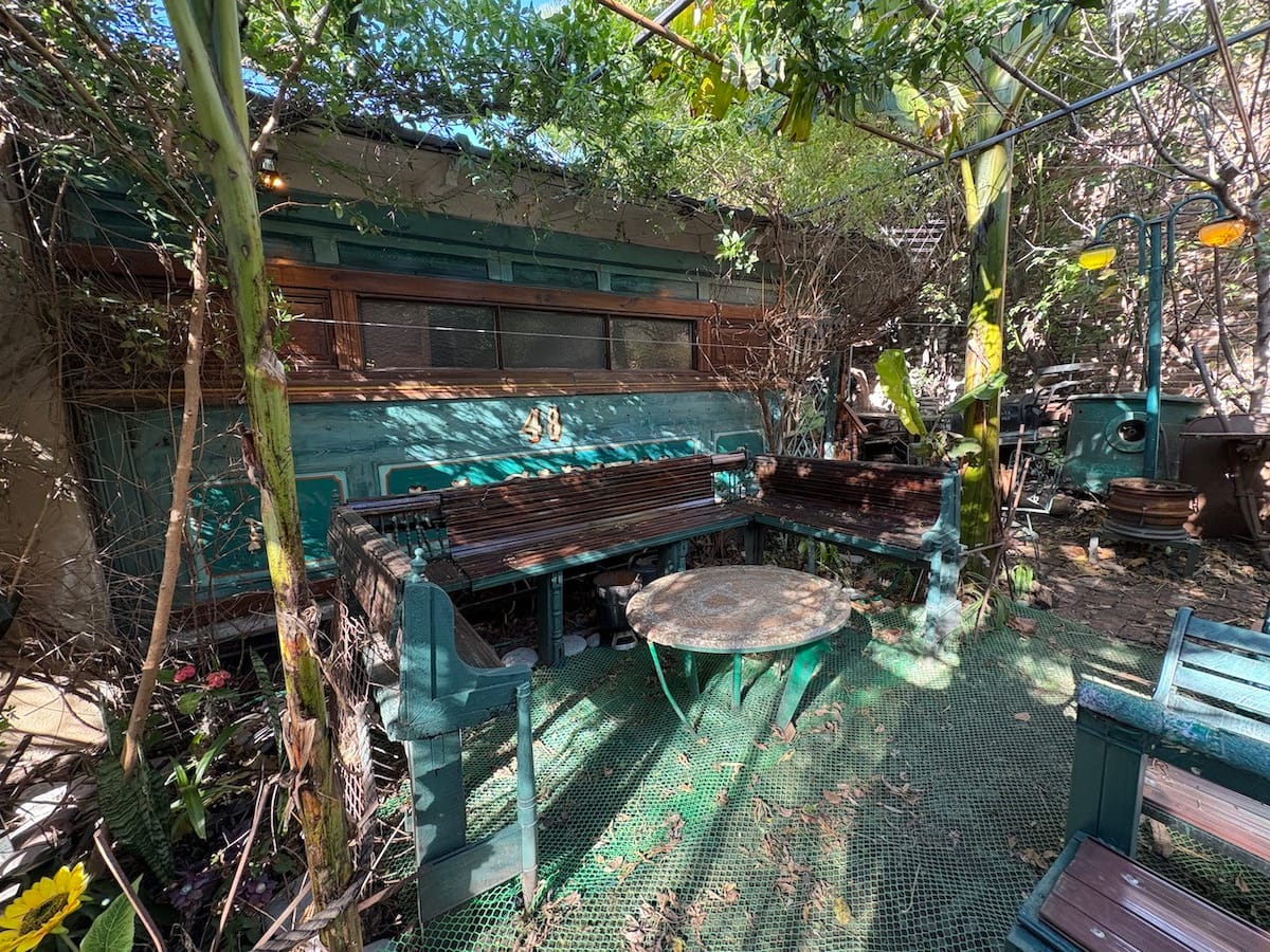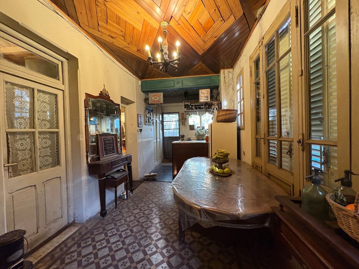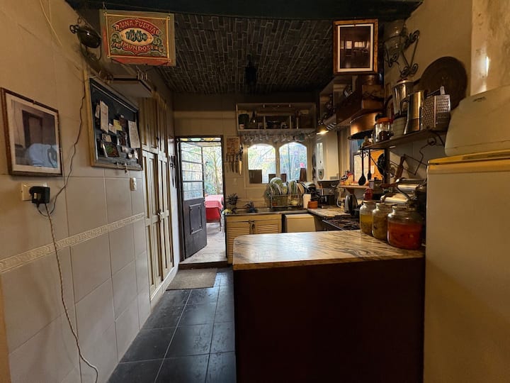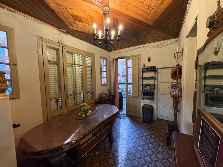 В объявлении упоминается Art House «Vieja República» в Mataderos. Рассматривается пространство с входными воротами и внутренней садовой зоной, оформленной как «room set» в старых железнодорожных вагонах.