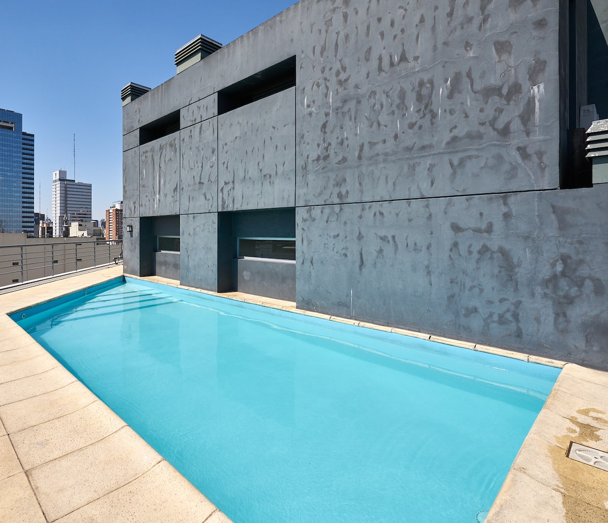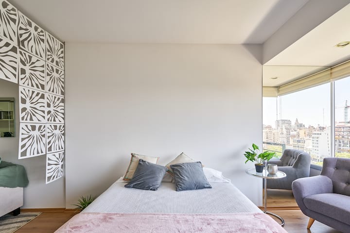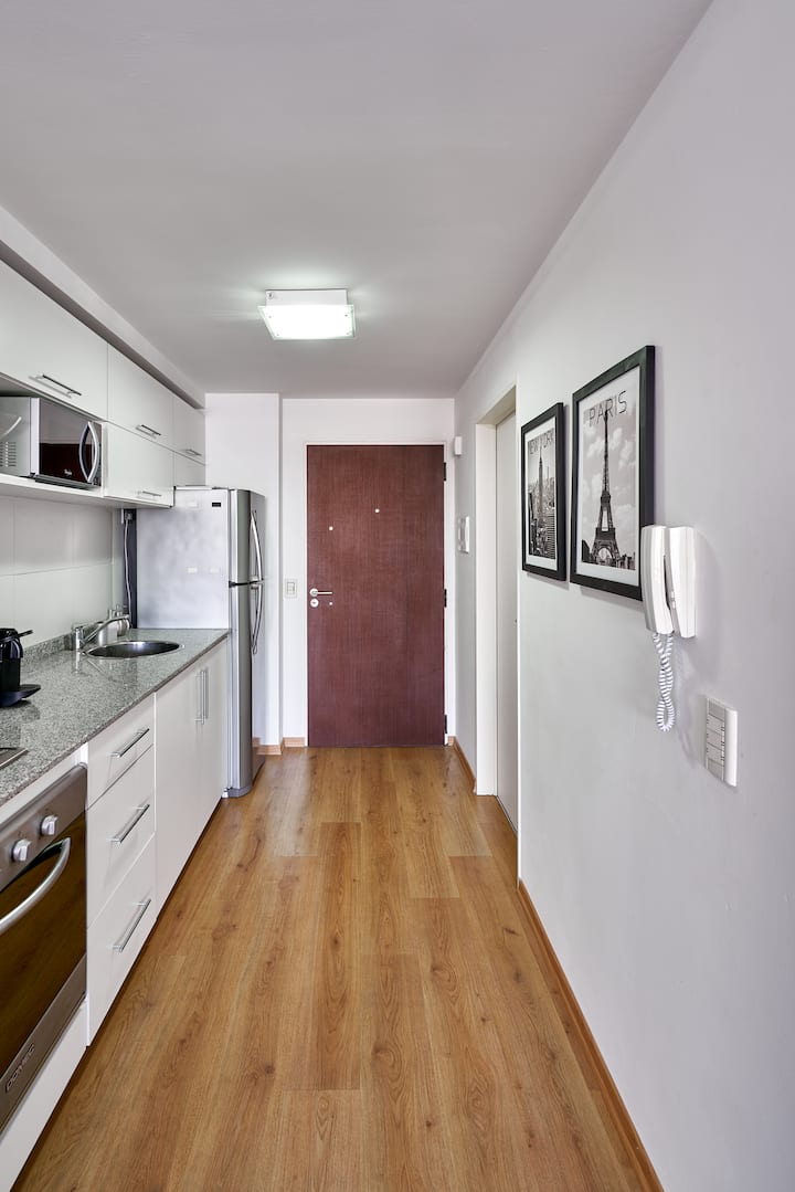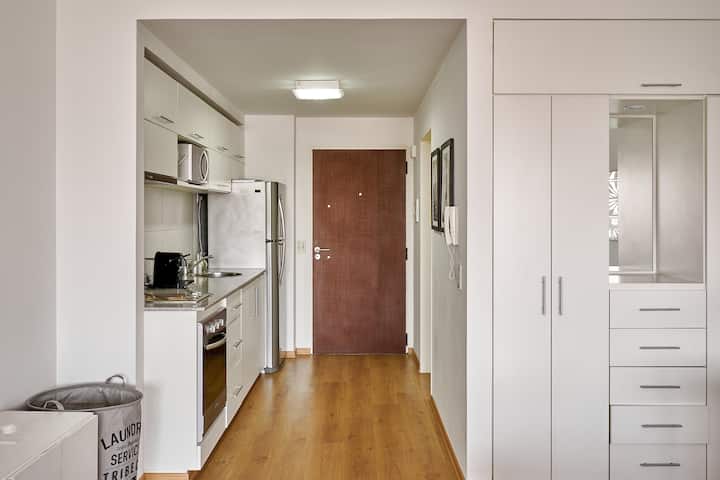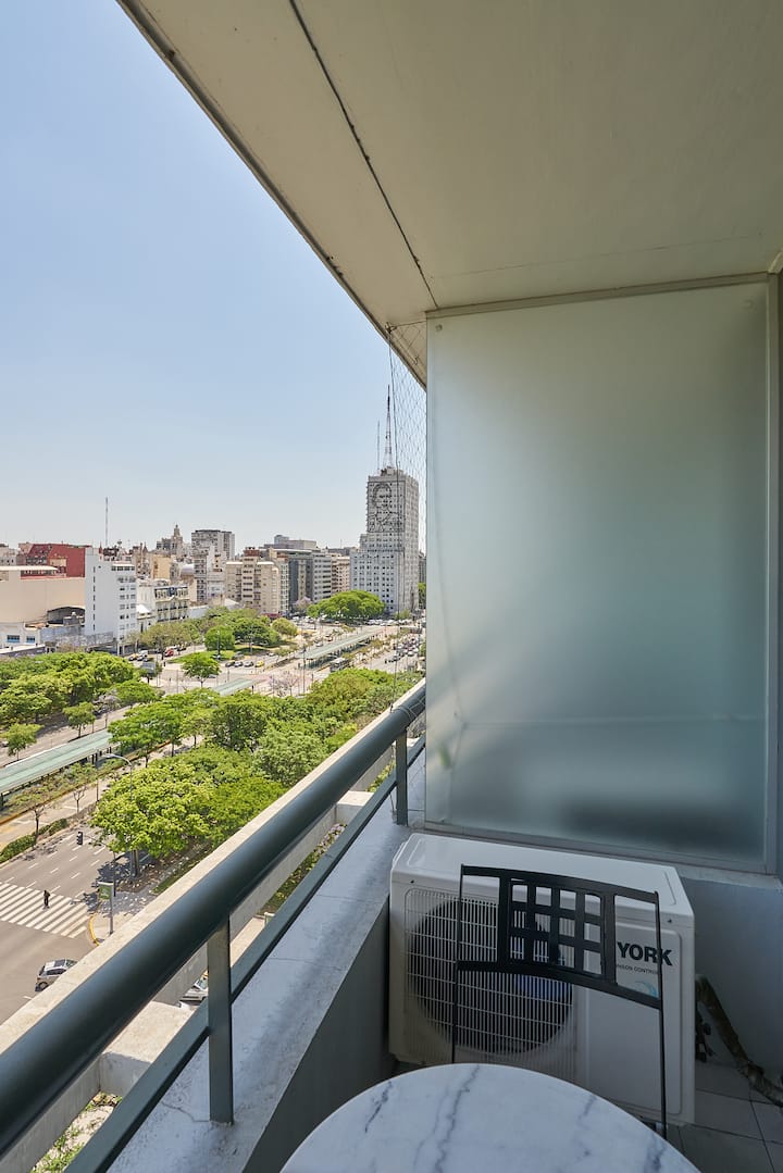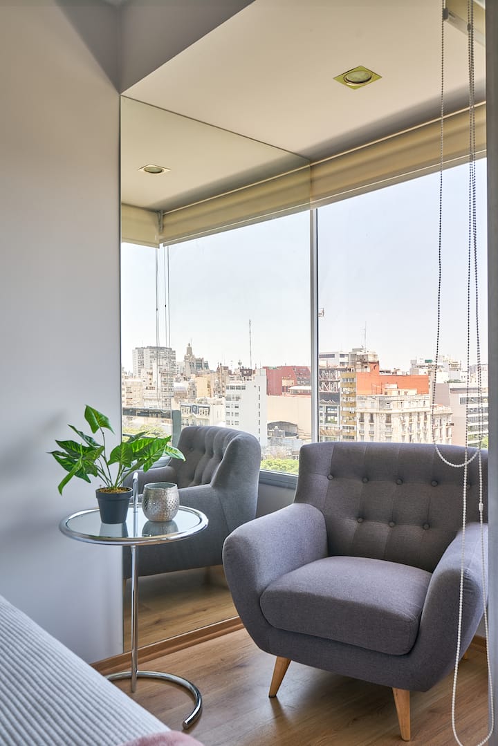 Квартира-студия в новом здании. Планировка включает спальню, гостиную и рабочую зону, полностью оборудованную кухню. Указан панорамный вид на Av. 9 de Julio. В здании есть тренажёрный зал, прачечная и бассейн, круглосуточная охрана/ресепшн. В описании также сказано, что парковка находится в 1/2 квартала: Mexico 945.