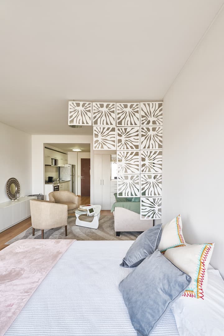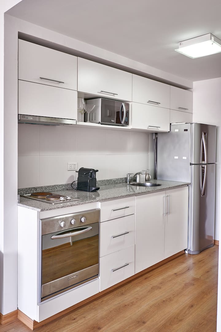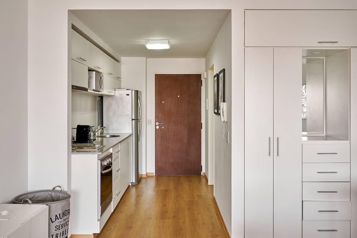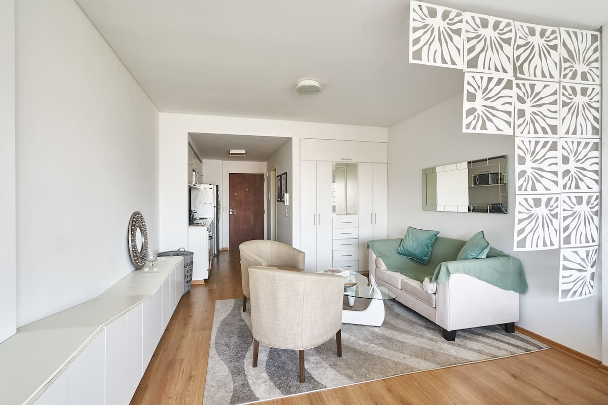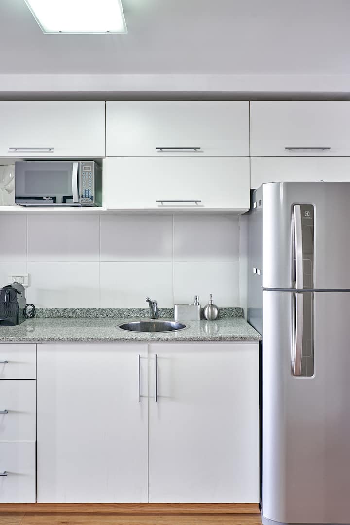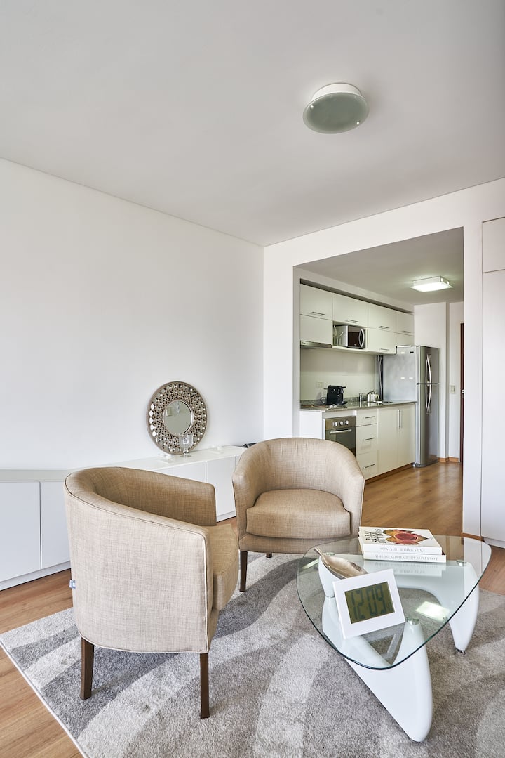 Квартира-студия в новом здании. Планировка включает спальню, гостиную и рабочую зону, полностью оборудованную кухню. Указан панорамный вид на Av. 9 de Julio. В здании есть тренажёрный зал, прачечная и бассейн, круглосуточная охрана/ресепшн. В описании также сказано, что парковка находится в 1/2 квартала: Mexico 945.