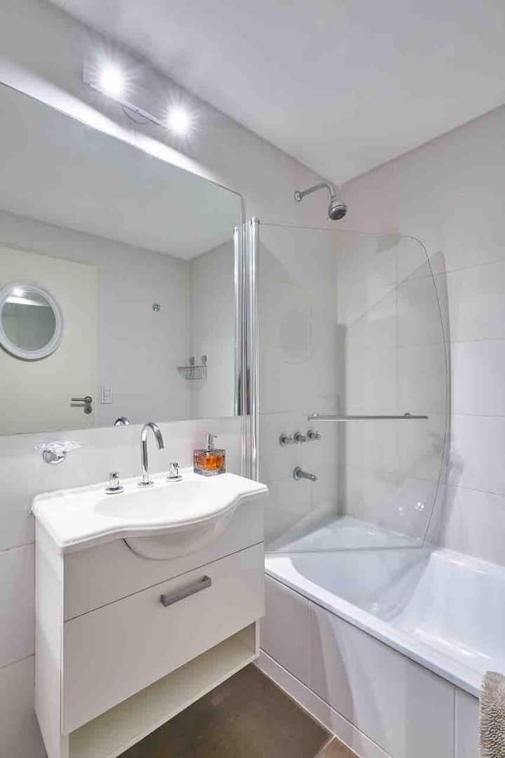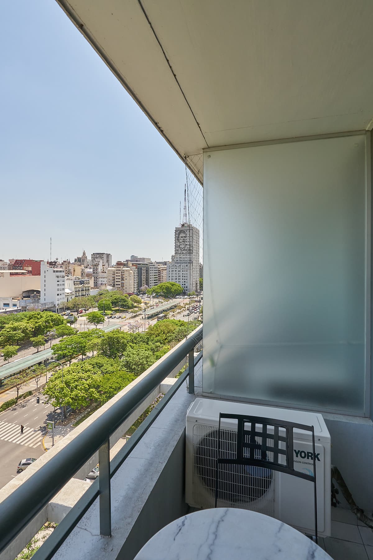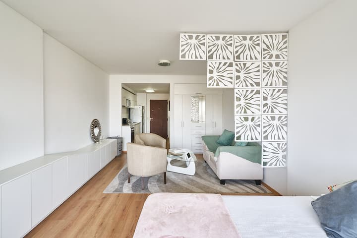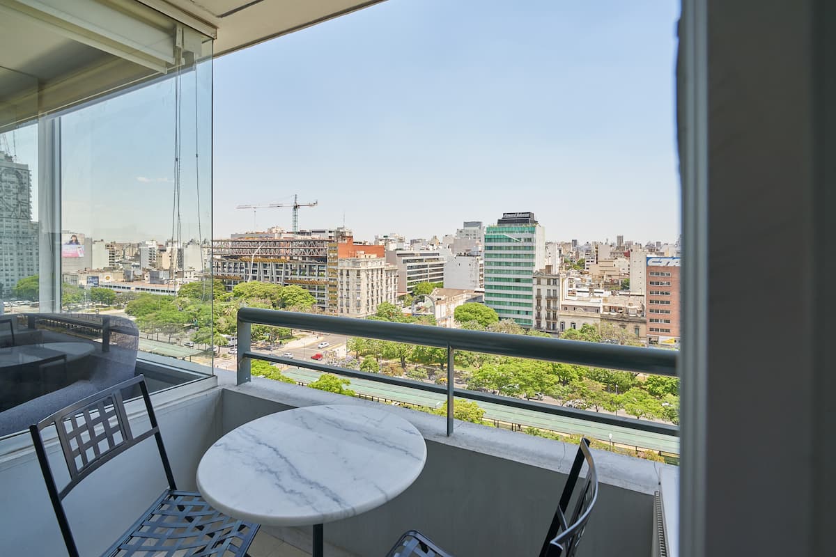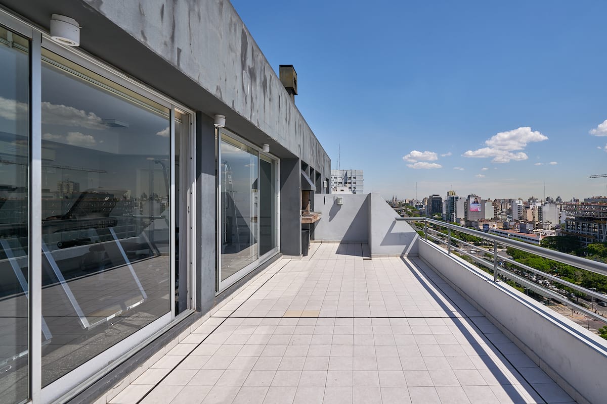 Квартира-студия в новом здании. Планировка включает спальню, гостиную и рабочую зону, полностью оборудованную кухню. Указан панорамный вид на Av. 9 de Julio. В здании есть тренажёрный зал, прачечная и бассейн, круглосуточная охрана/ресепшн. В описании также сказано, что парковка находится в 1/2 квартала: Mexico 945.