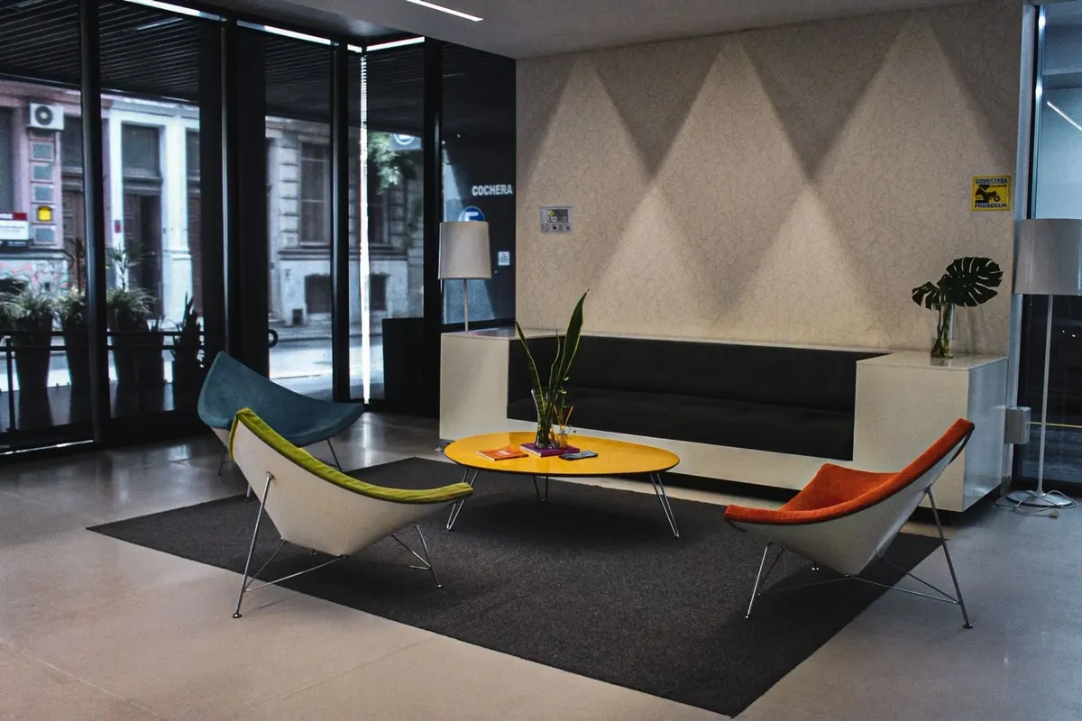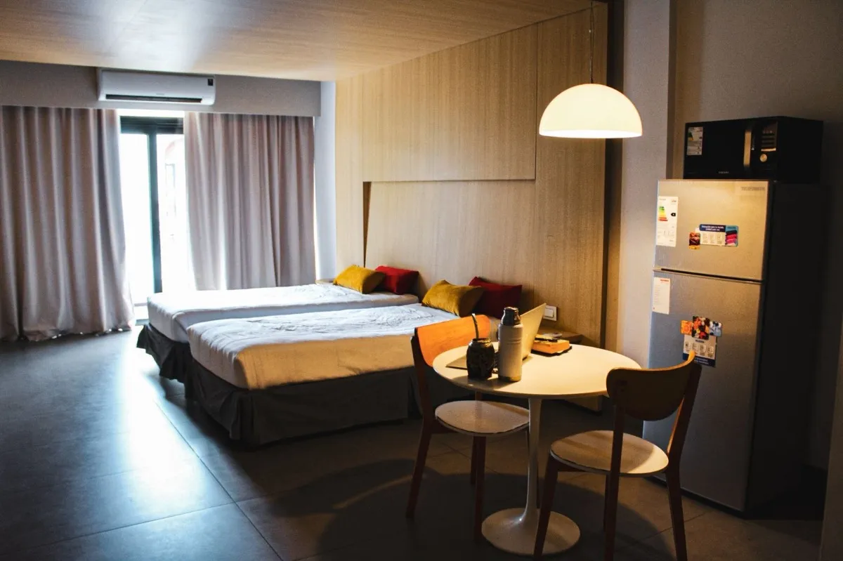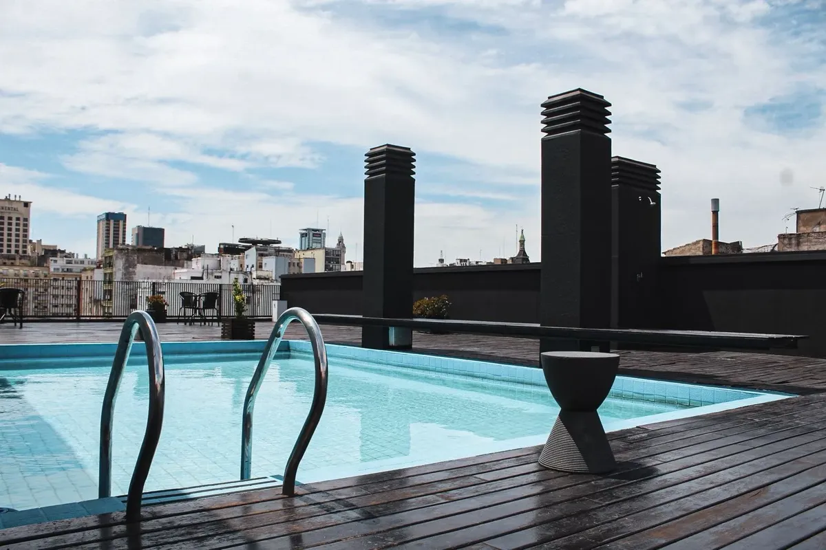 В Monserrat предлагаются квартиры-студии площадью 38, 43 и 48 m², с полной комплектацией. В здании предусмотрены пространство cowork, терраса с бассейном и зона приёма. В стоимость входят коммунальные платежи здания; также указаны свет, кабельное телевидение, Wi‑Fi и кондиционер. В объявлении сказано, что объект находится в 150 метрах от Av. 9 de Julio.