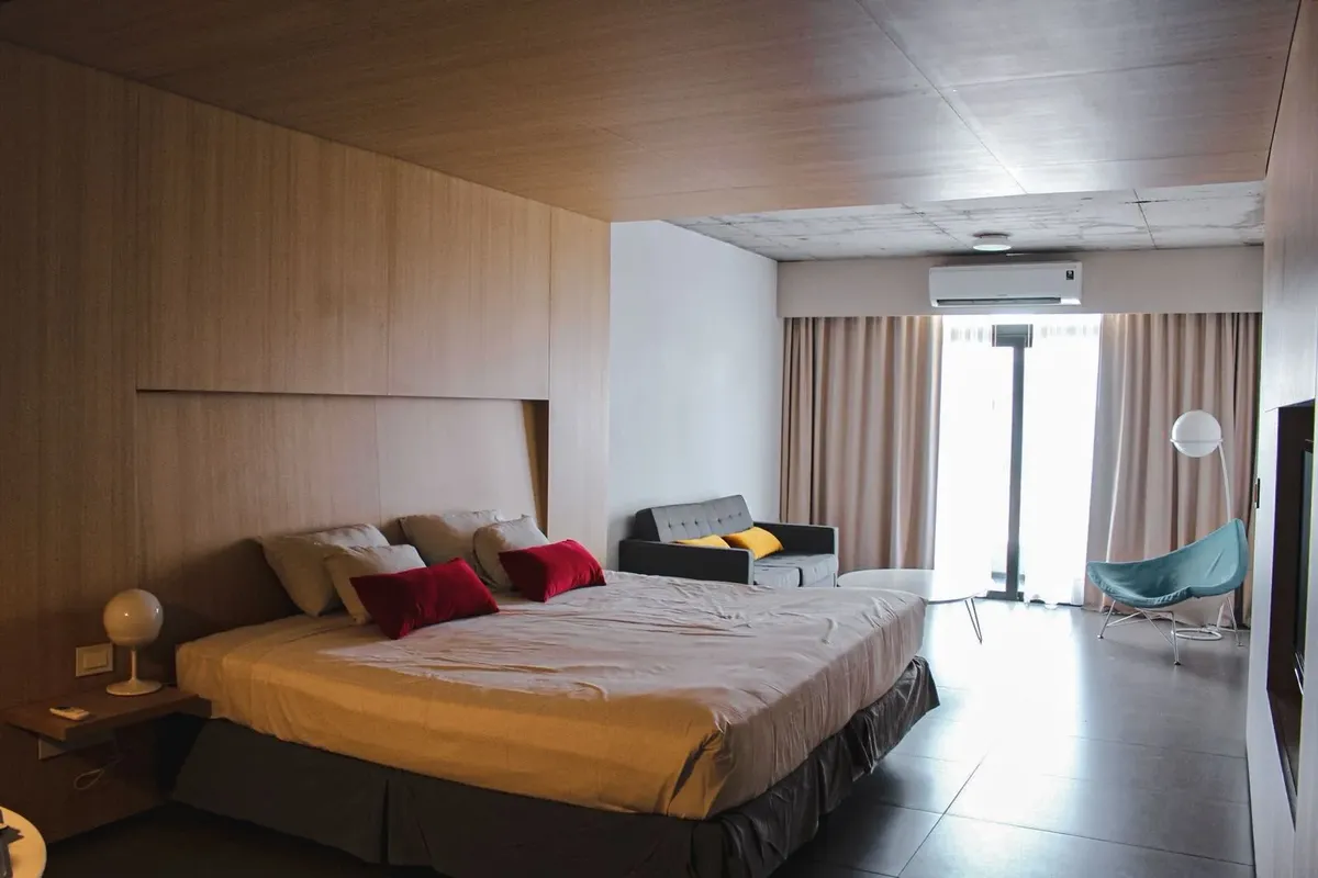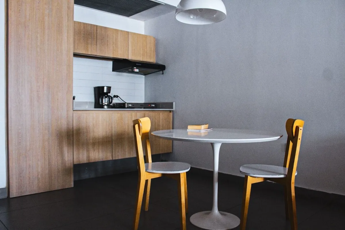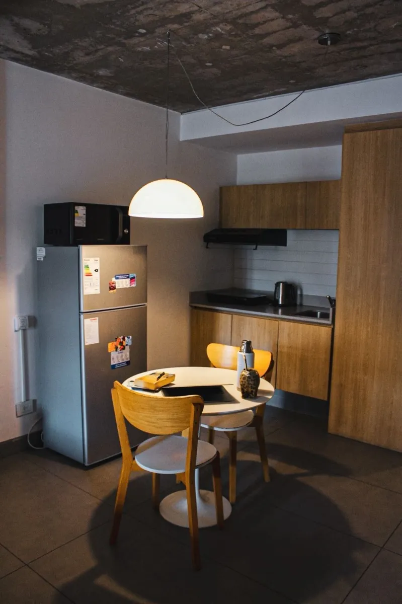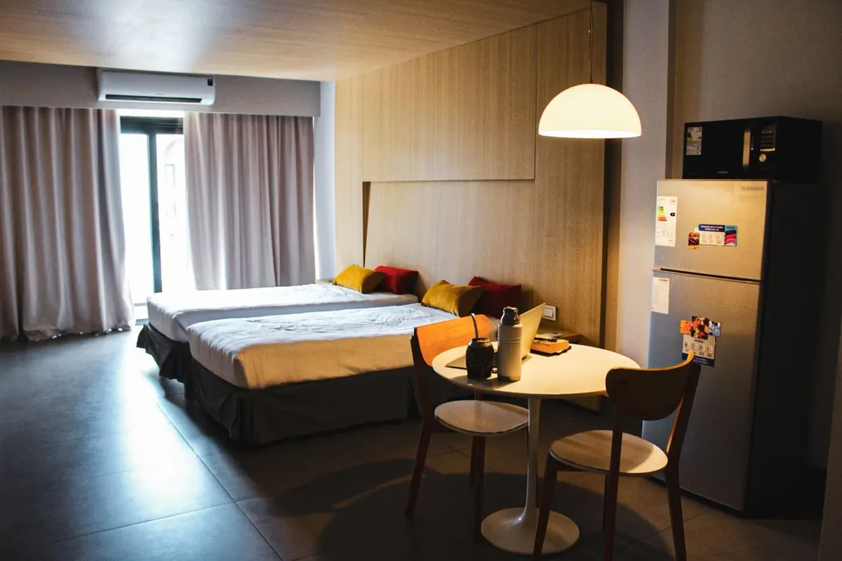 В Monserrat предлагаются квартиры-студии площадью 38, 43 и 48 m², с полной комплектацией. В здании предусмотрены пространство cowork, терраса с бассейном и зона приёма. В стоимость входят коммунальные платежи здания; также указаны свет, кабельное телевидение, Wi‑Fi и кондиционер. В объявлении сказано, что объект находится в 150 метрах от Av. 9 de Julio.