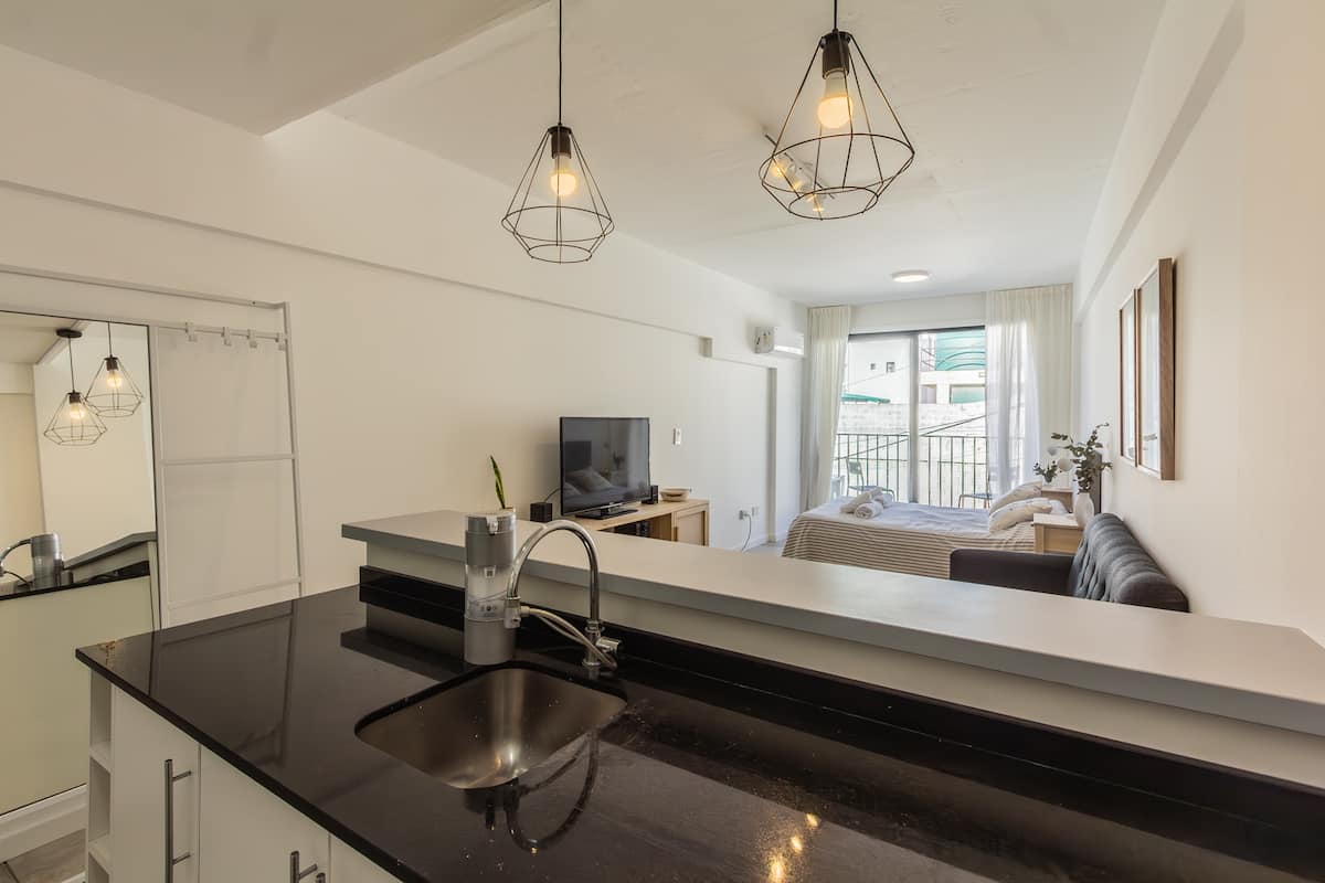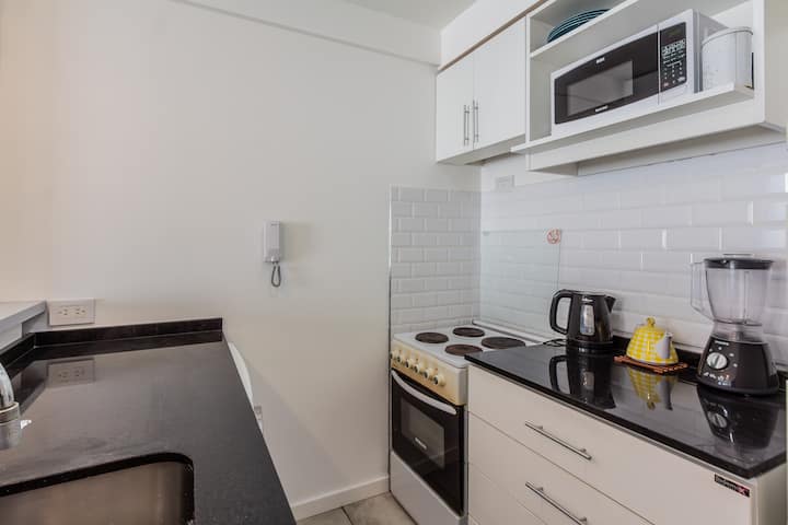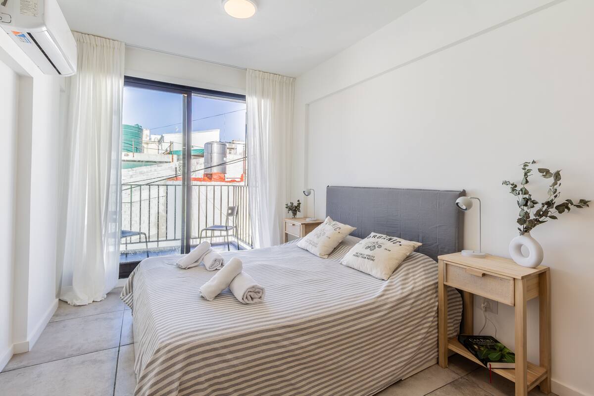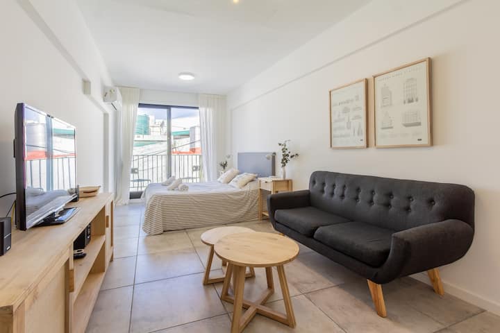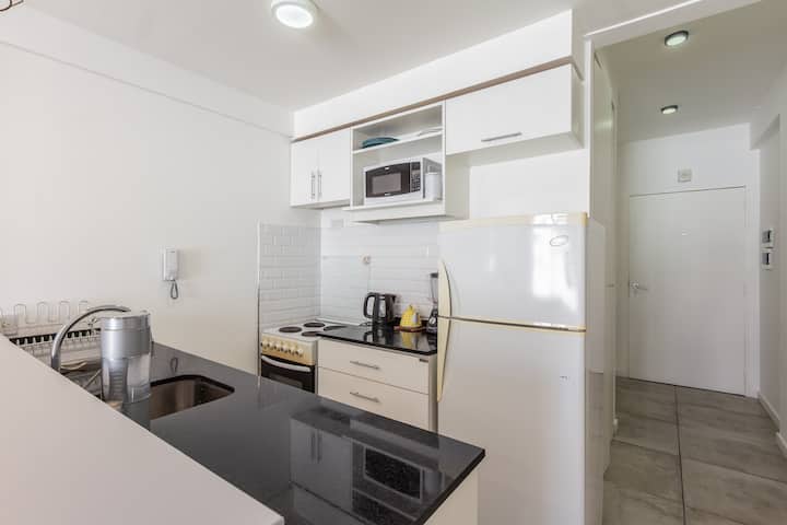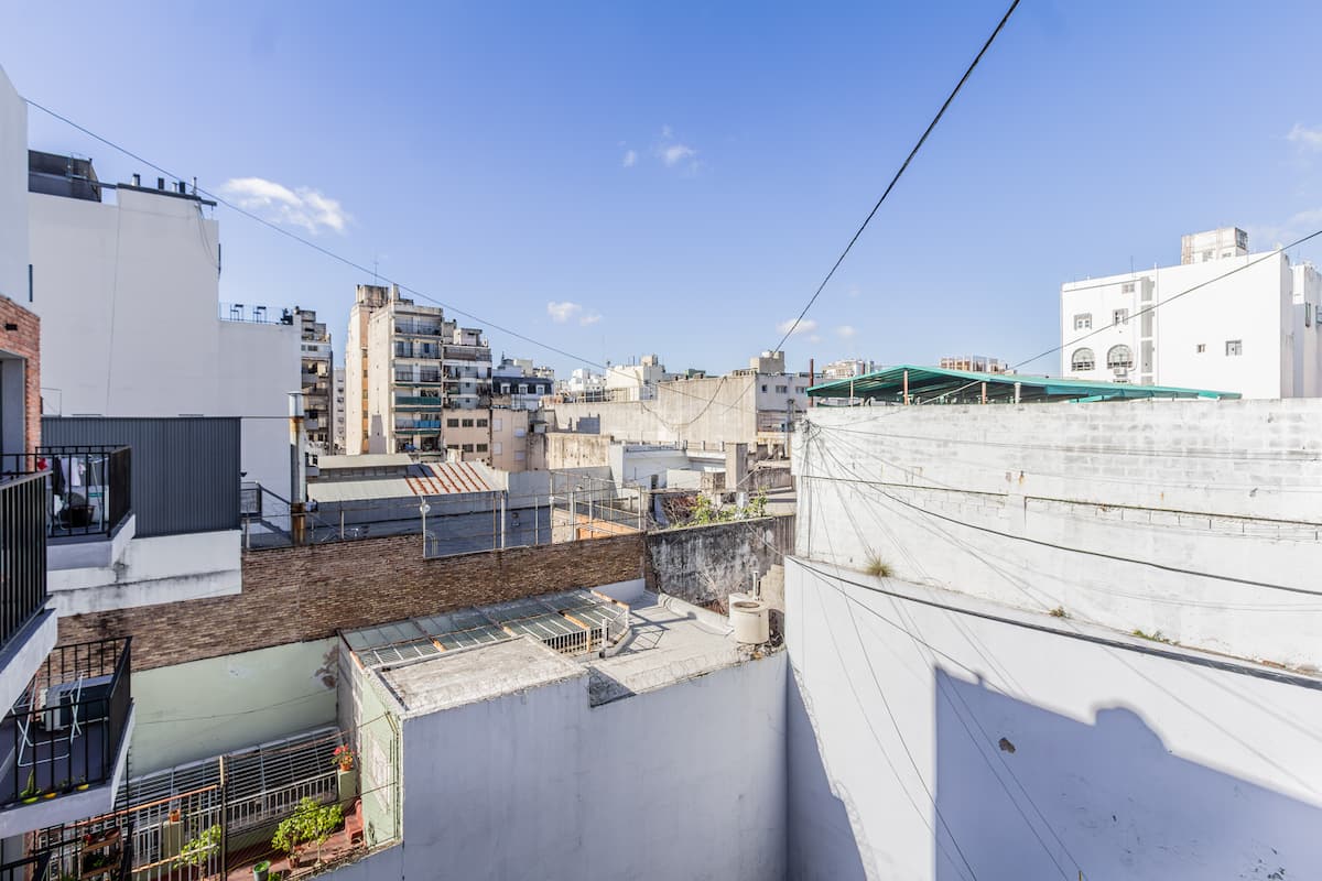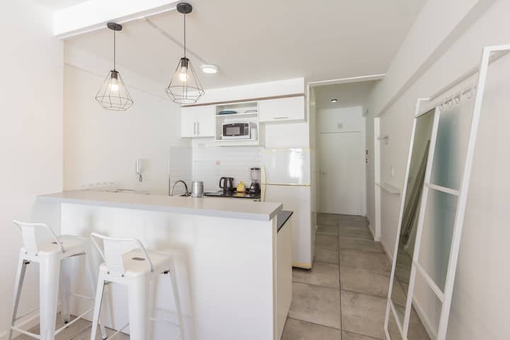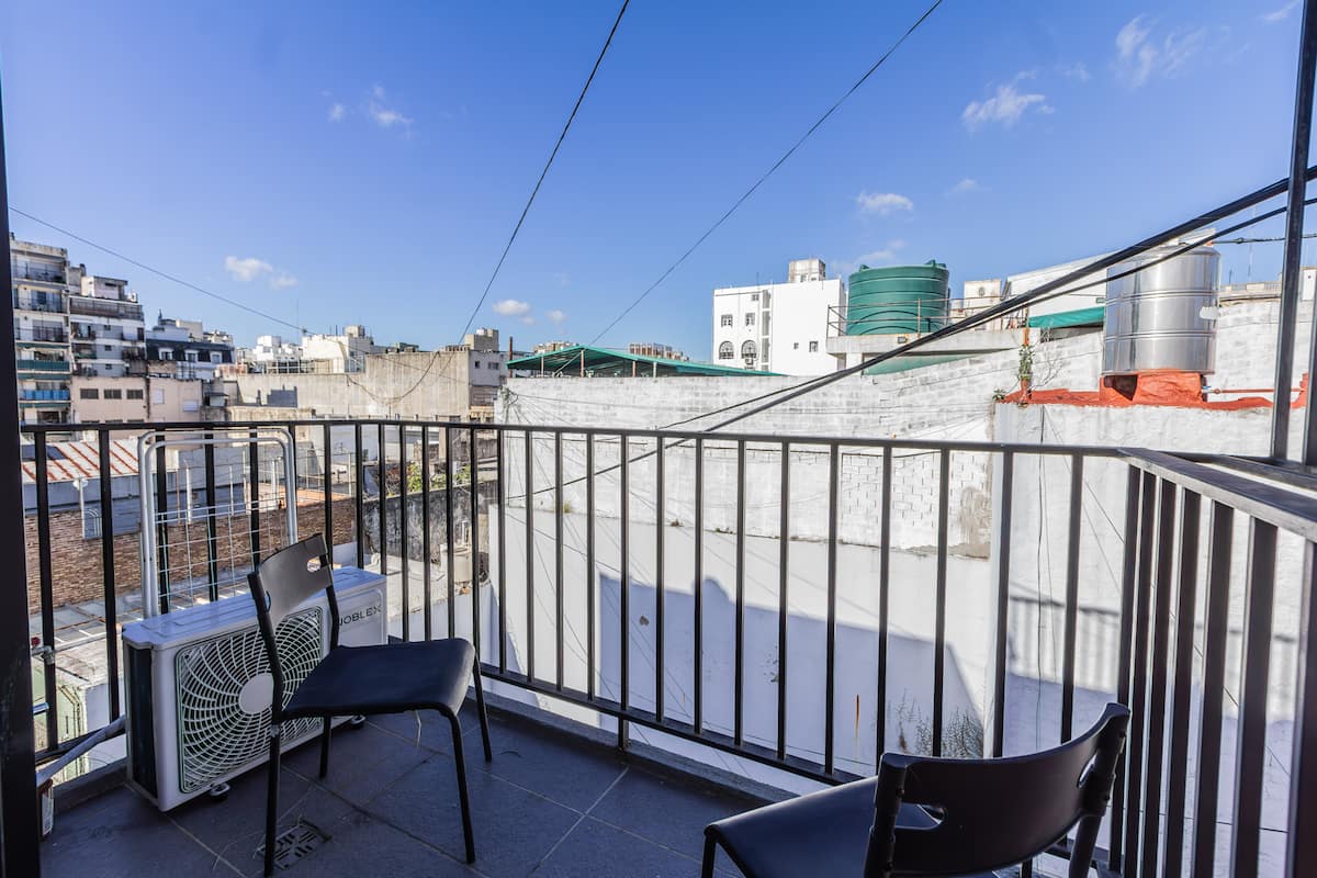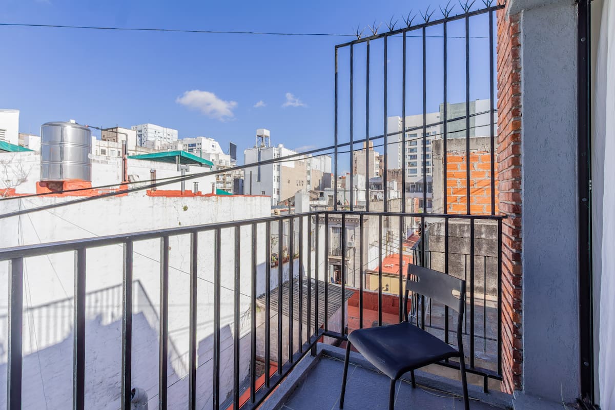 Квартира-студия в современном здании в Monserrat, рассчитанная на 1 спальню (2 человека), с балконом. В квартире есть полностью оборудованная кухня, обеденная зона, двуспальная кровать, телевизор с функциями Smart TV и Chromecast, кондиционер не указан. На крыше дома предусмотрена терраса с зоной отдыха, открытым душем и грилем, указано наличие бесплатной парковки в здании, включая место для фургонов. Упомянуты лифты и что здание моложе 5 лет, а также удобный доступ к метро и улице Defensa.