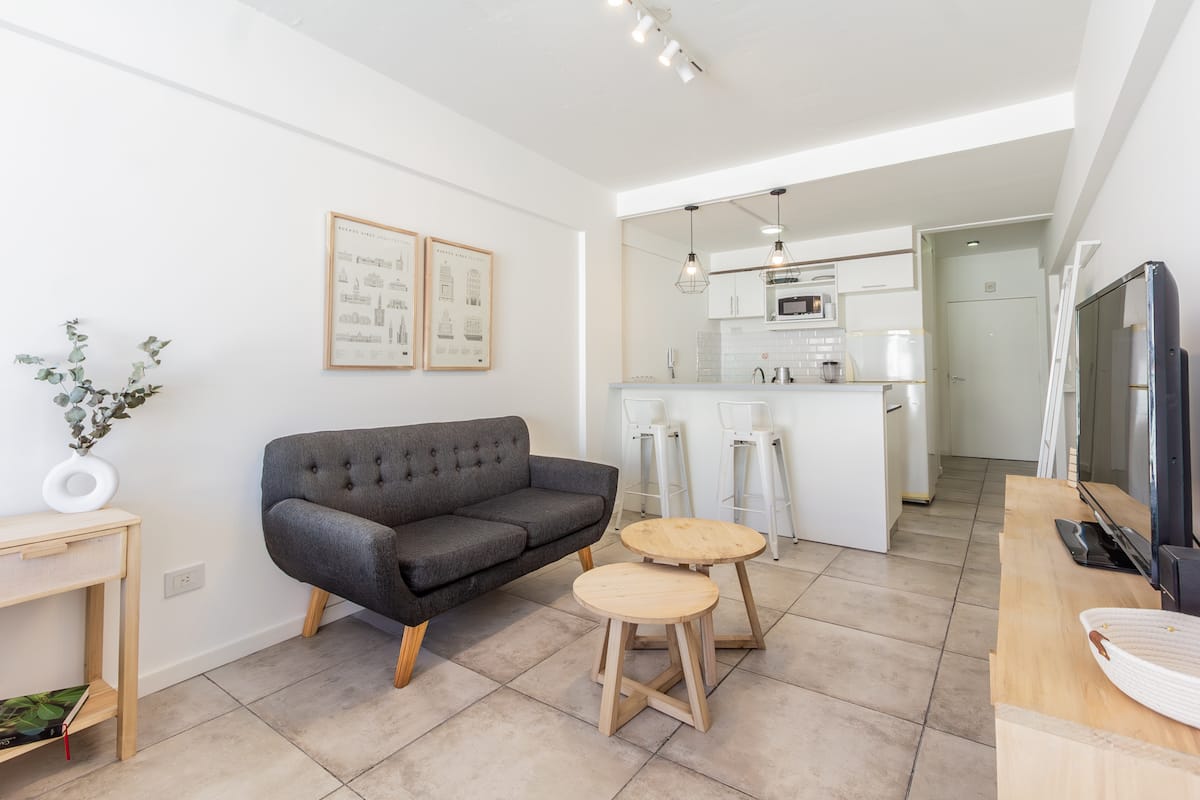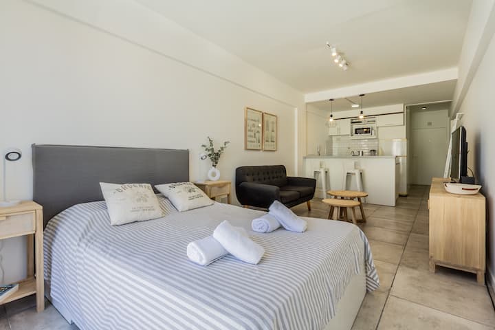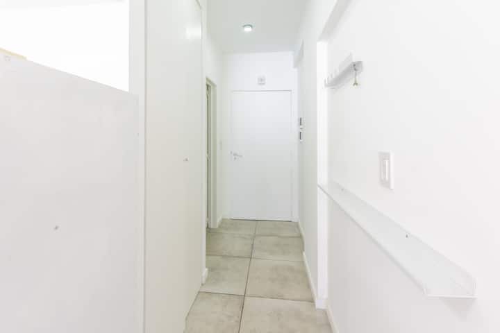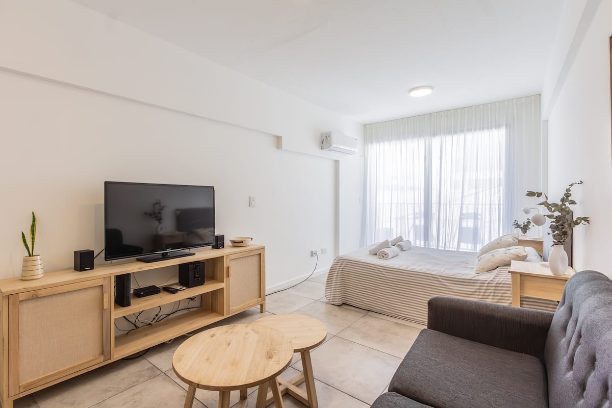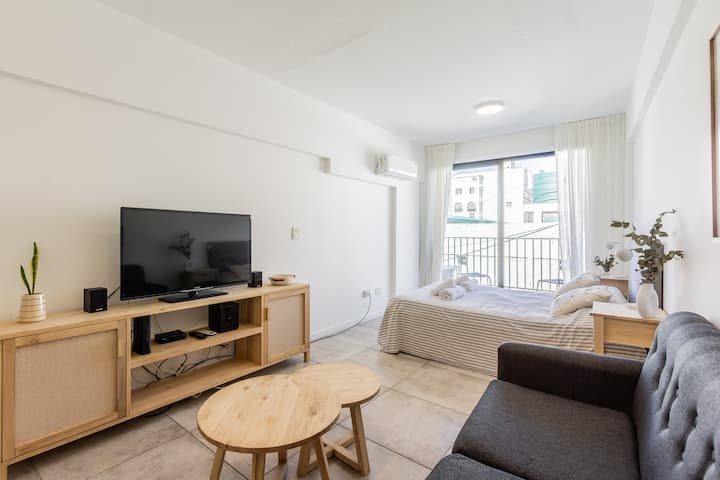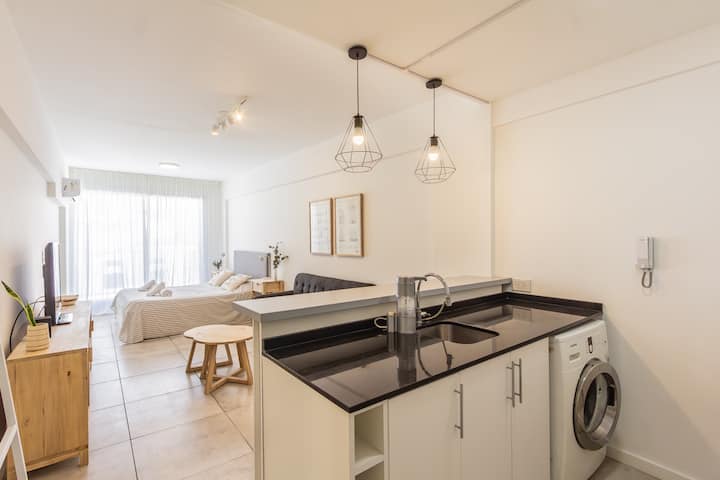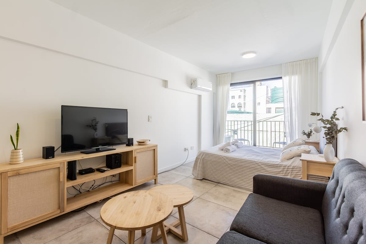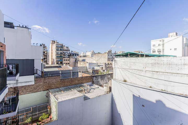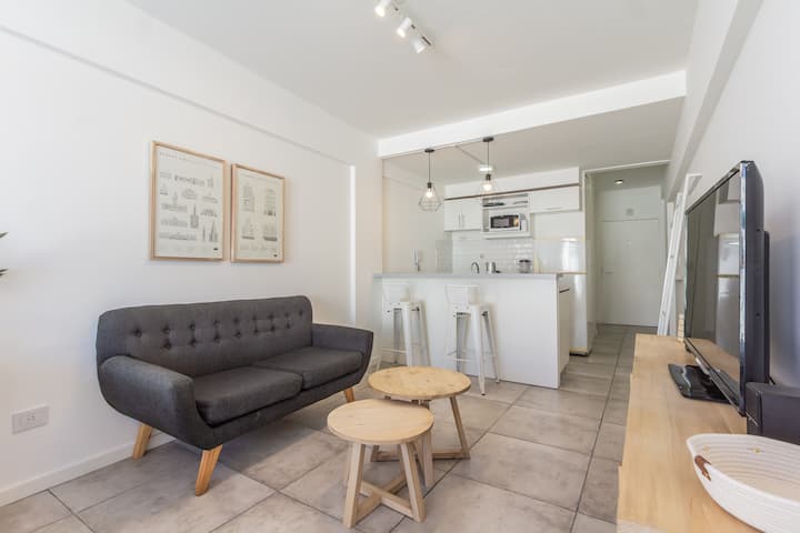 Квартира-студия в современном здании в Monserrat, рассчитанная на 1 спальню (2 человека), с балконом. В квартире есть полностью оборудованная кухня, обеденная зона, двуспальная кровать, телевизор с функциями Smart TV и Chromecast, кондиционер не указан. На крыше дома предусмотрена терраса с зоной отдыха, открытым душем и грилем, указано наличие бесплатной парковки в здании, включая место для фургонов. Упомянуты лифты и что здание моложе 5 лет, а также удобный доступ к метро и улице Defensa.