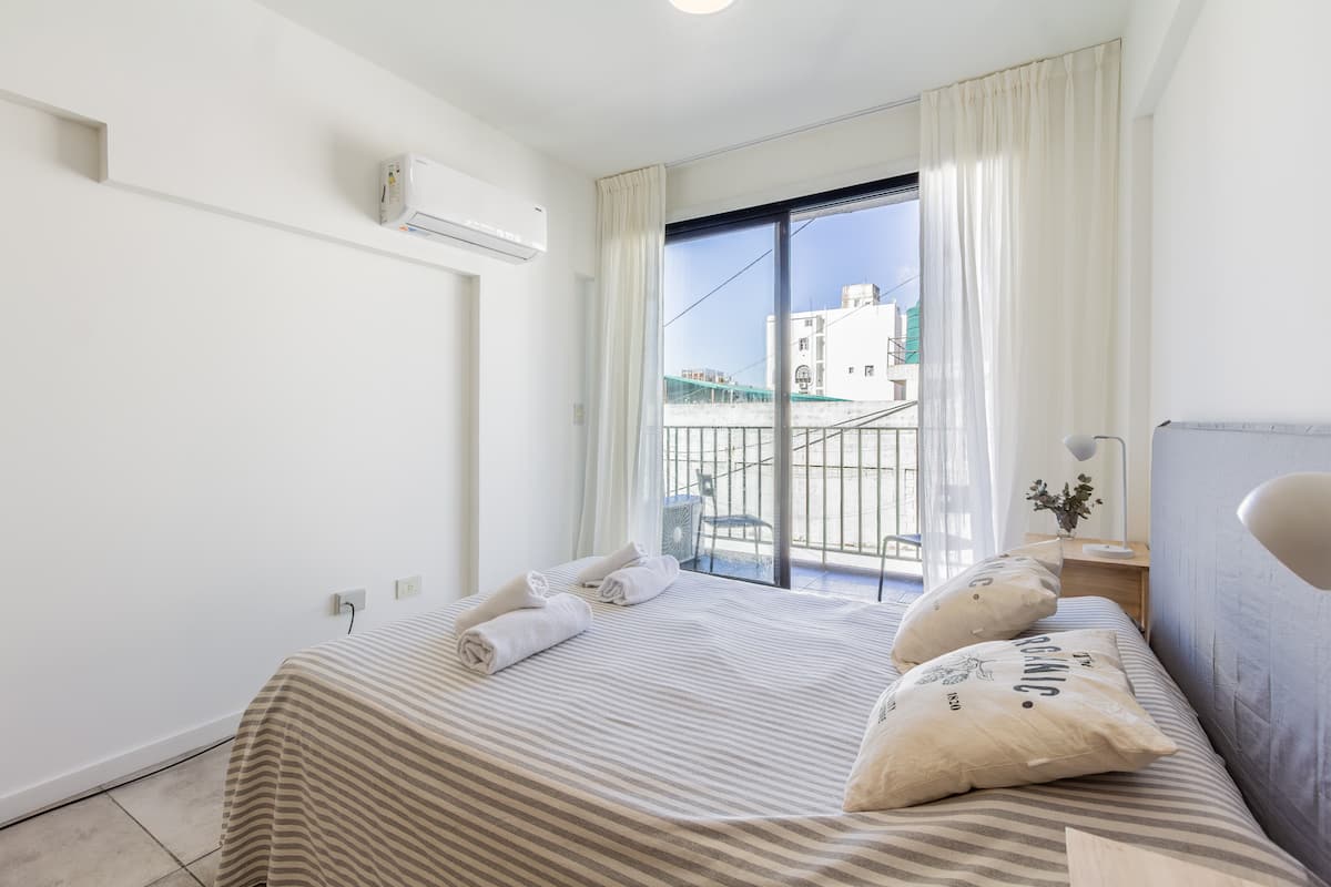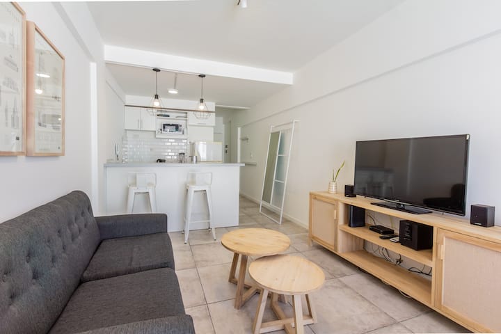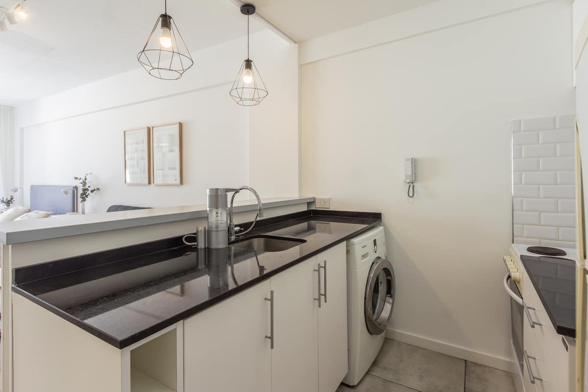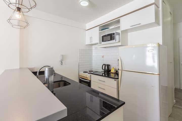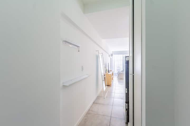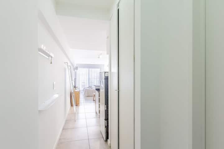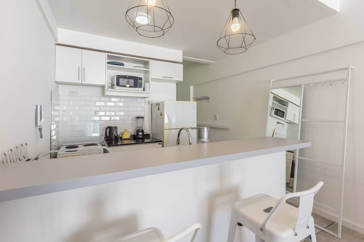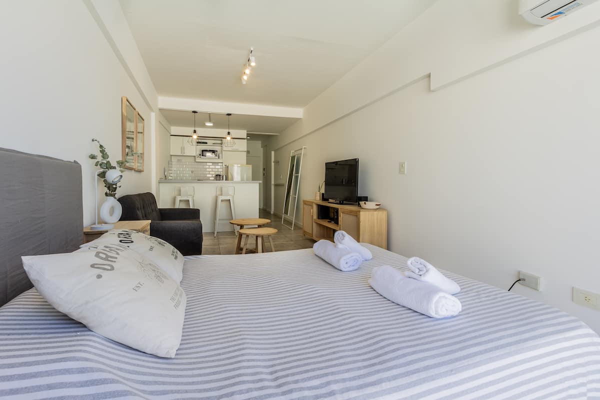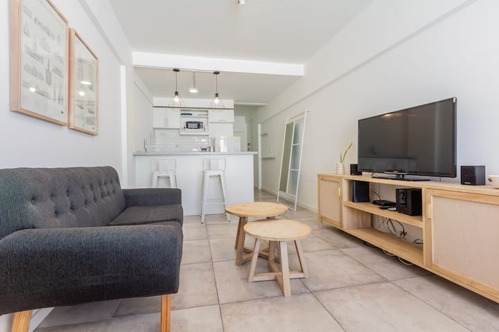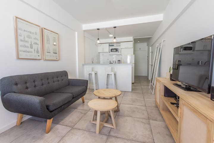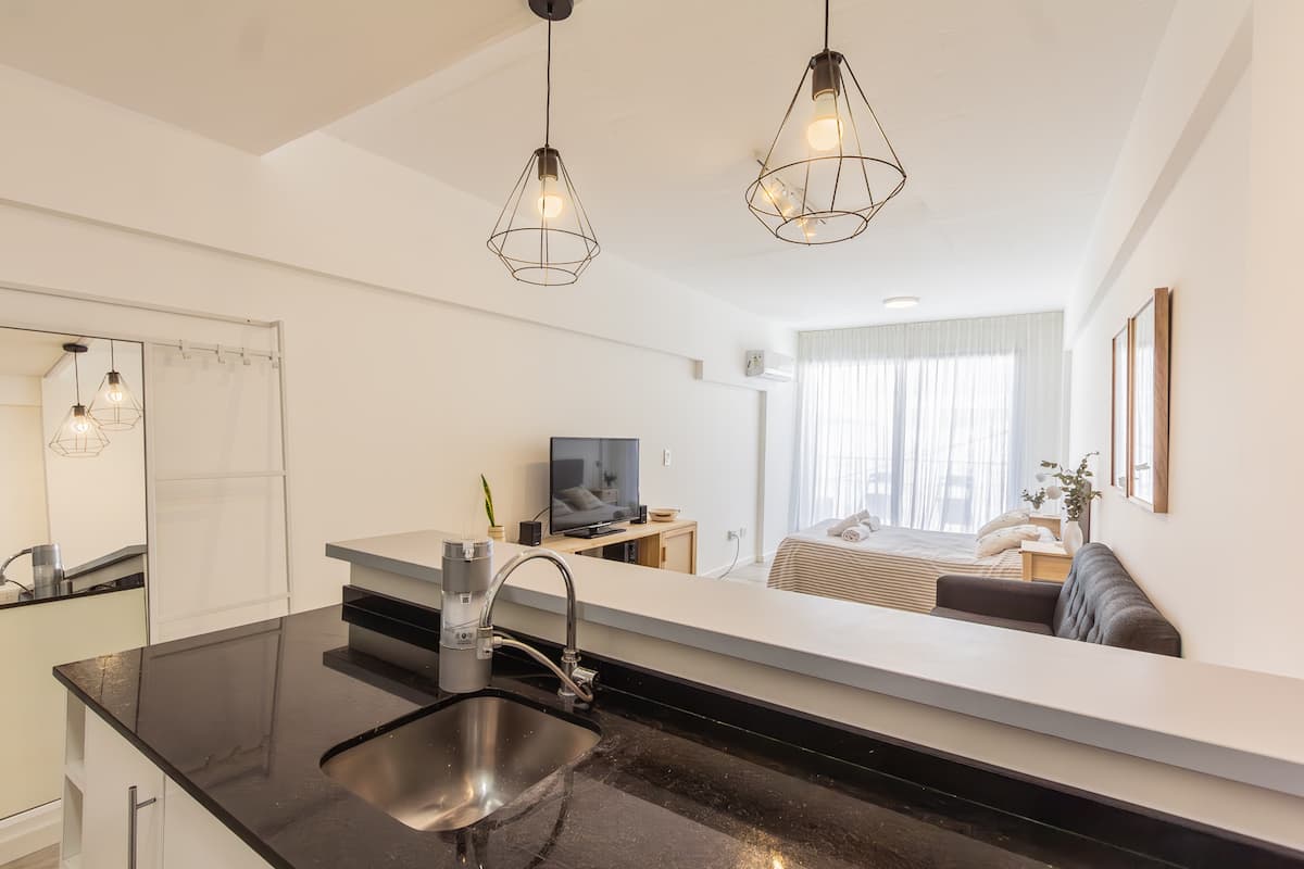 Квартира-студия в современном здании в Monserrat, рассчитанная на 1 спальню (2 человека), с балконом. В квартире есть полностью оборудованная кухня, обеденная зона, двуспальная кровать, телевизор с функциями Smart TV и Chromecast, кондиционер не указан. На крыше дома предусмотрена терраса с зоной отдыха, открытым душем и грилем, указано наличие бесплатной парковки в здании, включая место для фургонов. Упомянуты лифты и что здание моложе 5 лет, а также удобный доступ к метро и улице Defensa.