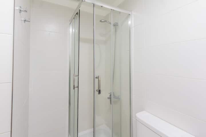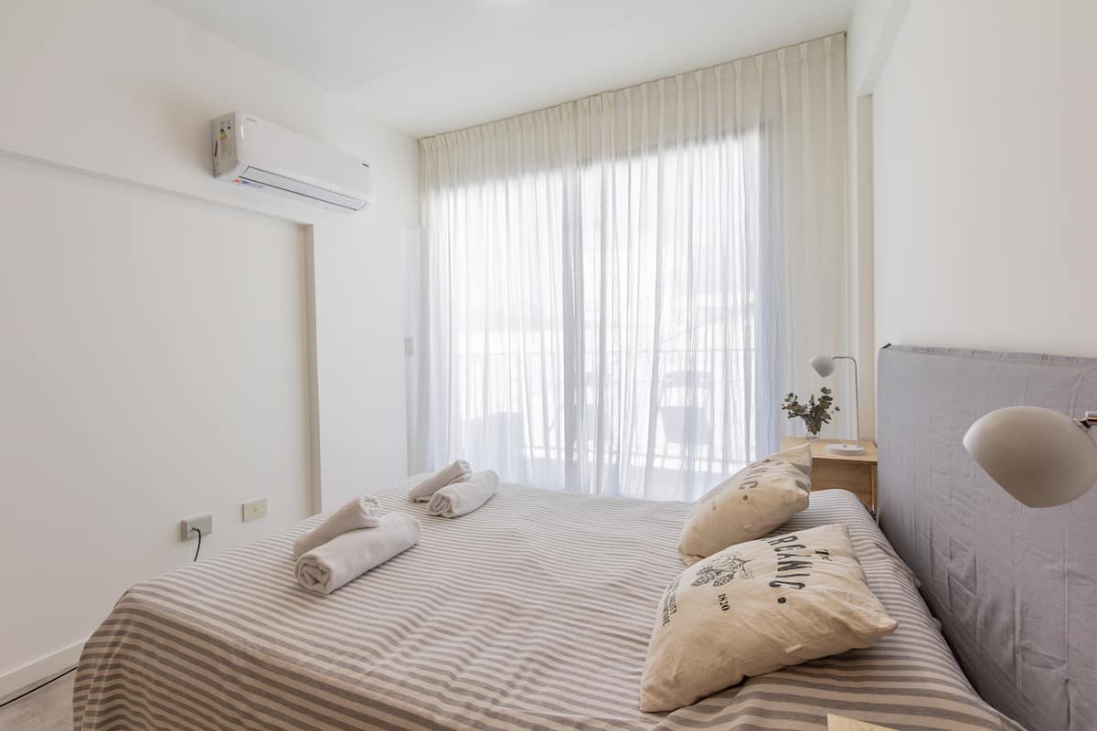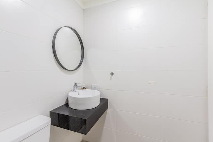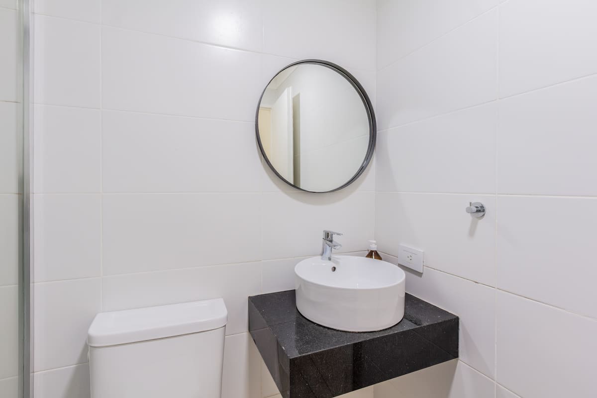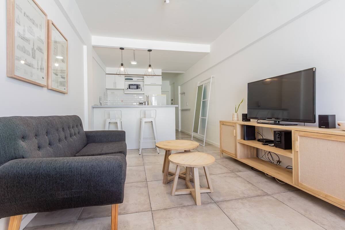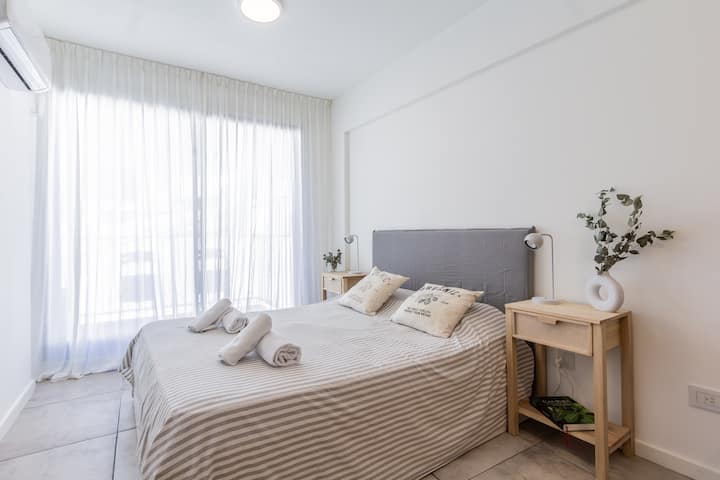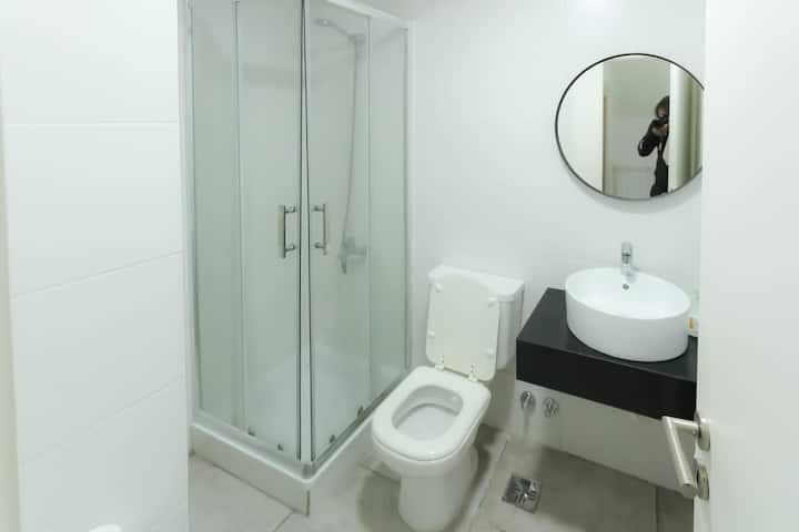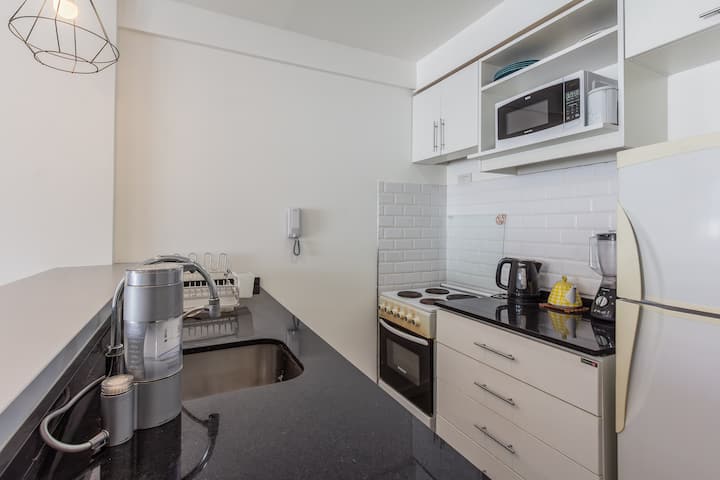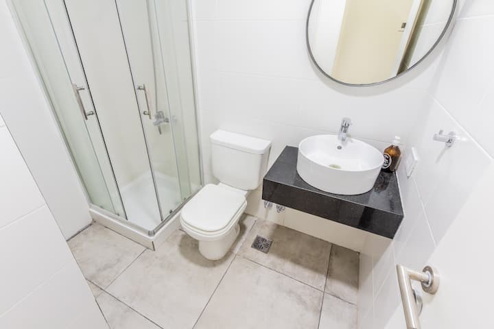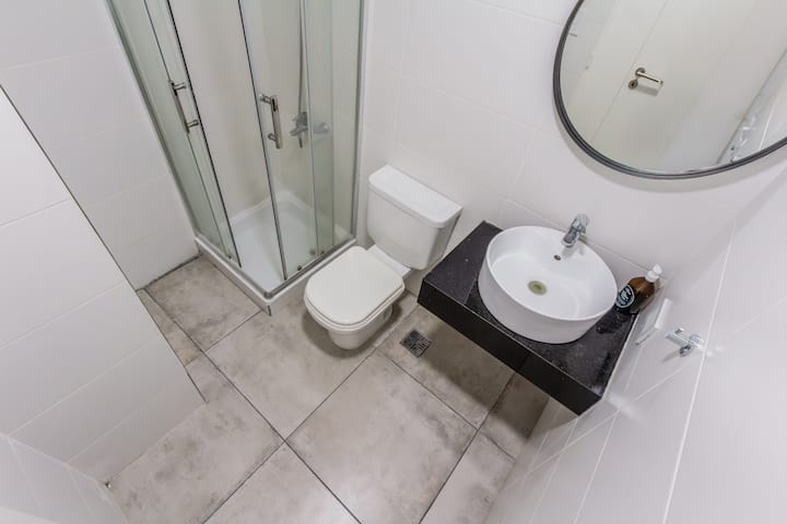 Квартира-студия в современном здании в Monserrat, рассчитанная на 1 спальню (2 человека), с балконом. В квартире есть полностью оборудованная кухня, обеденная зона, двуспальная кровать, телевизор с функциями Smart TV и Chromecast, кондиционер не указан. На крыше дома предусмотрена терраса с зоной отдыха, открытым душем и грилем, указано наличие бесплатной парковки в здании, включая место для фургонов. Упомянуты лифты и что здание моложе 5 лет, а также удобный доступ к метро и улице Defensa.