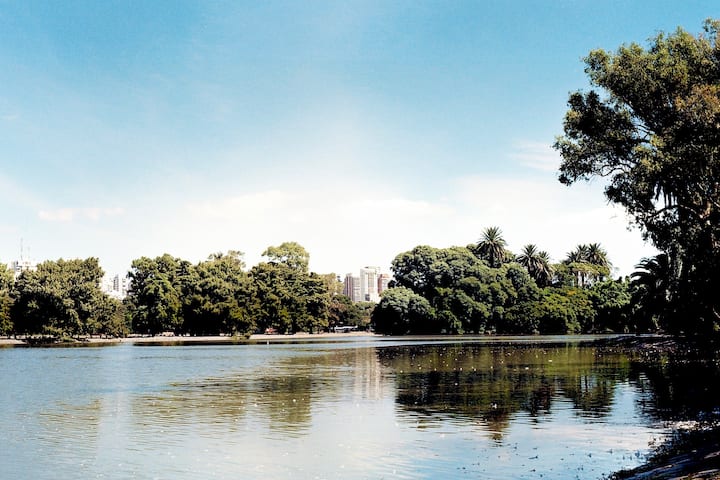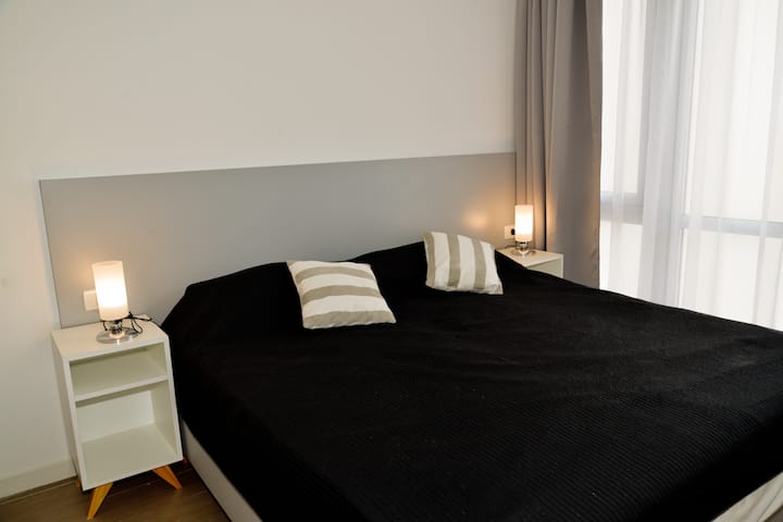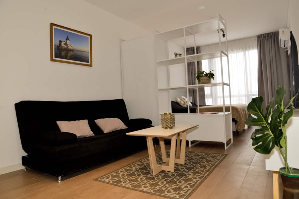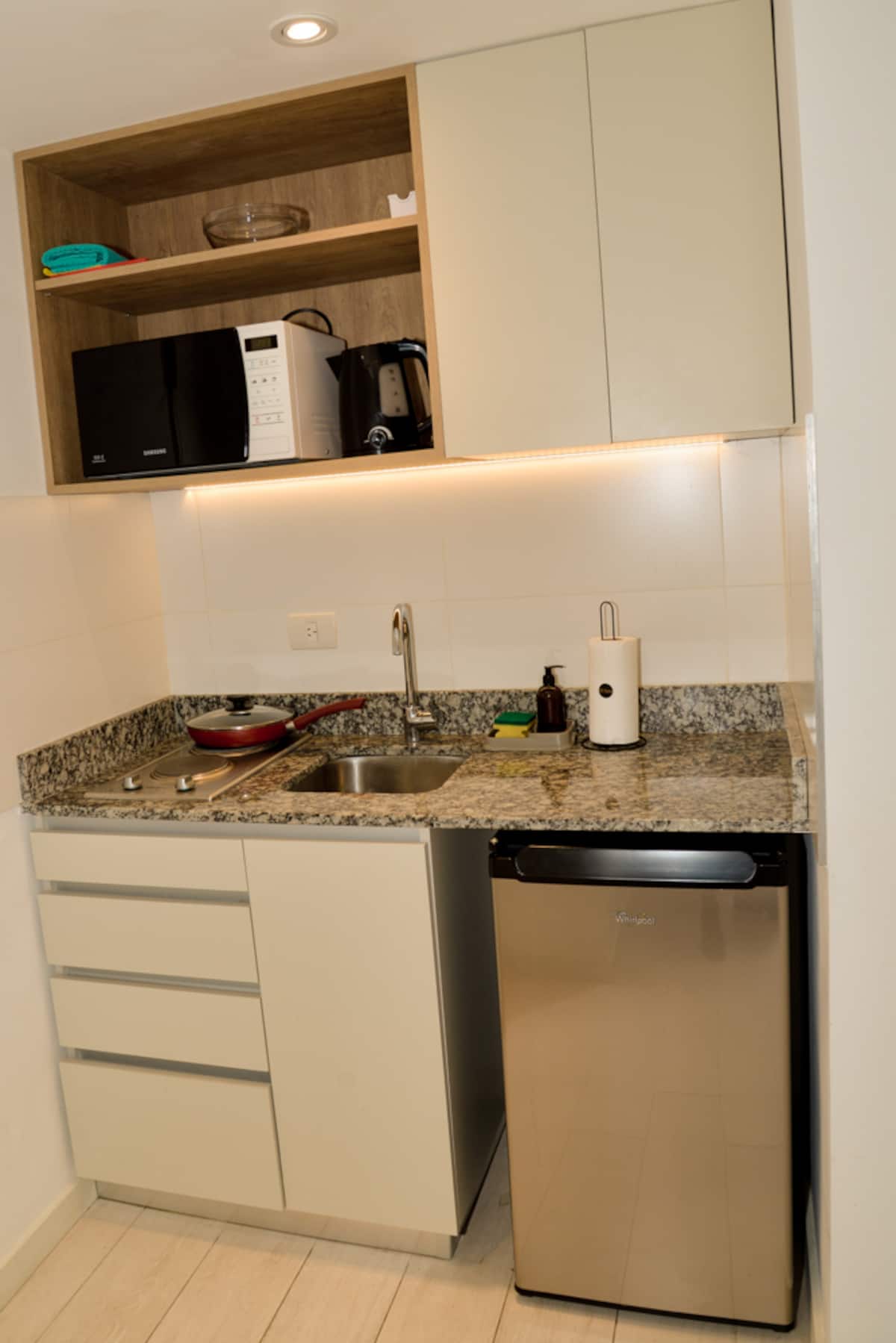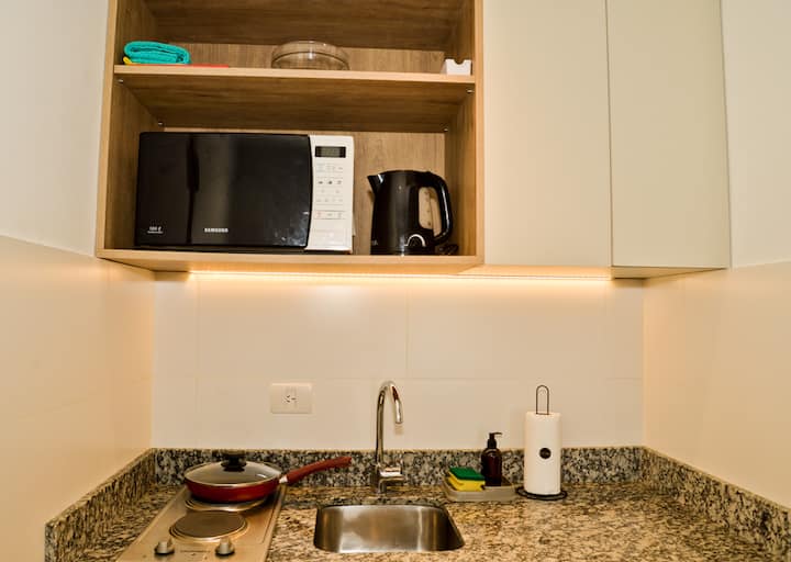 Квартира-студия в Núñez на Av Congreso, окна на улицу, с балконом. Площадь в описании не указана, парковочное место расположено в крытом гараже; высота въезда 2,10 м. В квартире есть Smart TV с Netflix, Wi‑Fi 300 мегабайт, диван, постельное бельё и полотенца, кухня с 2 конфорками, холодильник, микроволновая гриль, а также полный набор посуды и кухонная утварь.