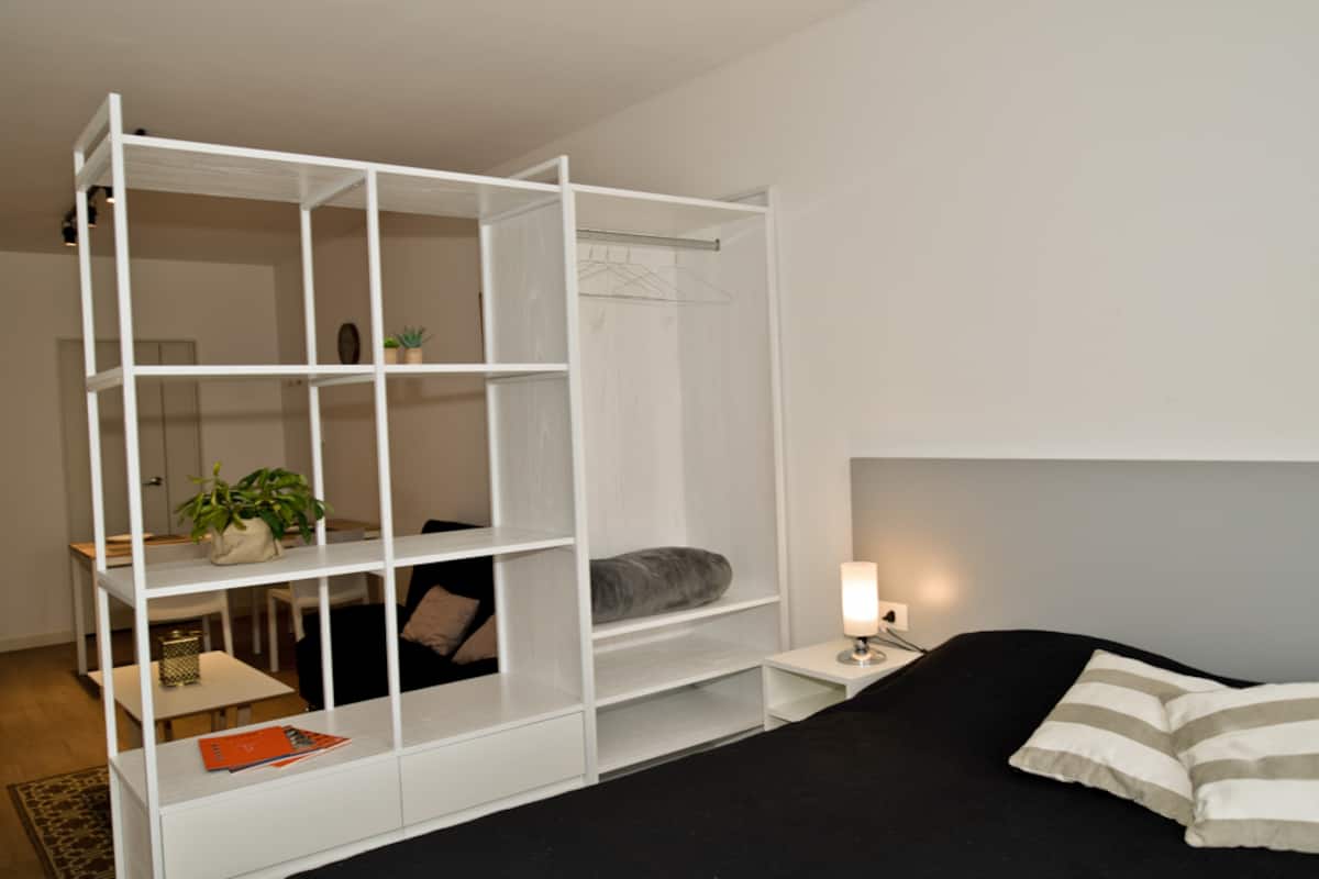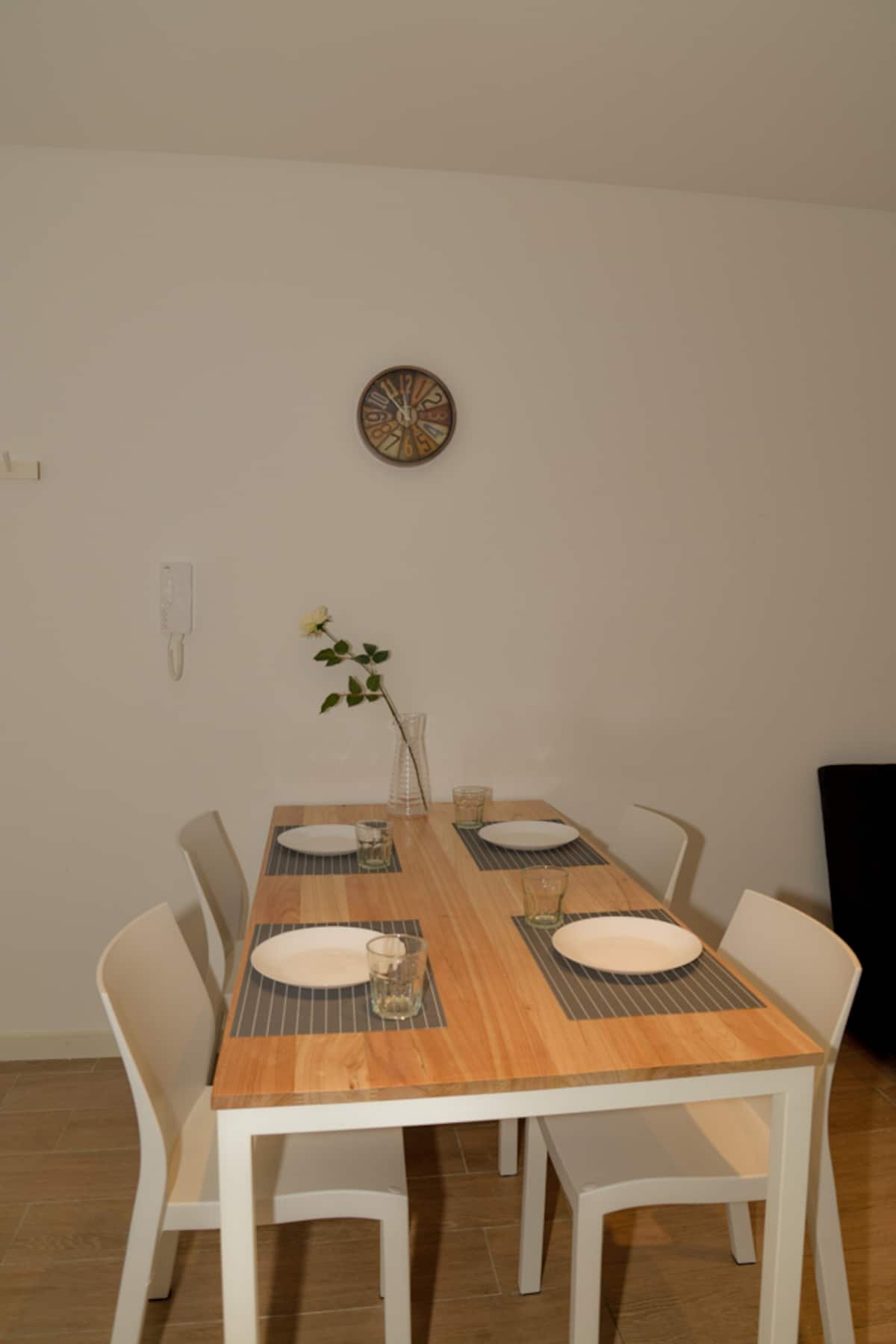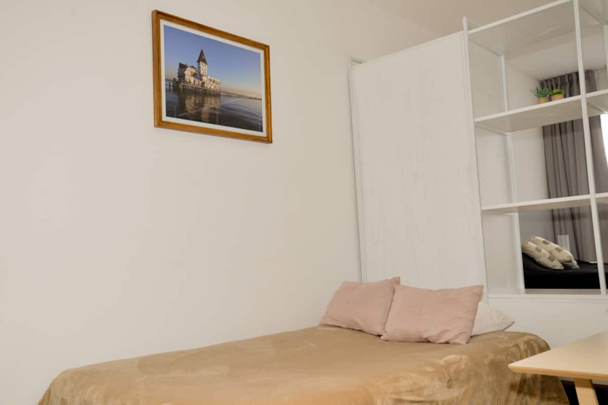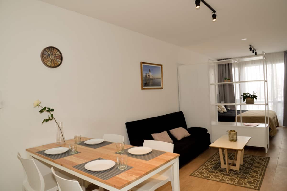 Квартира-студия в Núñez на Av Congreso, окна на улицу, с балконом. Площадь в описании не указана, парковочное место расположено в крытом гараже; высота въезда 2,10 м. В квартире есть Smart TV с Netflix, Wi‑Fi 300 мегабайт, диван, постельное бельё и полотенца, кухня с 2 конфорками, холодильник, микроволновая гриль, а также полный набор посуды и кухонная утварь.