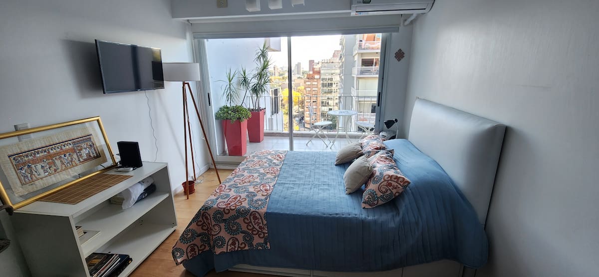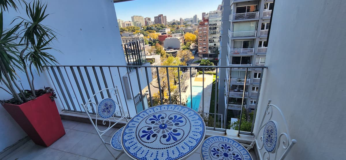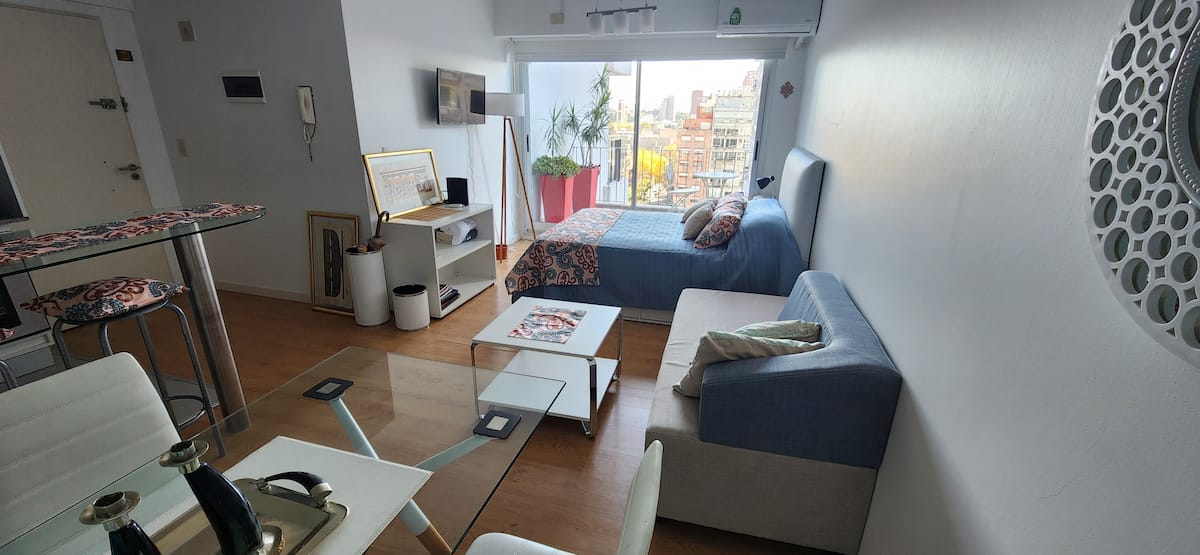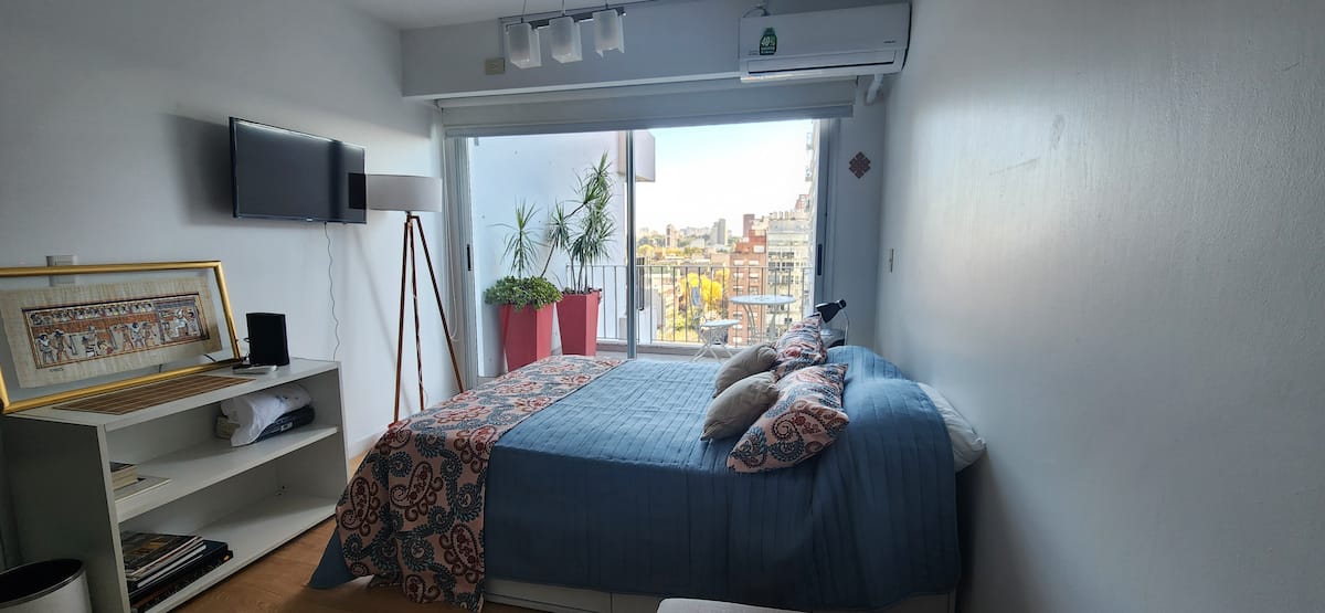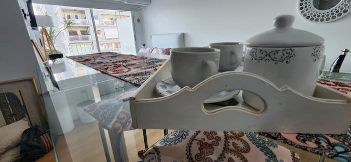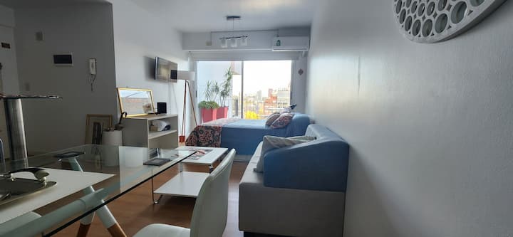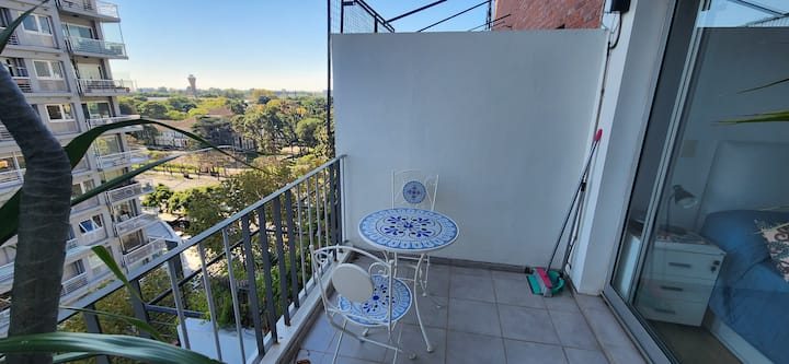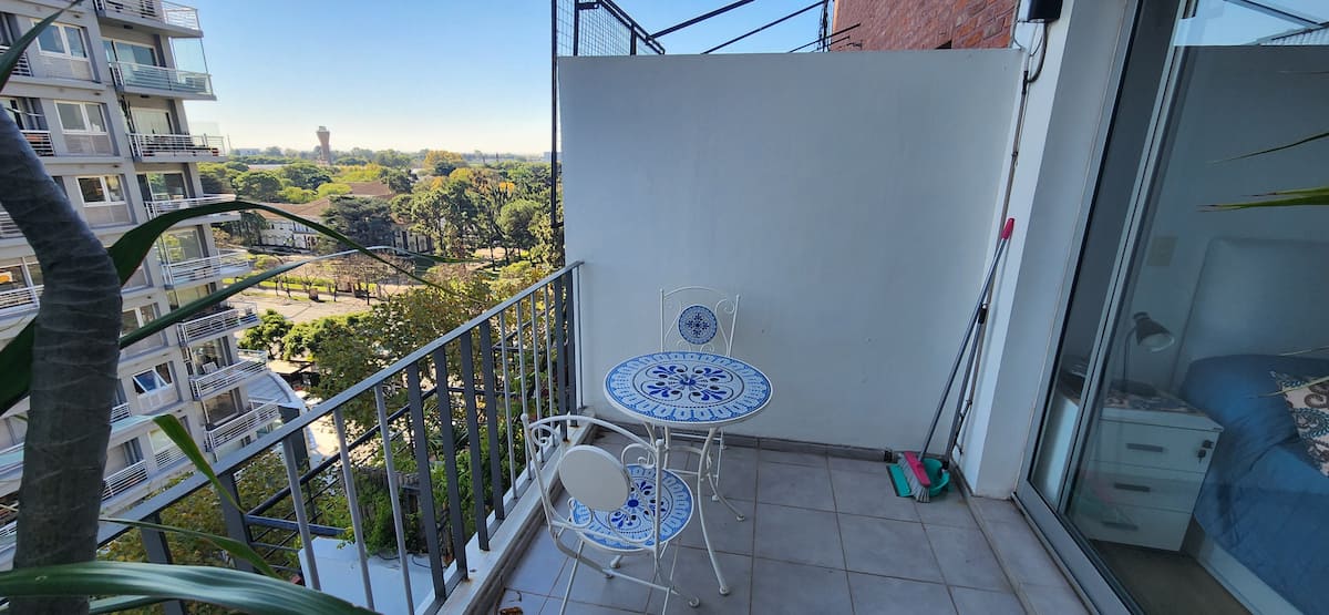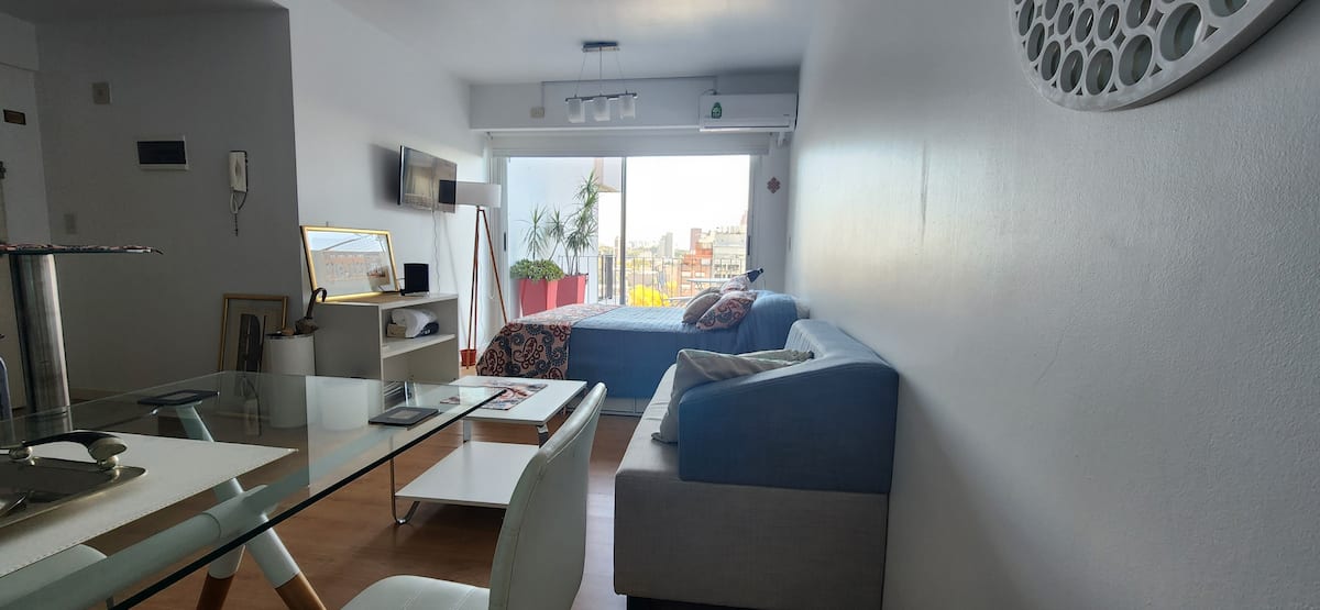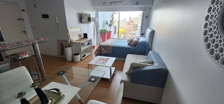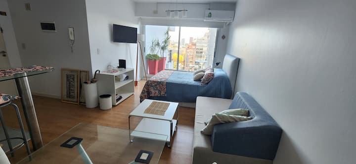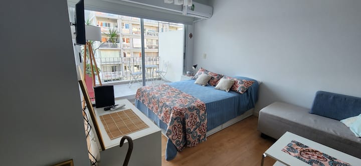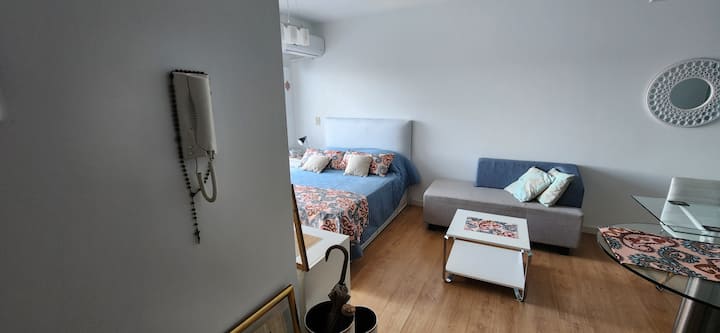 Квартира-студия в Núñez с мебелью и балконом. В студии есть зона отдыха с диваном-кроватью и обеденный стол на 4 человека. Кухня оборудована холодильником, духовкой и микроволновой печью, санузел с полотенцами и базовыми туалетными принадлежностями. Также предусмотрены кондиционер и высокоскоростной Wi‑Fi.