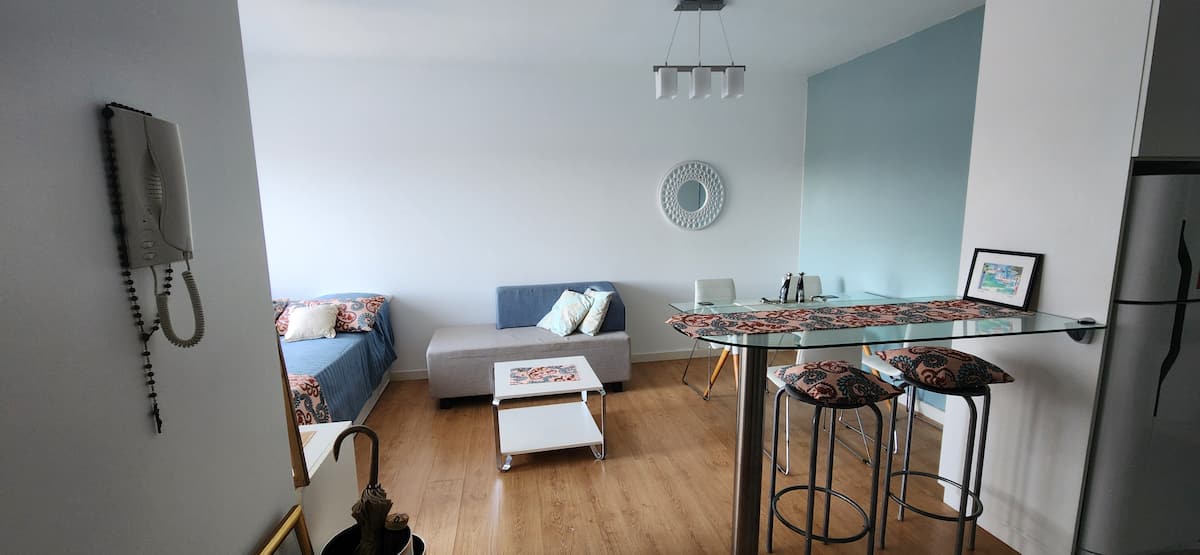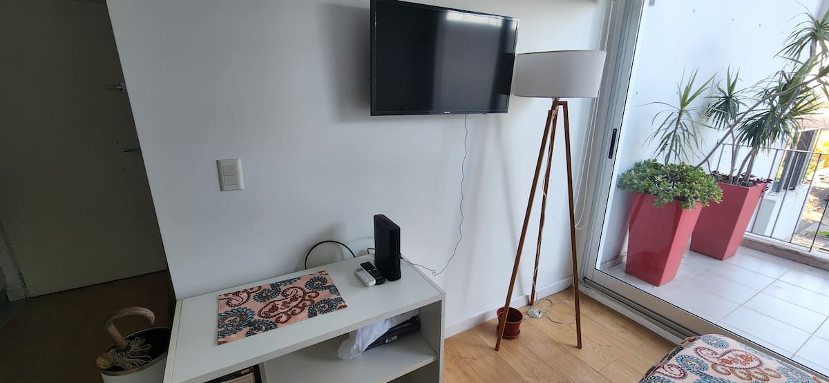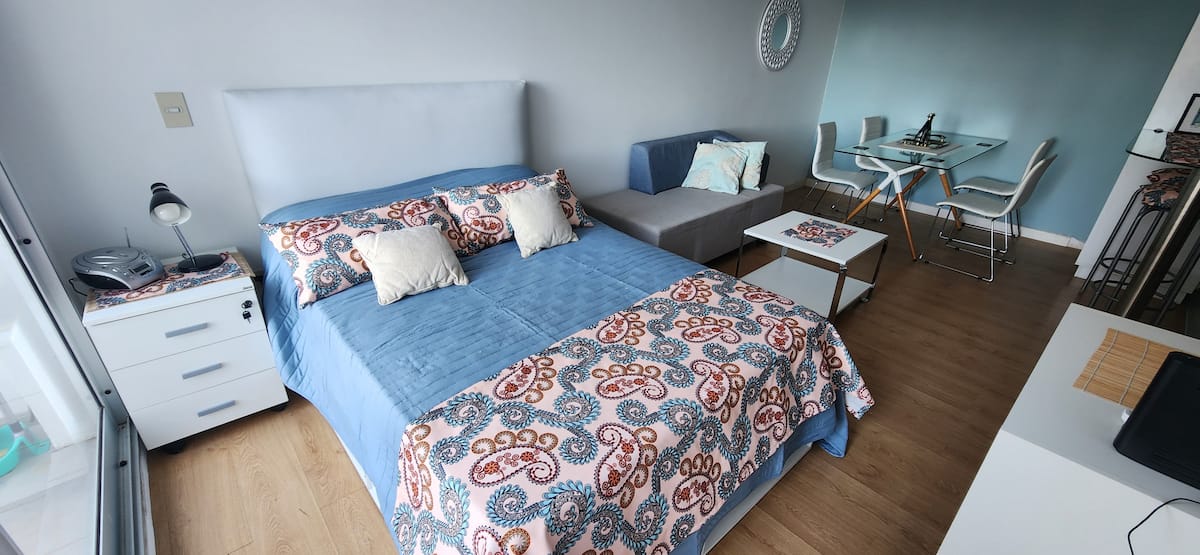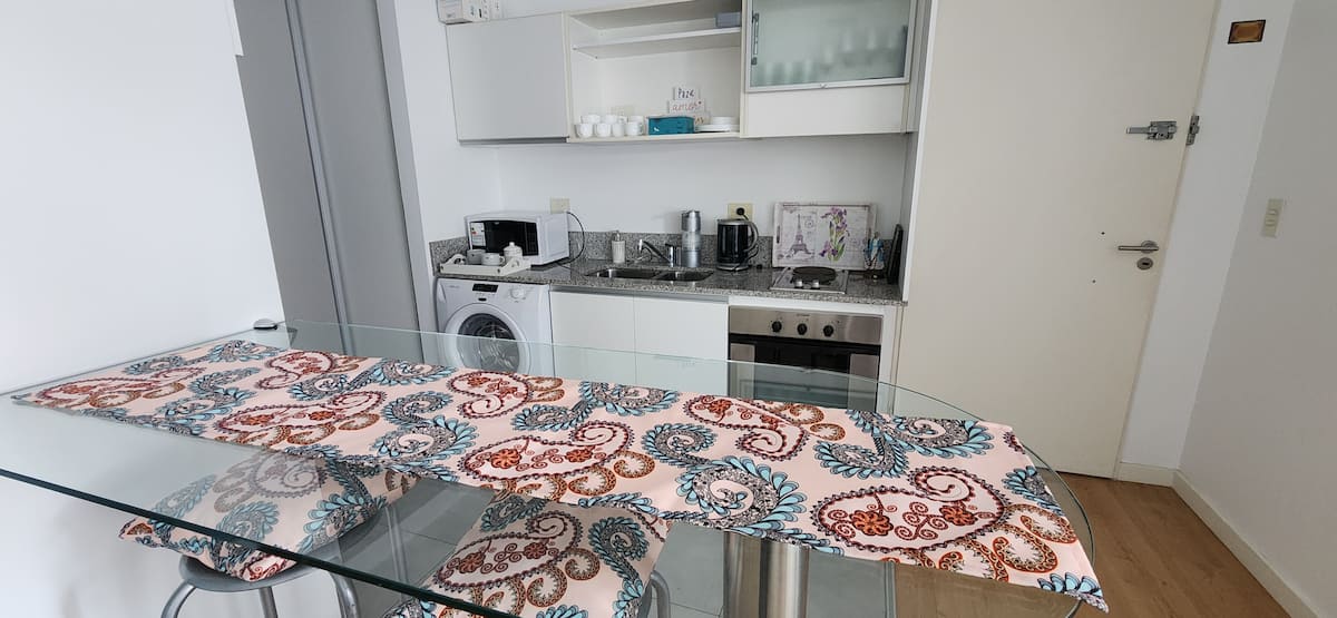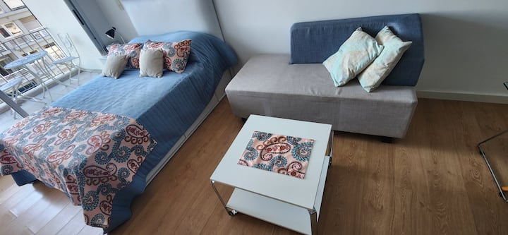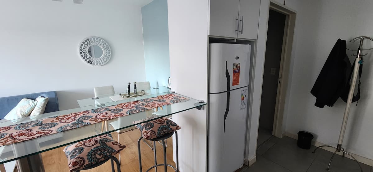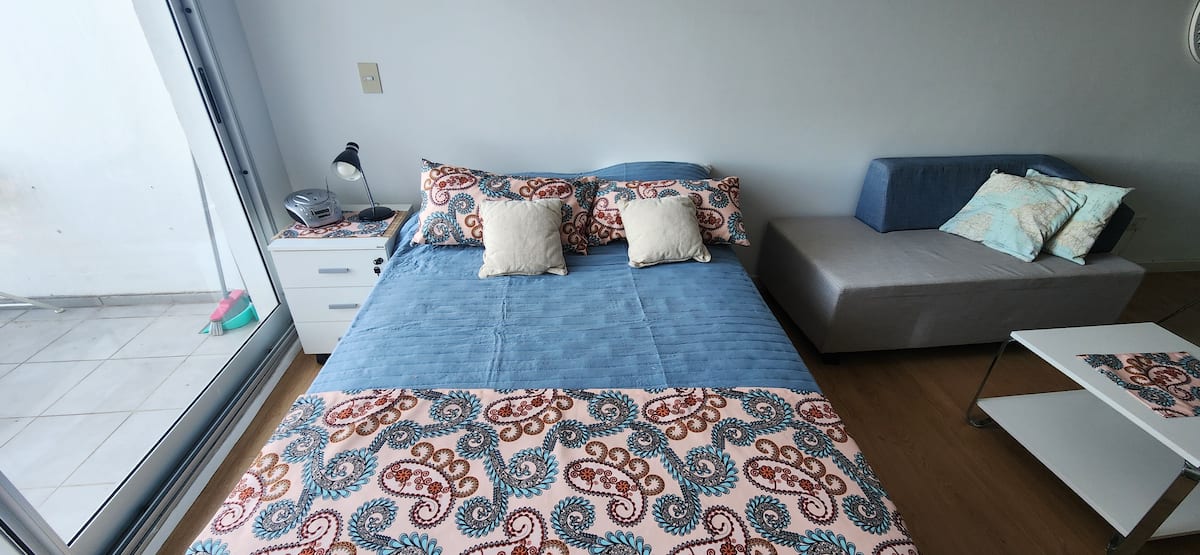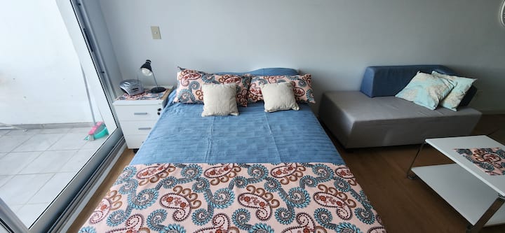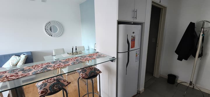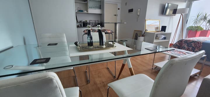 Квартира-студия в Núñez с мебелью и балконом. В студии есть зона отдыха с диваном-кроватью и обеденный стол на 4 человека. Кухня оборудована холодильником, духовкой и микроволновой печью, санузел с полотенцами и базовыми туалетными принадлежностями. Также предусмотрены кондиционер и высокоскоростной Wi‑Fi.