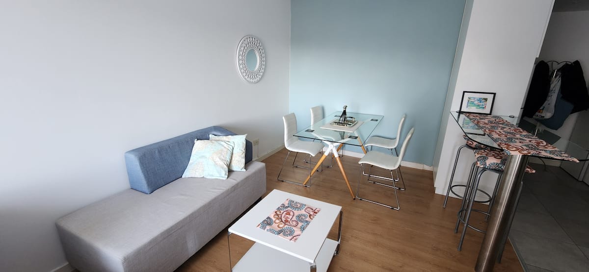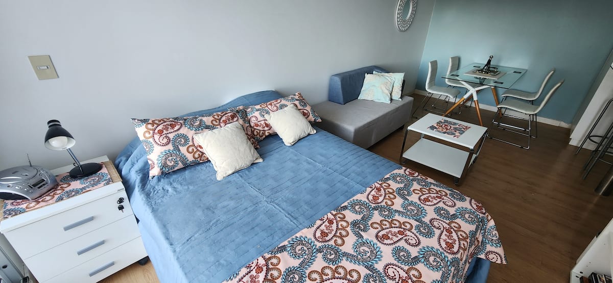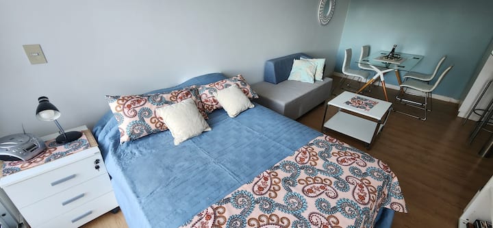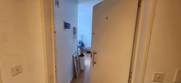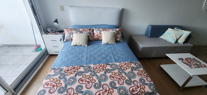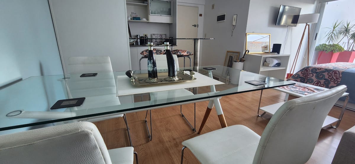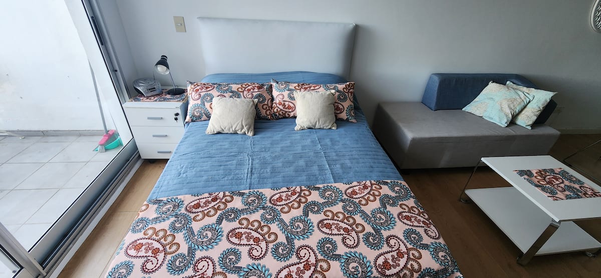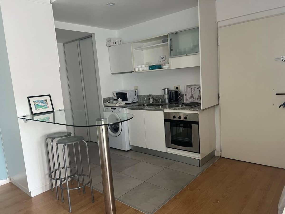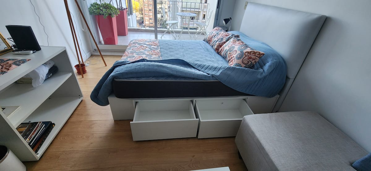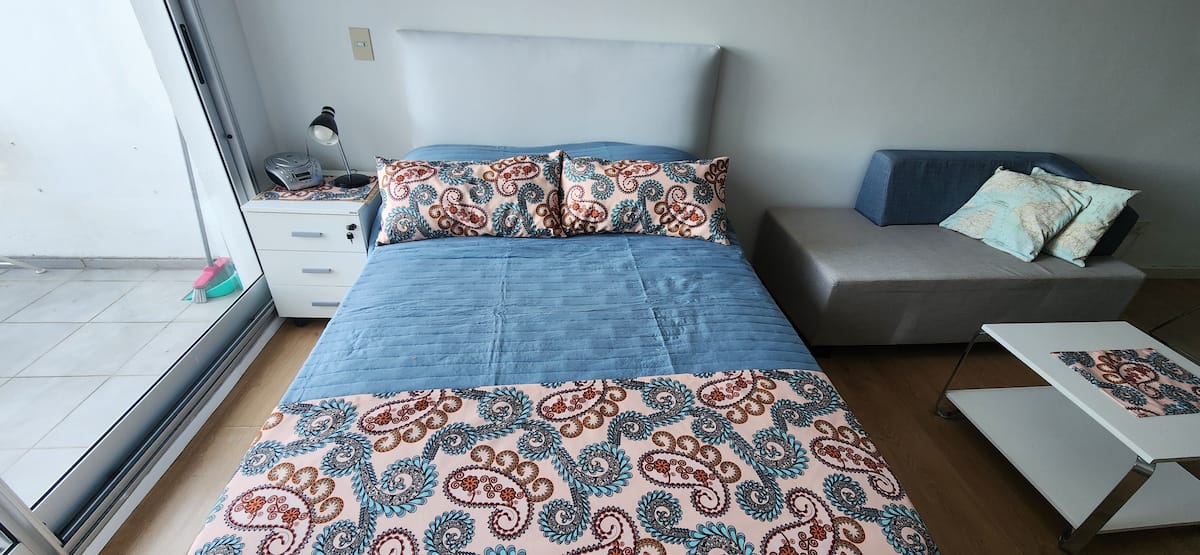 Квартира-студия в Núñez с мебелью и балконом. В студии есть зона отдыха с диваном-кроватью и обеденный стол на 4 человека. Кухня оборудована холодильником, духовкой и микроволновой печью, санузел с полотенцами и базовыми туалетными принадлежностями. Также предусмотрены кондиционер и высокоскоростной Wi‑Fi.
