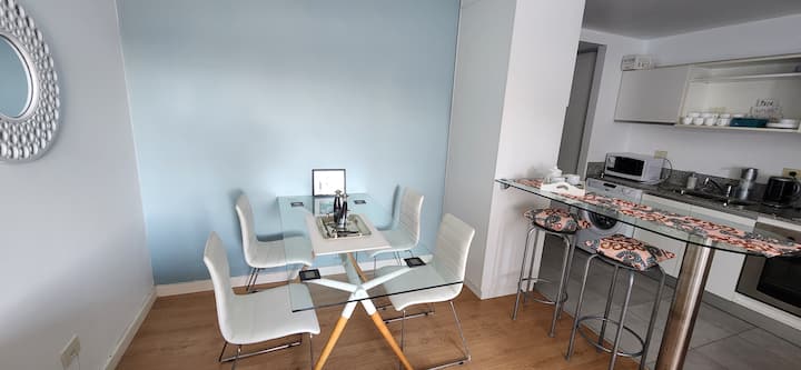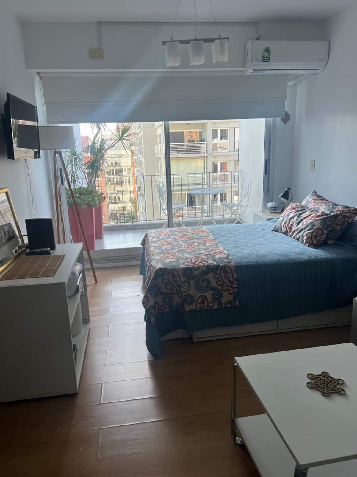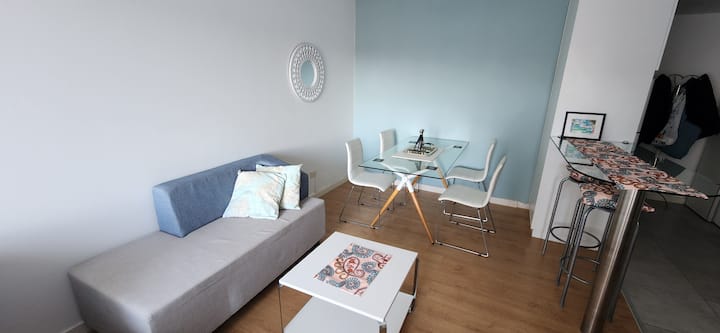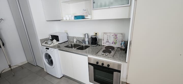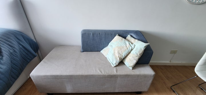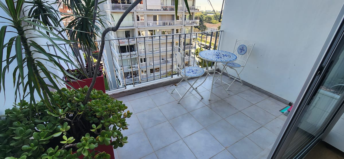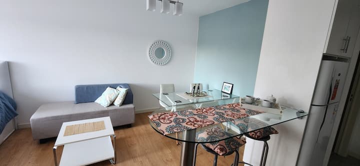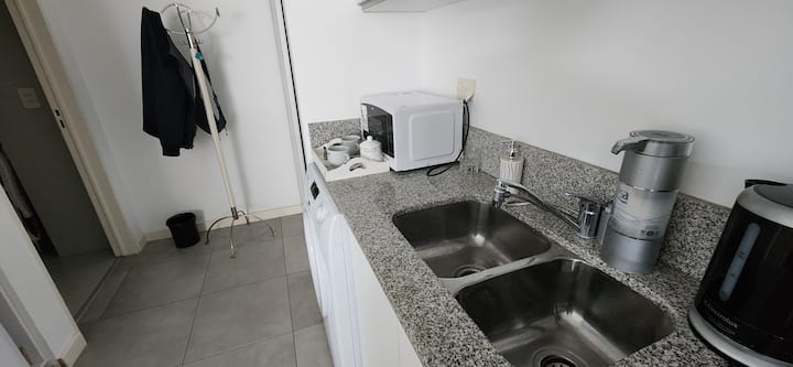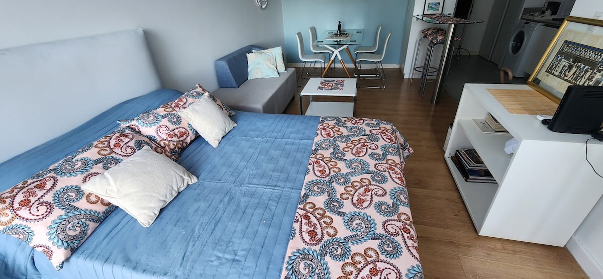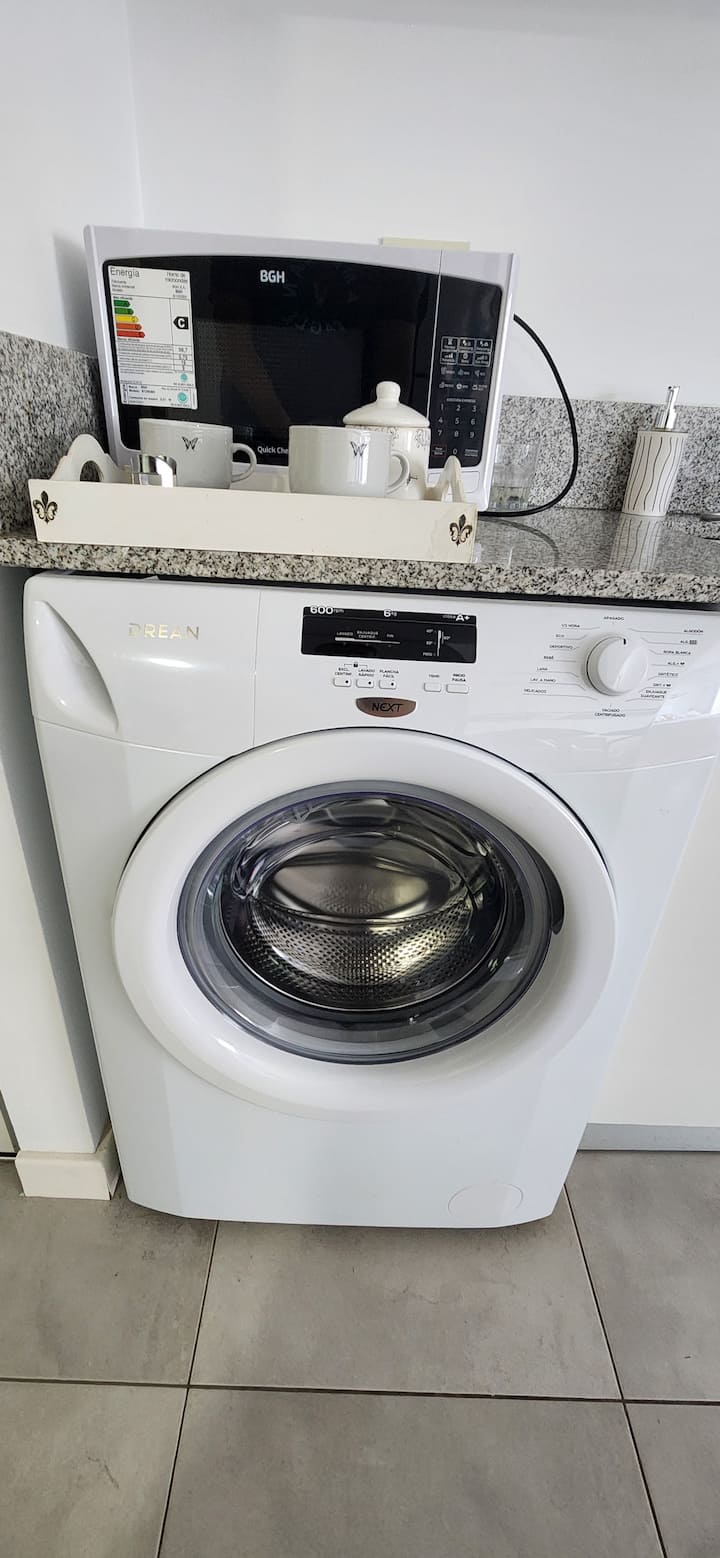 Квартира-студия в Núñez с мебелью и балконом. В студии есть зона отдыха с диваном-кроватью и обеденный стол на 4 человека. Кухня оборудована холодильником, духовкой и микроволновой печью, санузел с полотенцами и базовыми туалетными принадлежностями. Также предусмотрены кондиционер и высокоскоростной Wi‑Fi.