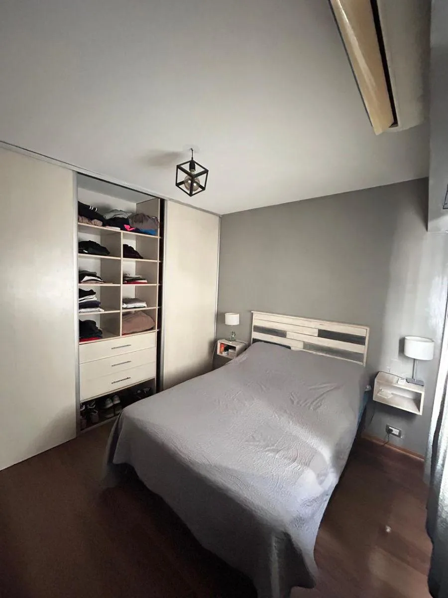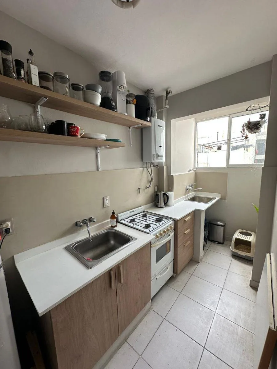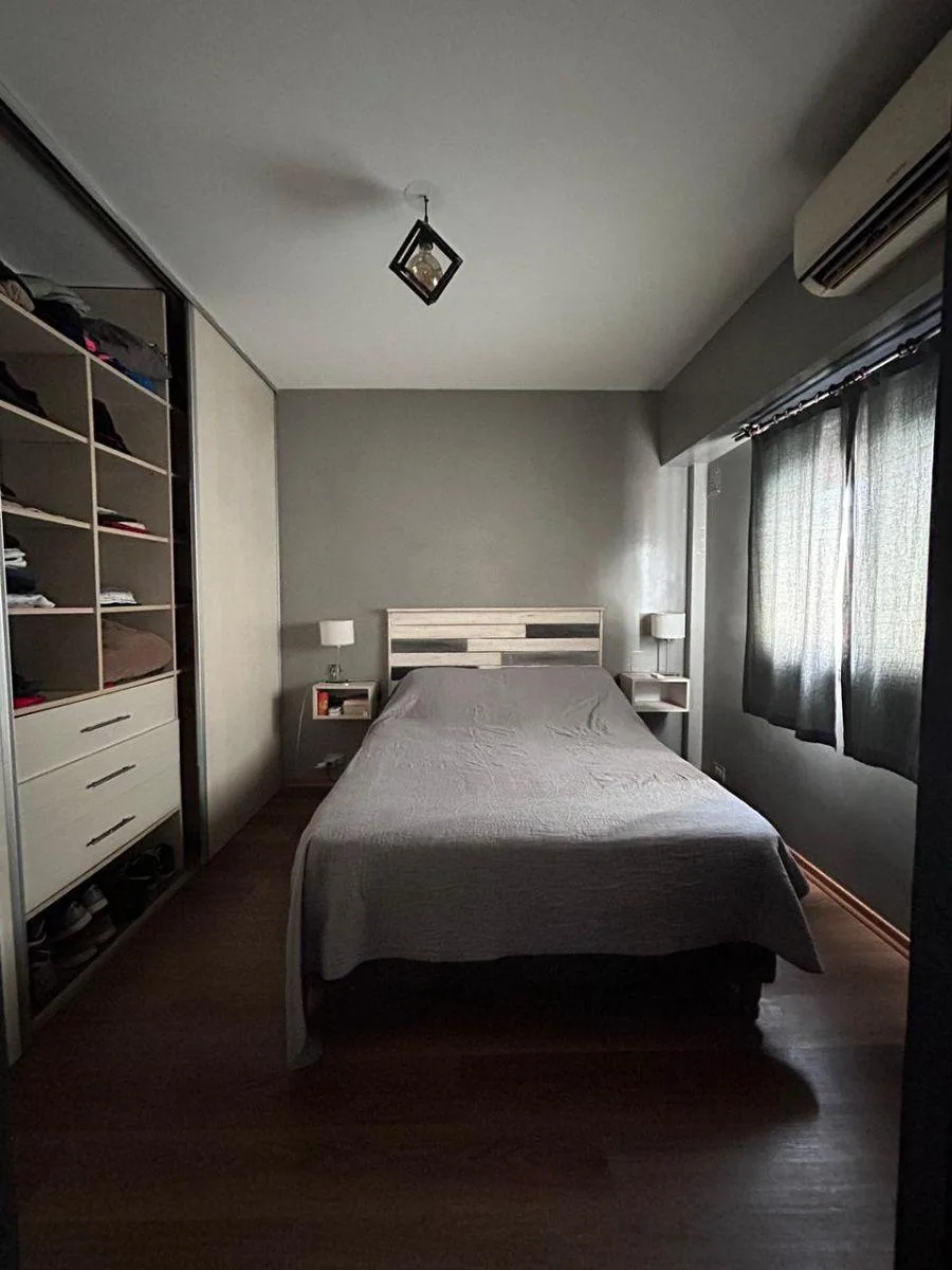 Квартира из 2 комнат (1 спальня) площадью 2 ambientes после ремонта, на 2-м этаже без лифта, вход по лестнице. Окна выходят во внешний проём: в кухне-гостиной интегрированный кухонный блок с новыми тумбами под столешницей и стеллажами, есть установленный кондиционер. Спальня с встроенным гардеробом до потолка. Ванная комната после ремонта с отделкой микробетоном; установлены светильники. Коммунальные платежи здания указаны как низкие; адрес: 3 de Febrero 3363, между Juana Azurduy y Núñez.