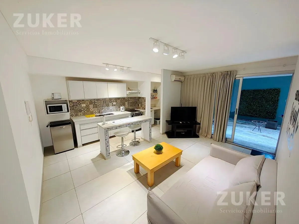 Квартира в Palermo (Las Cañitas) в формате «двух комнат», 55 m² крытых и 30 m² внутреннего двора, общая площадь 85 m². Полуэтаж с окнами во двор, с мебелью и оборудованием. В квартире гостиная-столовая с встроенной кухней, спальня с двойным проходом и видом во двор, отдельная прачечная с подключением для стиральной машины и выходом во двор, ванная комната с предзоной. Центральное горячее водоснабжение и отопление, кондиционер сплит (холод) в гостиной. В здании есть бассейн и зона гриля.