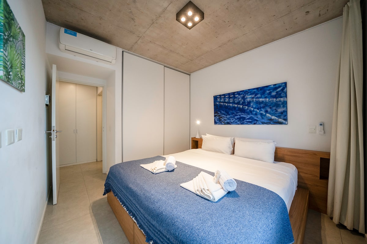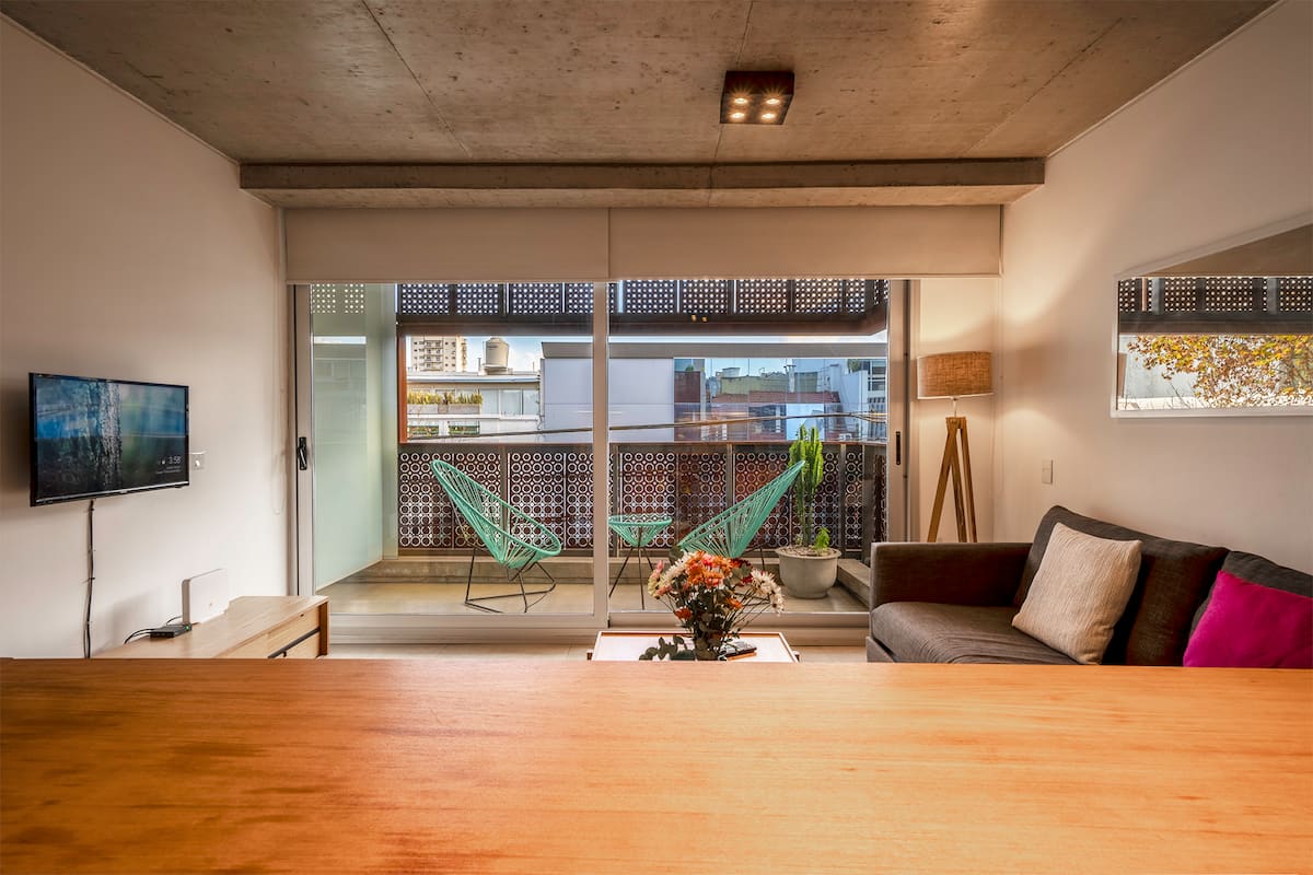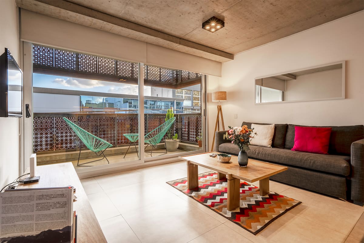 Квартира в новом доме в Palermo. В здании есть бассейн и тренажёрный зал. Сообщается, что квартира яркая и современная. Предлагается запросить рекомендации.