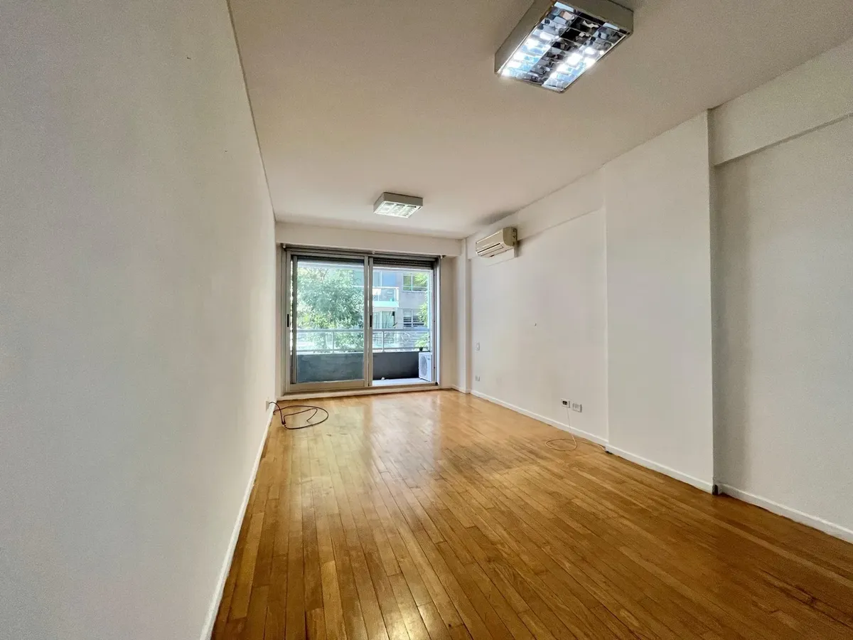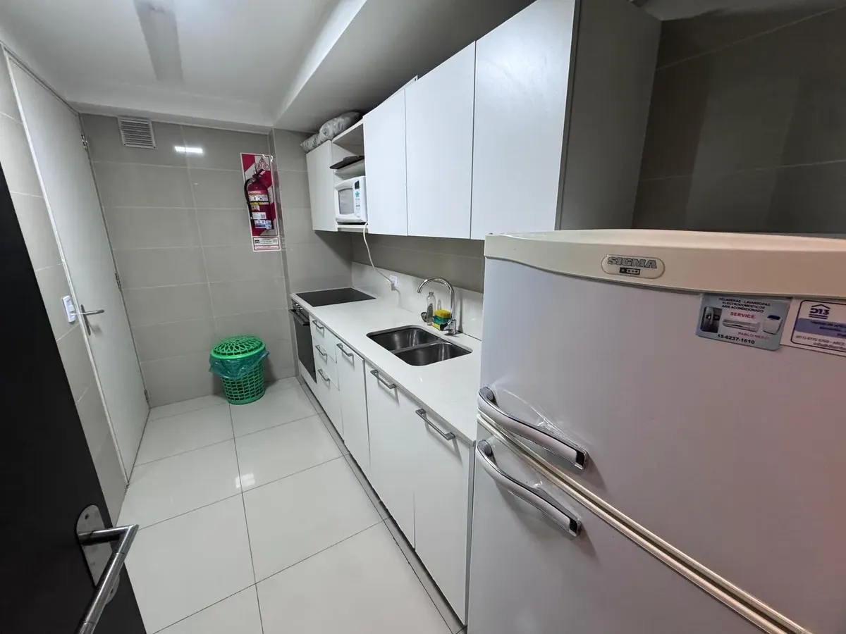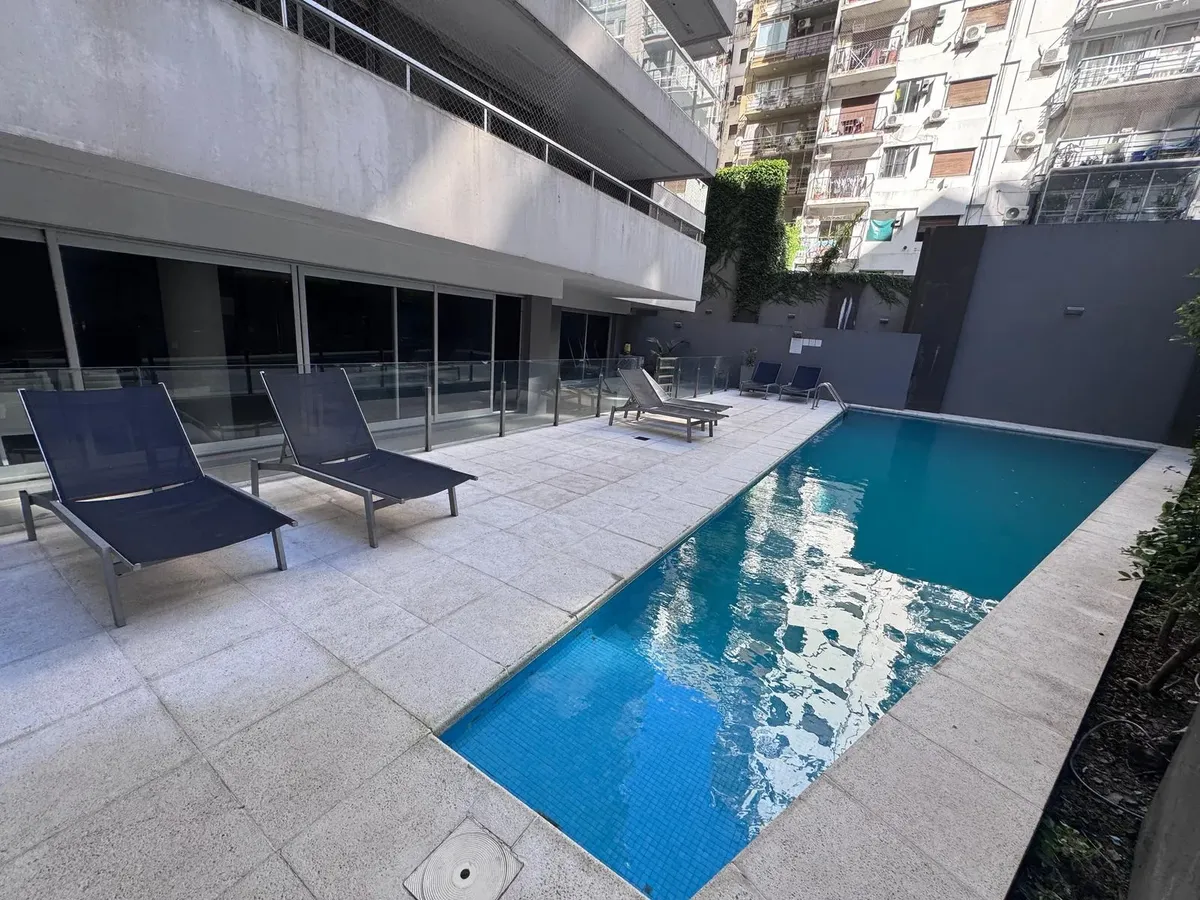 Квартира-студия в Palermo, Las Cañitas, в аренду. Площадь, этаж и тип окон в объявлении не указаны. Кухня встроенная с оборудованием; установлен кондиционер с режимами охлаждения/обогрева и лучистое отопление (losa radiante). В здании предусмотрены бассейн, тренажёрный зал, SUM с зоной гриля, прачечная, круглосуточная охрана и зелёные зоны; указано, что коммунальные платежи включают воду, отопление и обслуживание amenities.