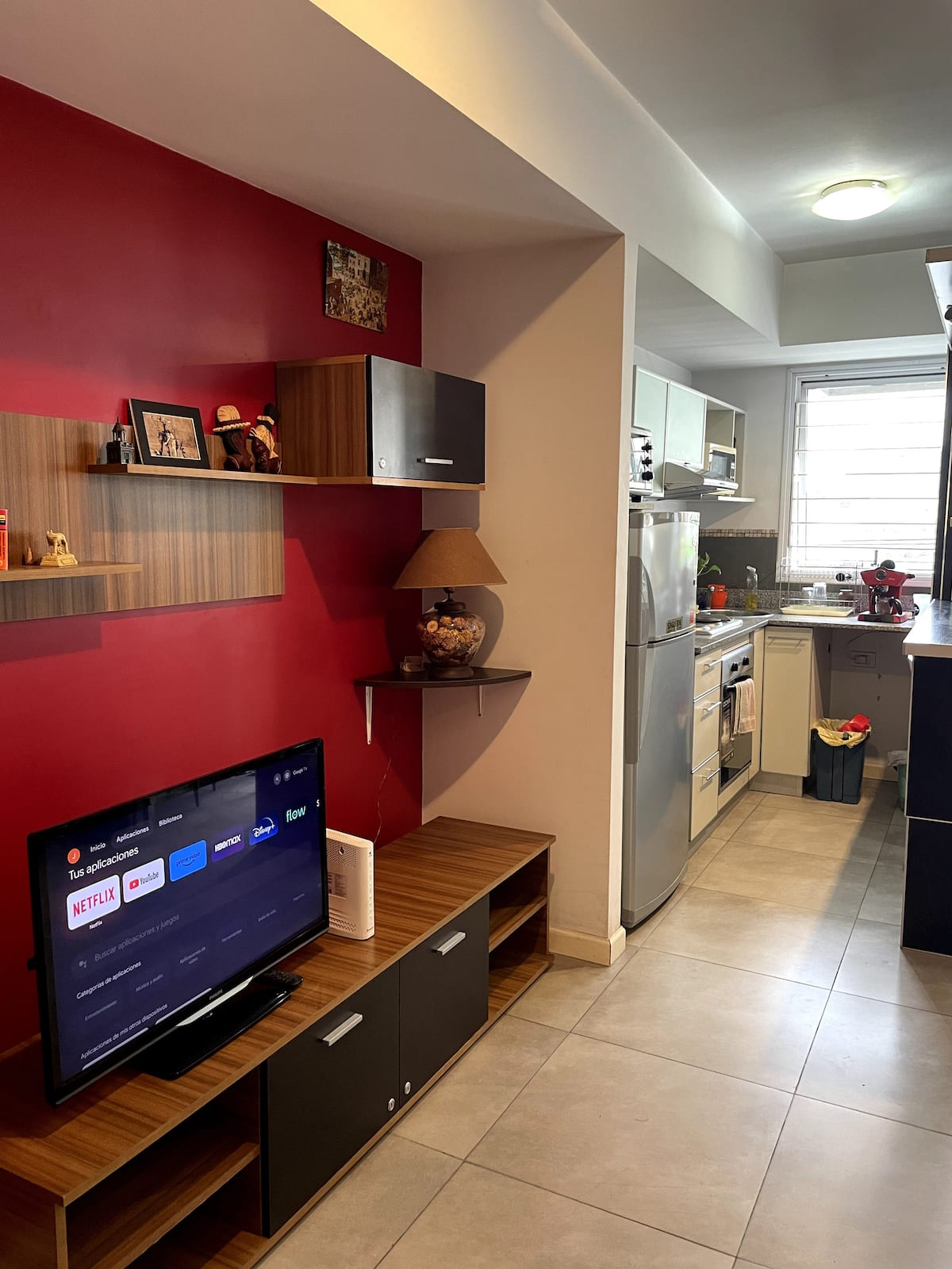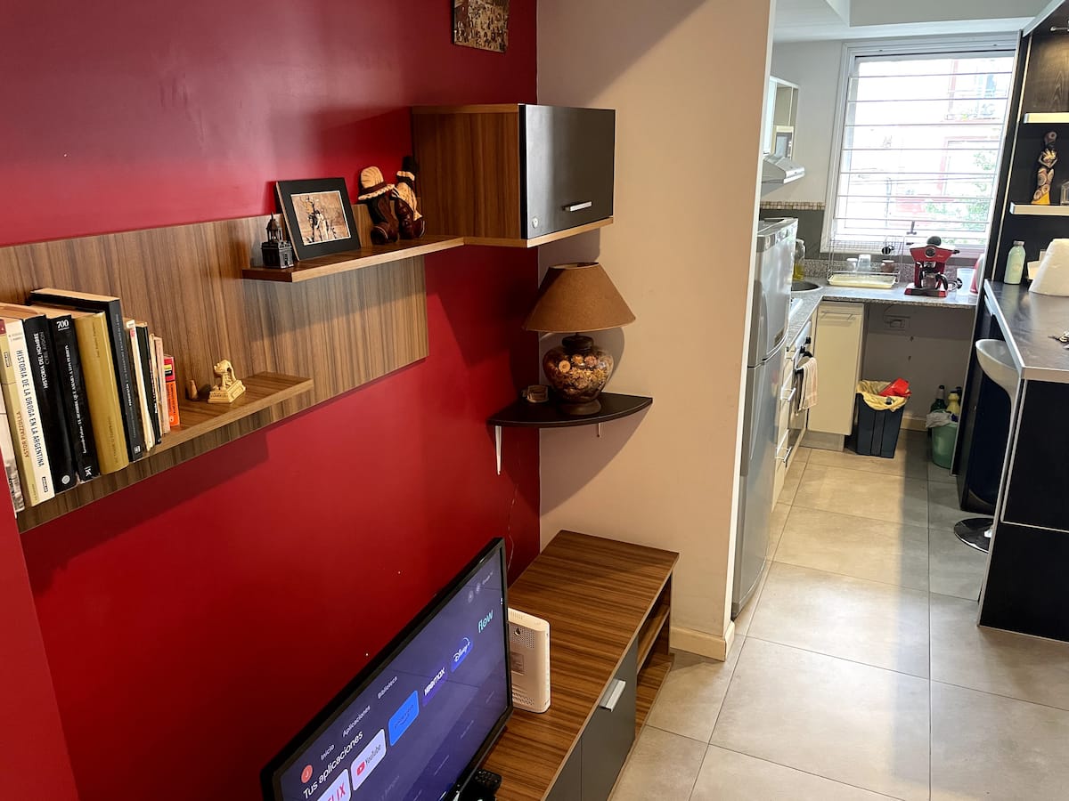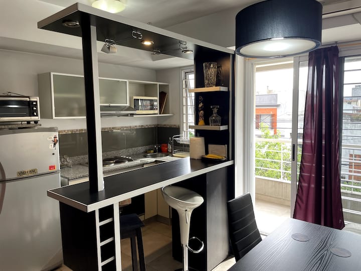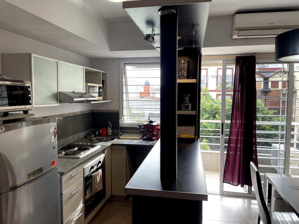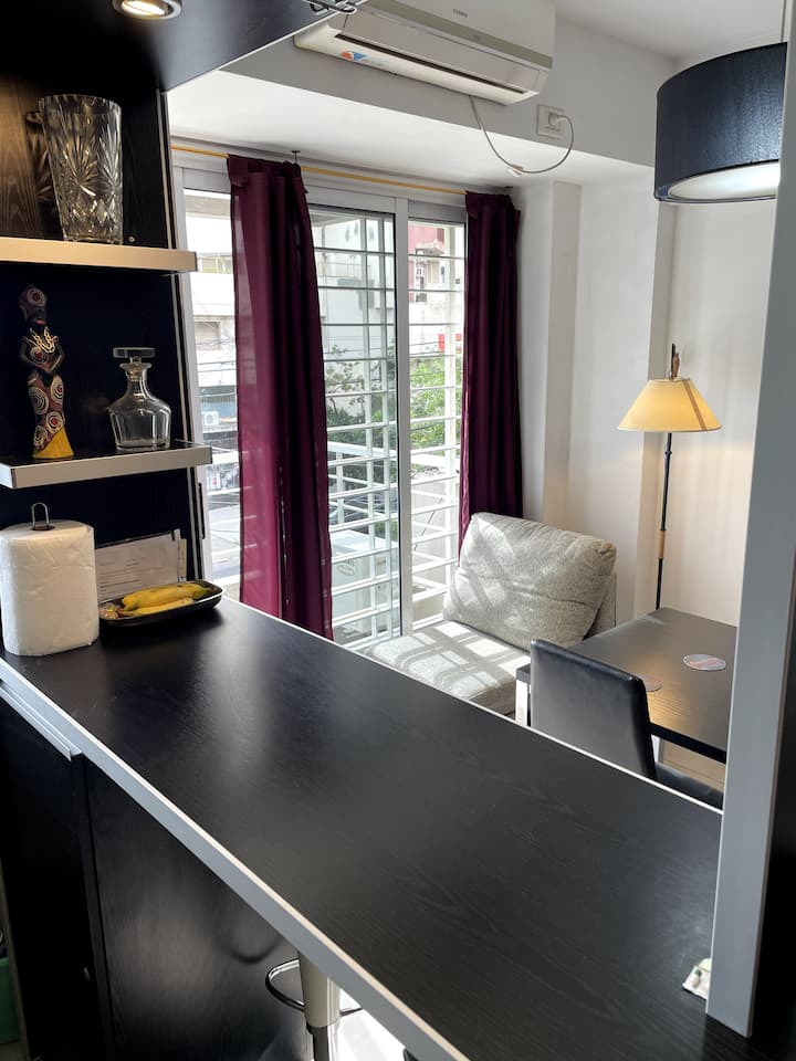 Квартира с 1 спальней в Parque Chacabuco, 2-й этаж с лифтом. Окна на обе стороны: в гостиной предусмотрен балкон с видом на улицу, в спальне окна во внутренний двор. В квартире с мебелью есть кондиционеры, диван, телевизор 32, кухня с плитой на 4 конфорки, малой духовкой, основной духовкой, водонагревателем и кофемашиной. Предусмотрены кровать размера queen и плотные шторы blackout; в стоимость включён интернет. Указано, что метро находится в 5 минутах, на углу проходят 7 автобусных линий.