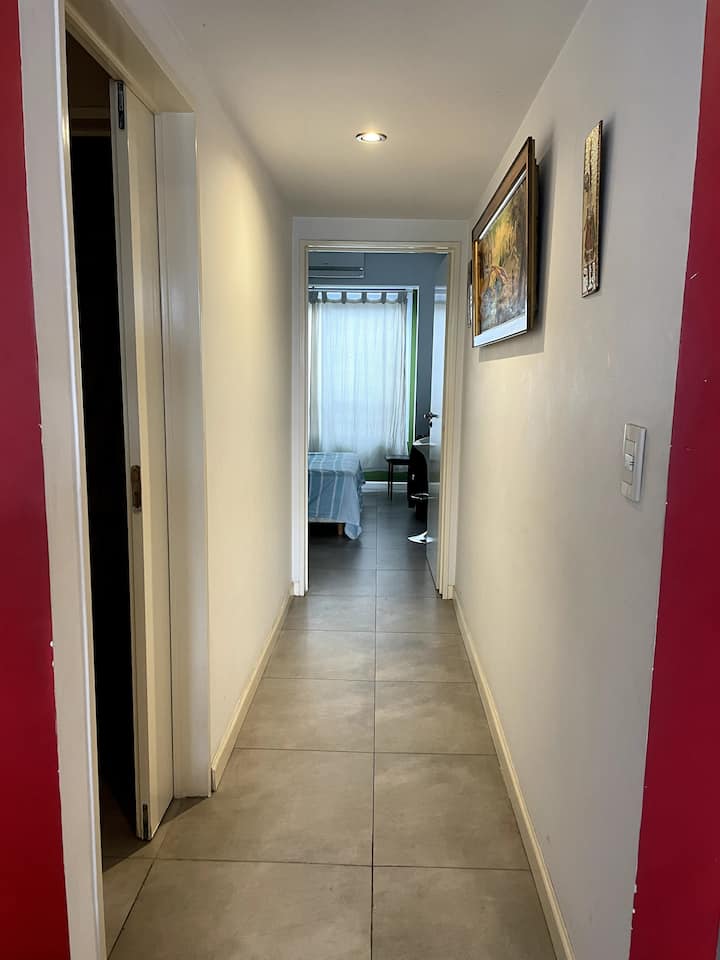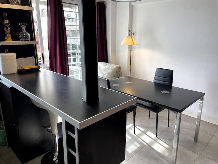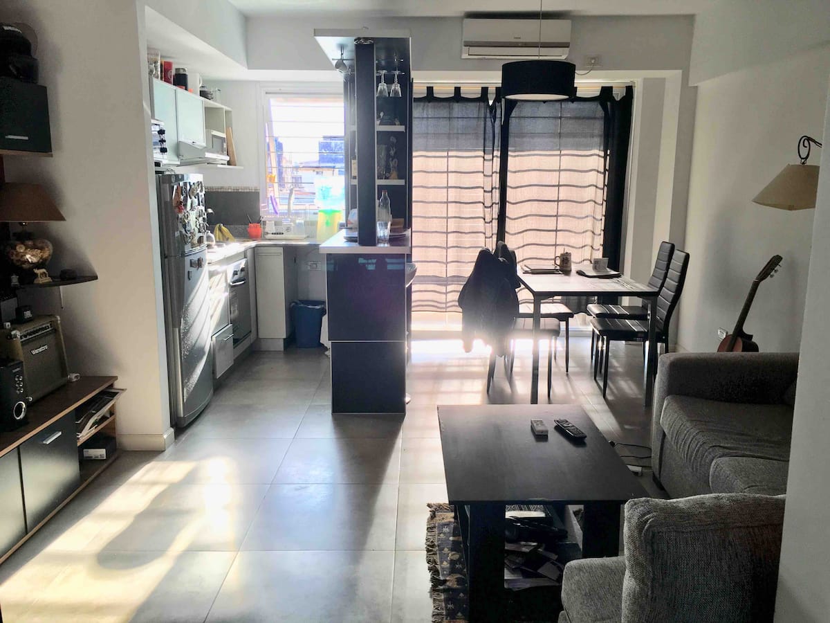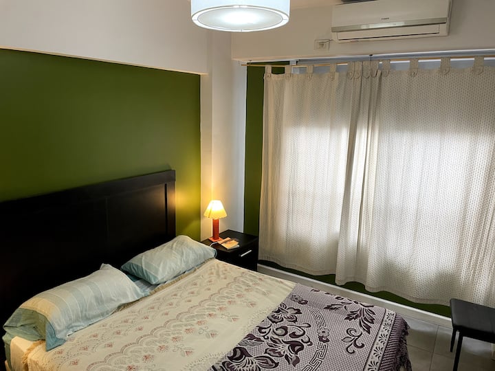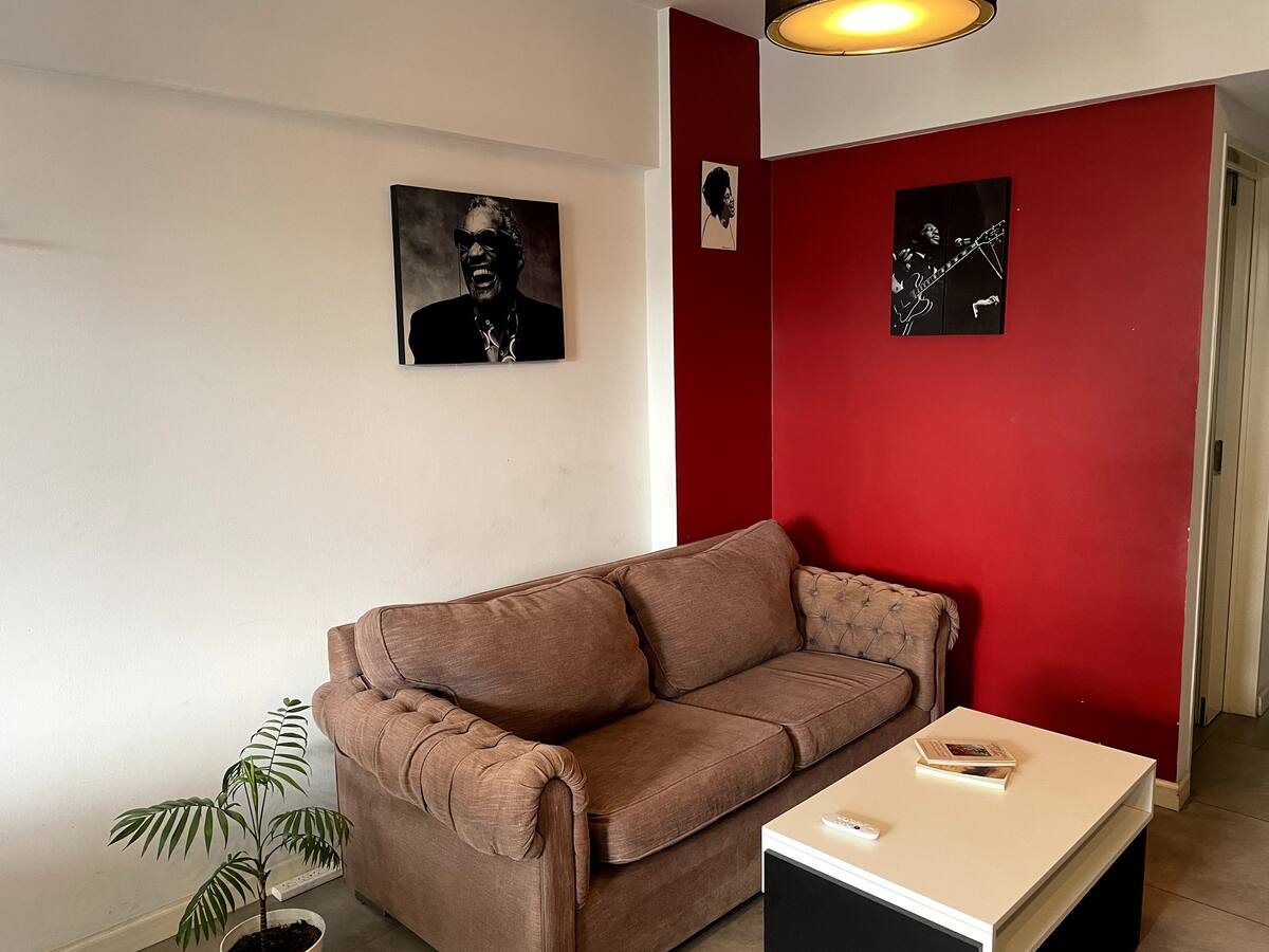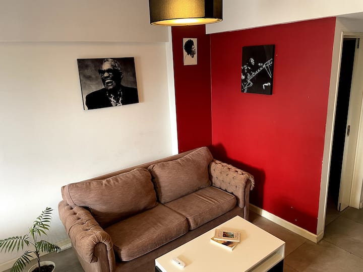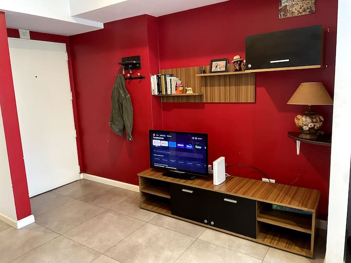 Квартира с 1 спальней в Parque Chacabuco, 2-й этаж с лифтом. Окна на обе стороны: в гостиной предусмотрен балкон с видом на улицу, в спальне окна во внутренний двор. В квартире с мебелью есть кондиционеры, диван, телевизор 32, кухня с плитой на 4 конфорки, малой духовкой, основной духовкой, водонагревателем и кофемашиной. Предусмотрены кровать размера queen и плотные шторы blackout; в стоимость включён интернет. Указано, что метро находится в 5 минутах, на углу проходят 7 автобусных линий.