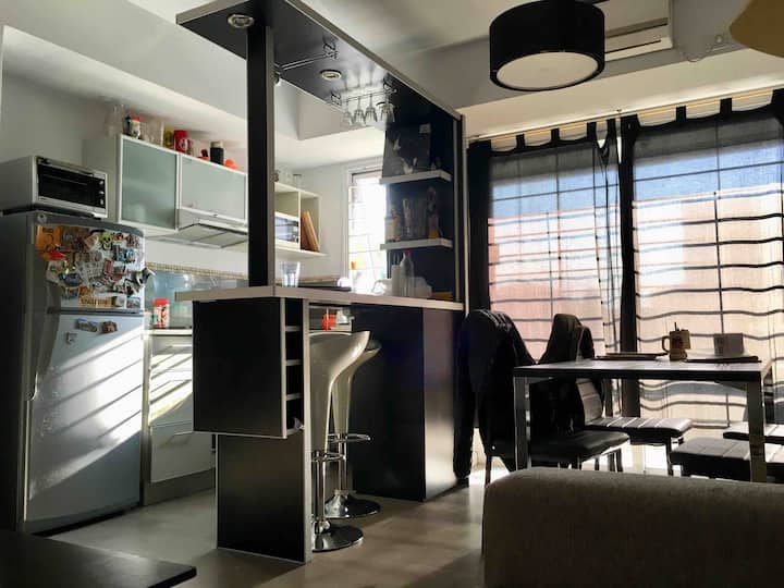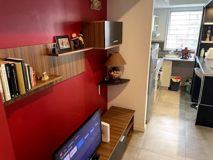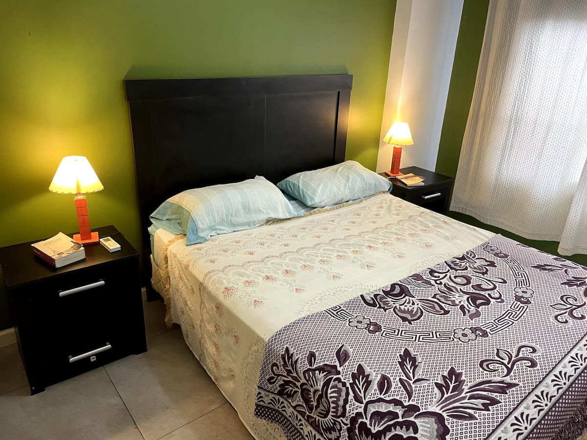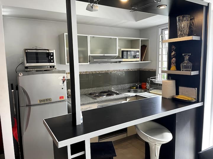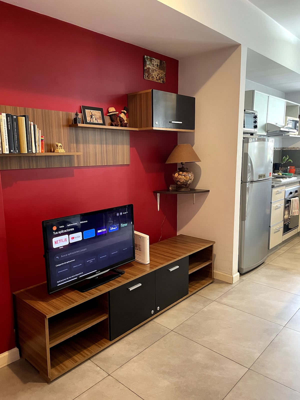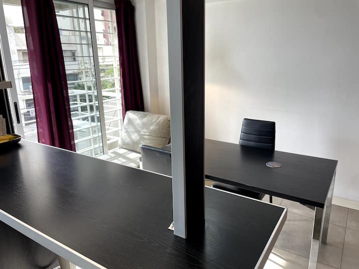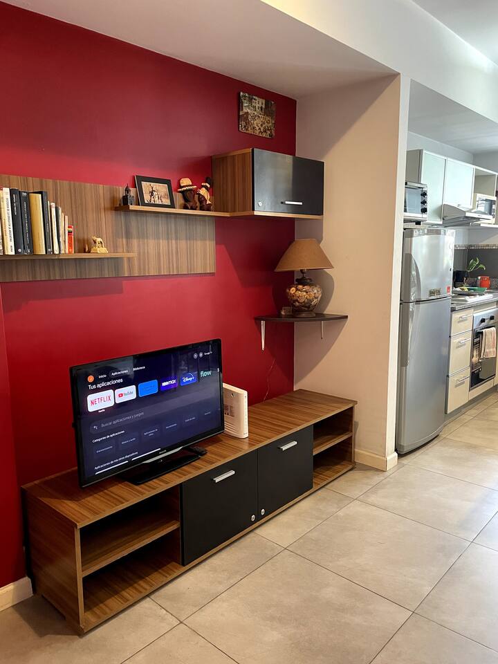 Квартира с 1 спальней в Parque Chacabuco, 2-й этаж с лифтом. Окна на обе стороны: в гостиной предусмотрен балкон с видом на улицу, в спальне окна во внутренний двор. В квартире с мебелью есть кондиционеры, диван, телевизор 32, кухня с плитой на 4 конфорки, малой духовкой, основной духовкой, водонагревателем и кофемашиной. Предусмотрены кровать размера queen и плотные шторы blackout; в стоимость включён интернет. Указано, что метро находится в 5 минутах, на углу проходят 7 автобусных линий.
