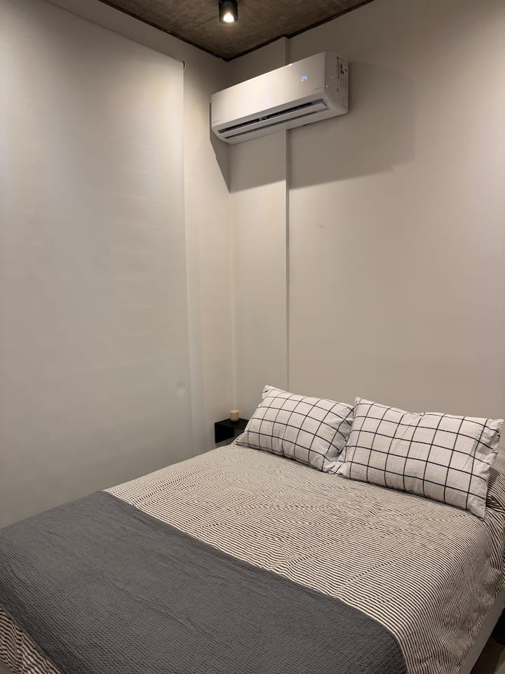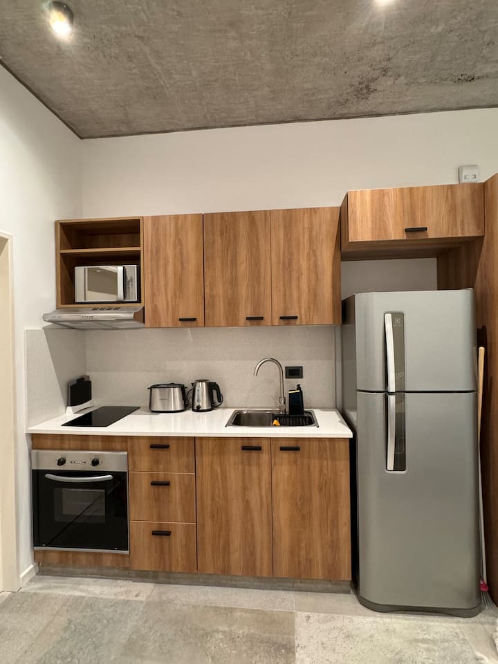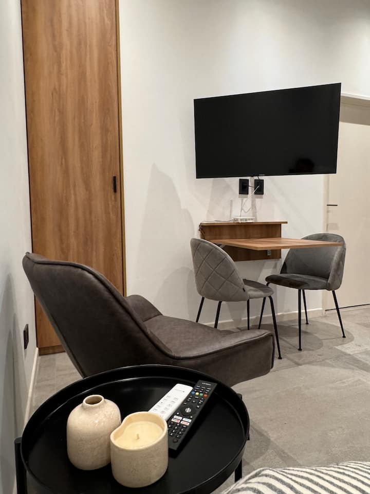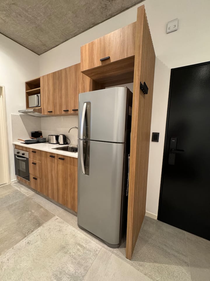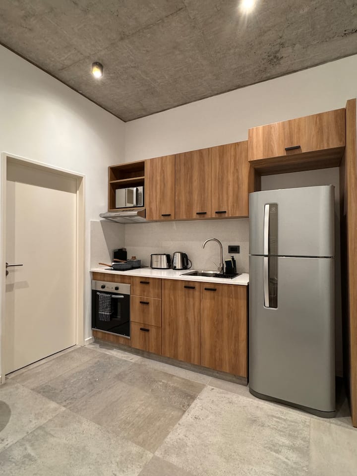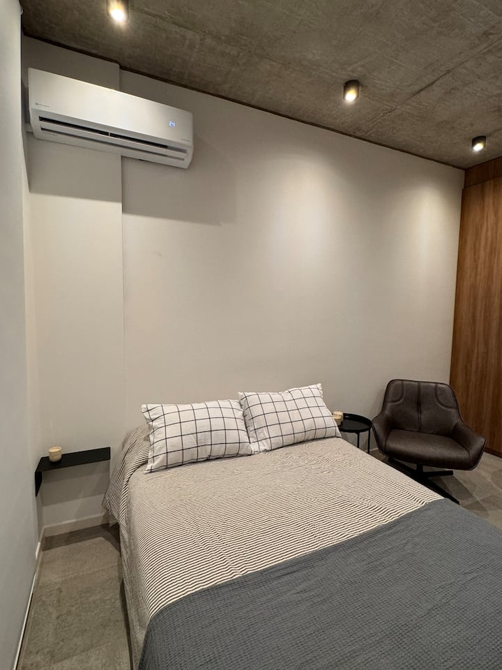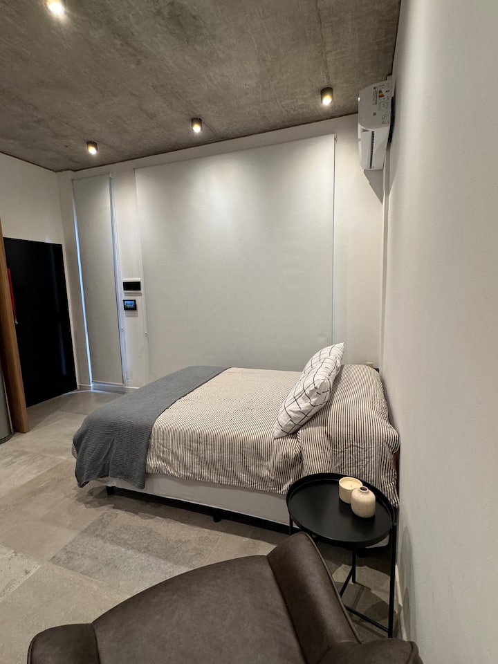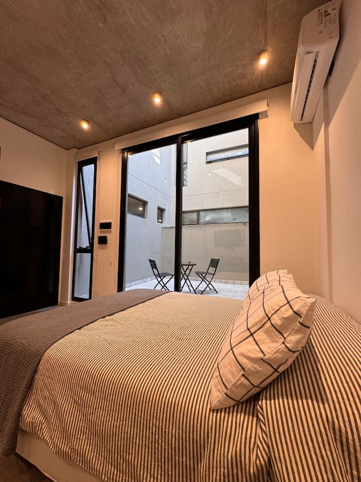 Квартира-студия 23 m² в Parque Chas, отдельная ванная комната и собственный патио. В студии размещены двуспальная кровать, кресло и 42” Smart TV. Кухня полностью оборудована, на патио стоит уличная мебель. Указано наличие Wi‑Fi.