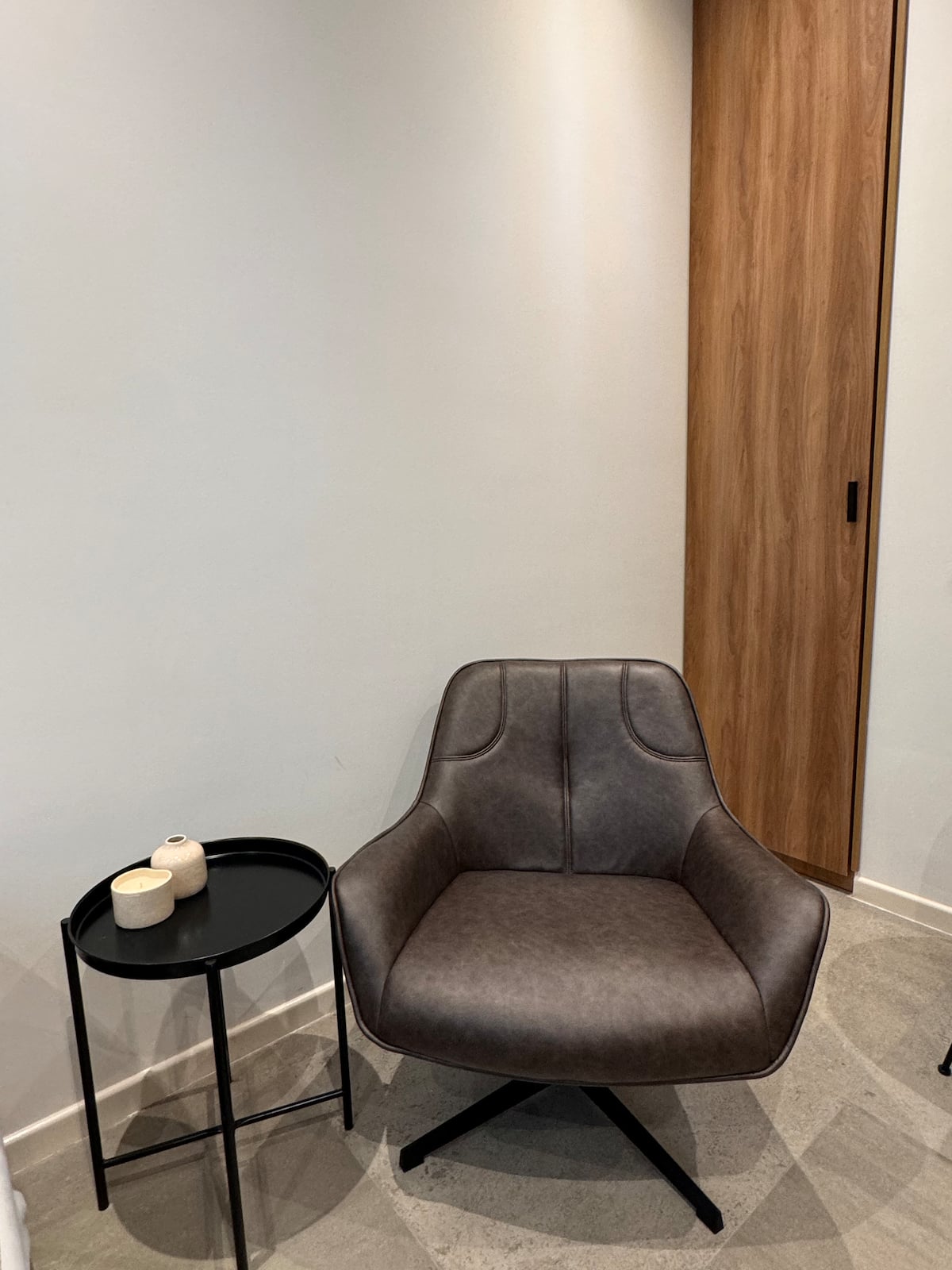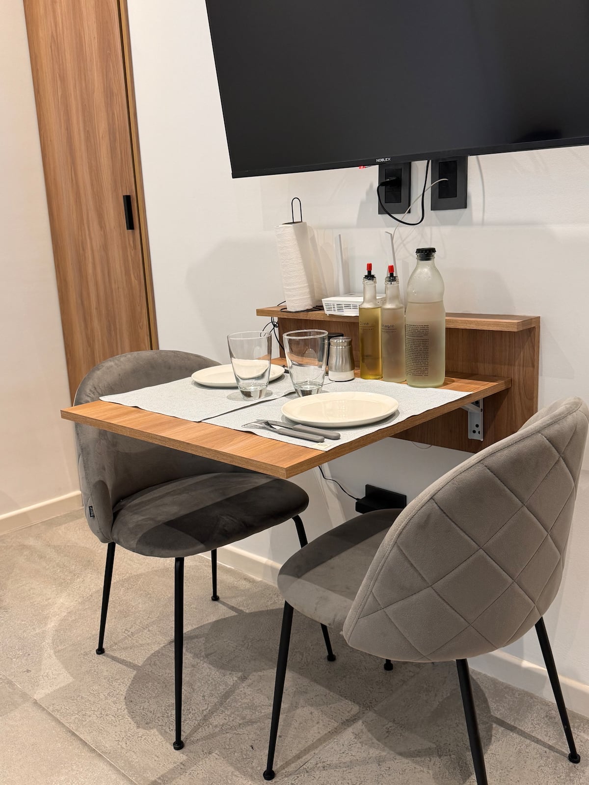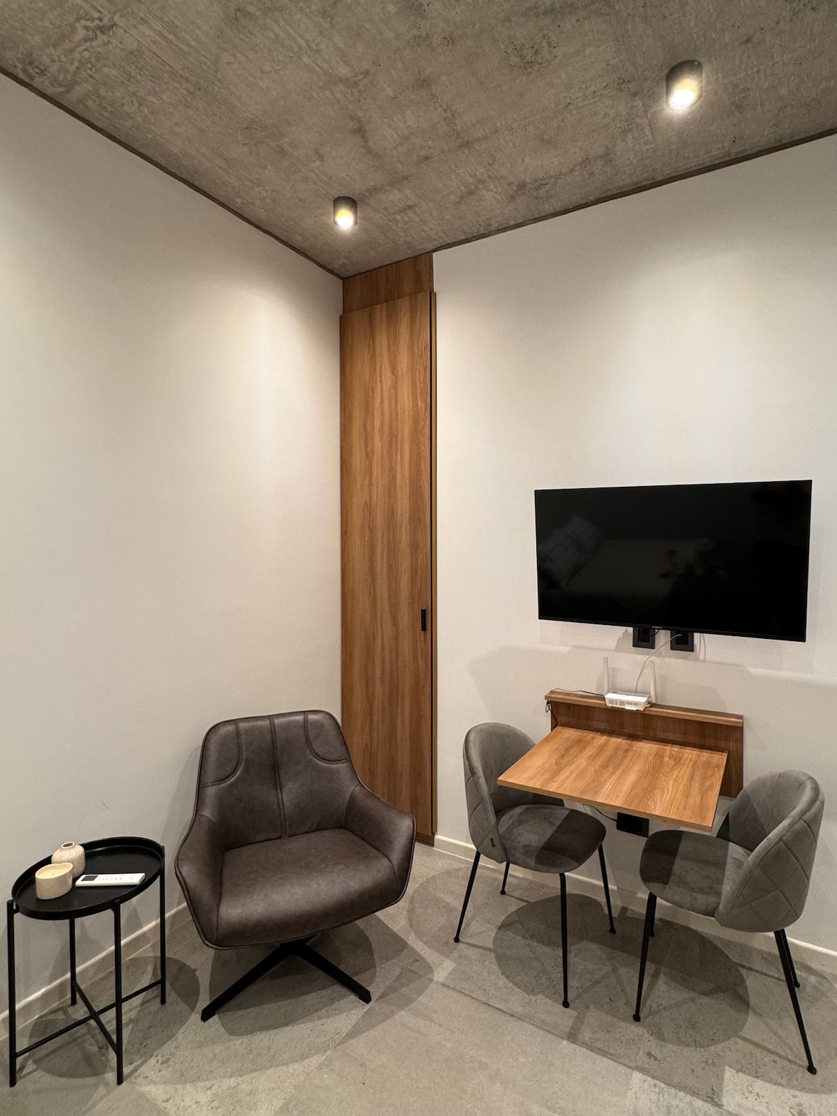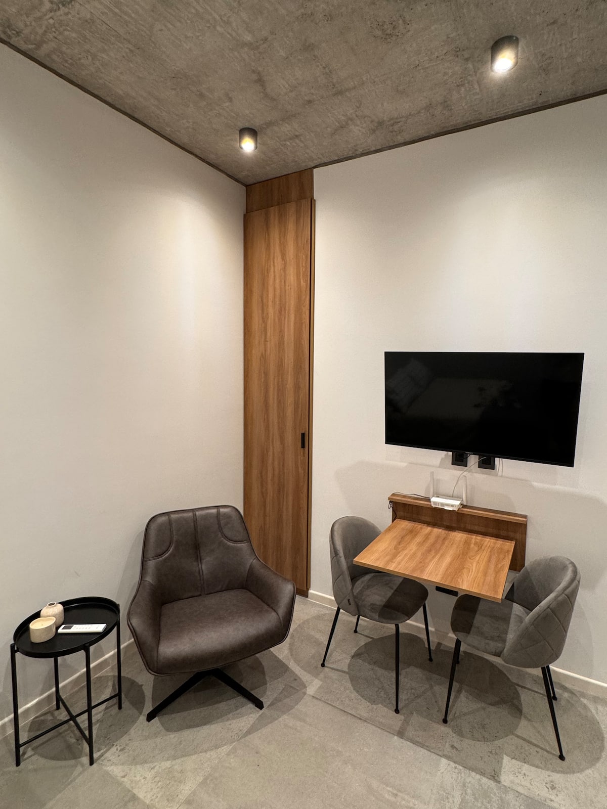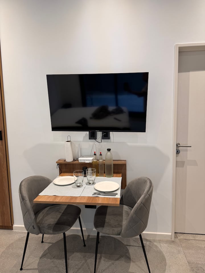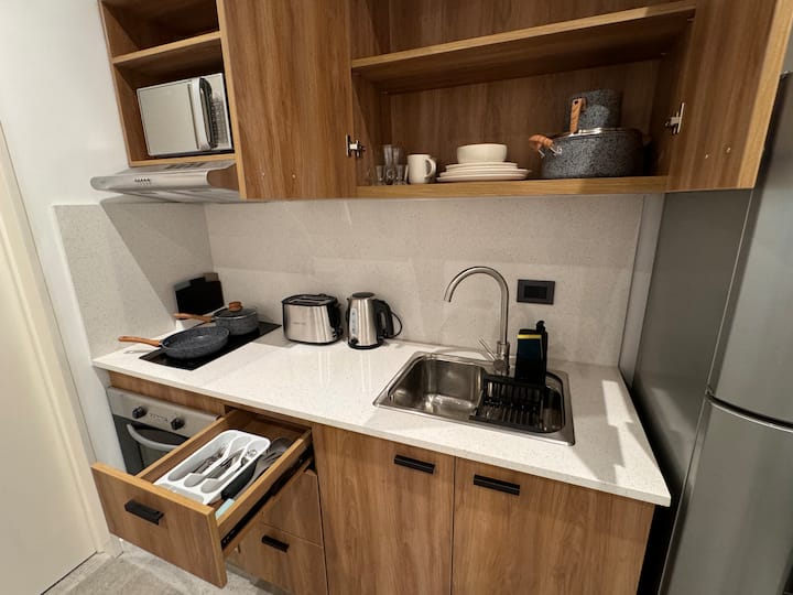 Квартира-студия 23 m² в Parque Chas, отдельная ванная комната и собственный патио. В студии размещены двуспальная кровать, кресло и 42” Smart TV. Кухня полностью оборудована, на патио стоит уличная мебель. Указано наличие Wi‑Fi.