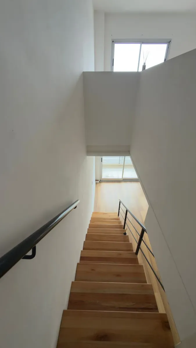 Квартира с двумя комнатами в формате двух уровней: 1 спальня на верхнем этаже, гостиная-столовая на первом с выходом на балкон на улицу. Кухня интегрирована и полностью электрическая, в спальне оборудована ванная комната в suite. Коммунальные платежи здания указаны как низкие; дом электрический полностью.
