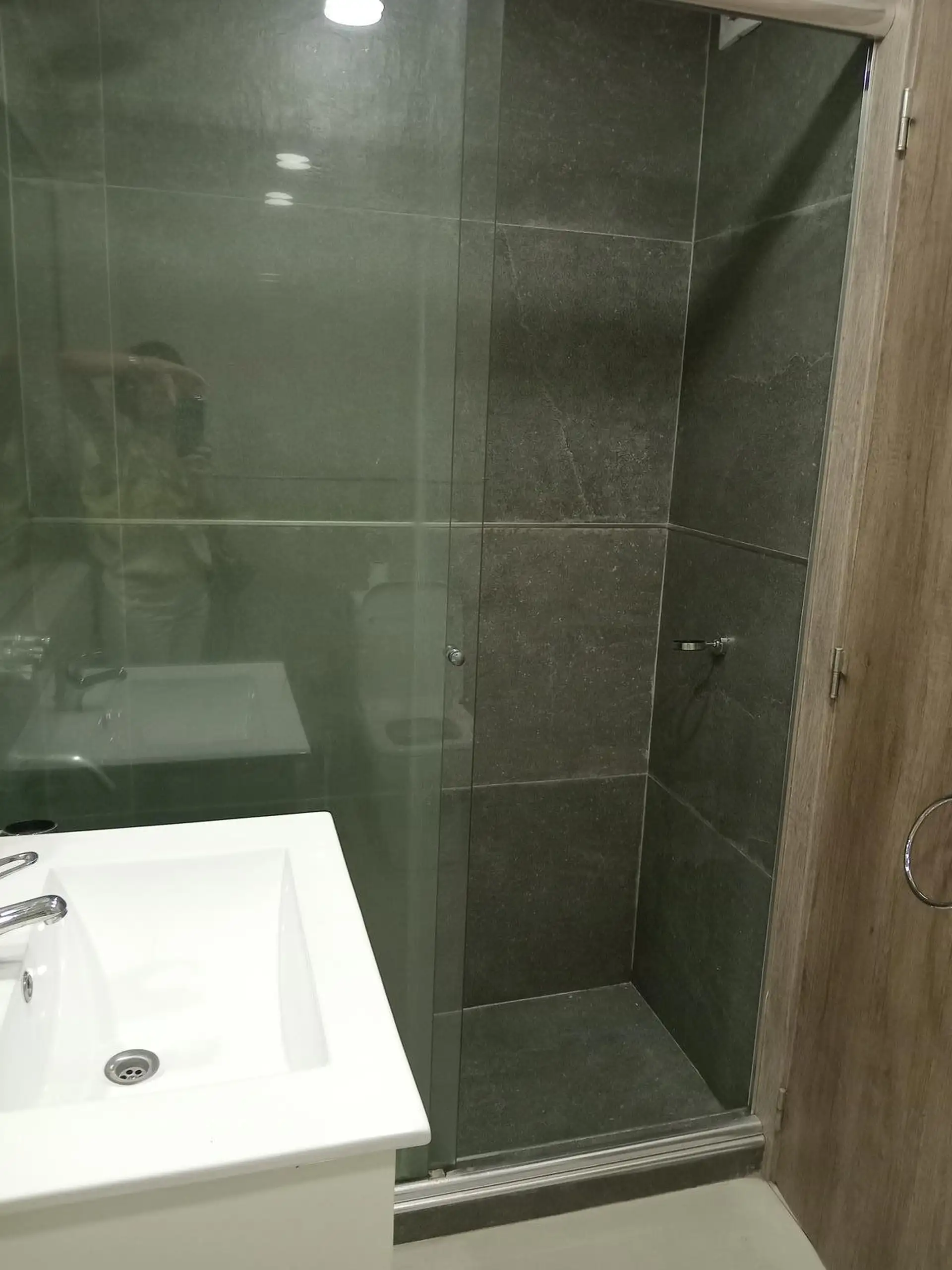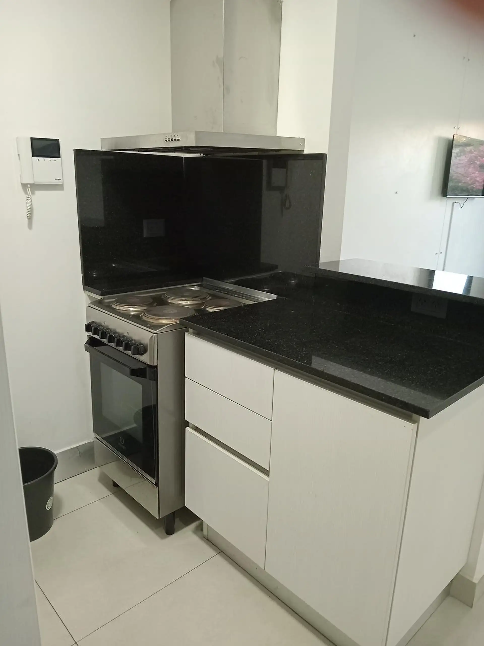 Квартира с двумя комнатами (разделённая квартира-студия) площадью 34,88 m² крытых, балкон 2,97 m², всего 37,85 m². Окна на улицу, с мебелью. Гостиная-столовая объединена с кухней, спальня — почти в suite. Кухня со столешницей из чёрного мрамора, верхними и нижними шкафами, вытяжкой из нержавеющей стали; полностью оборудованная ванная с душевой кабиной; чёрные шторы и освещение установлены. Установлены кондиционер «холод/тепло», работает электрическое отопление; индукционная/электрическая кухонна