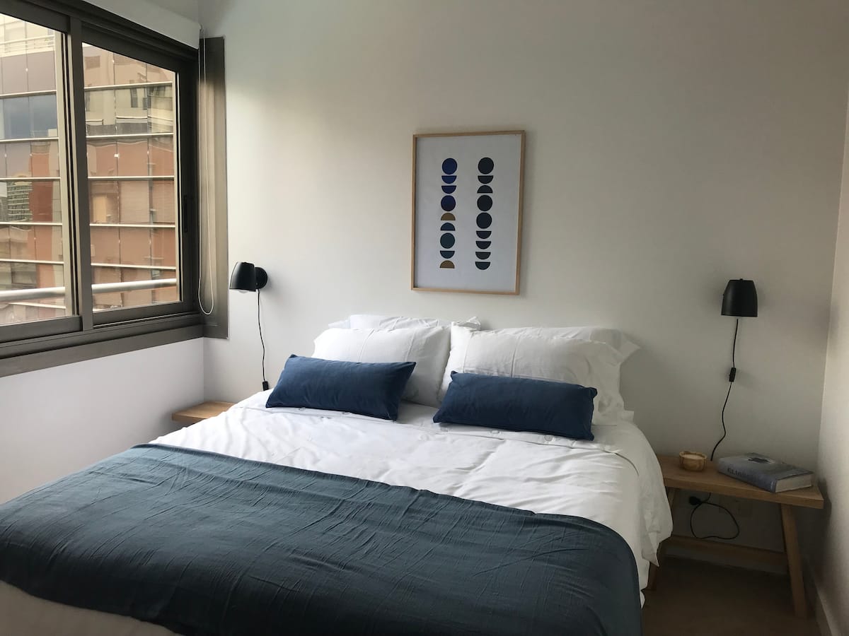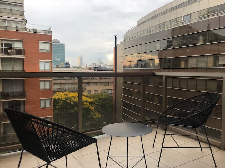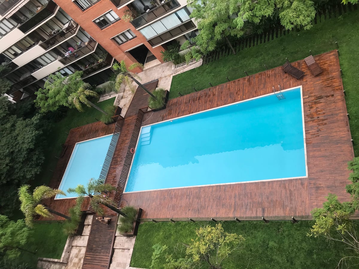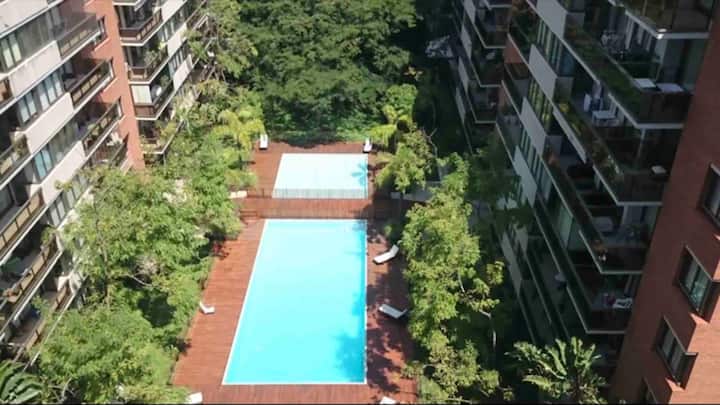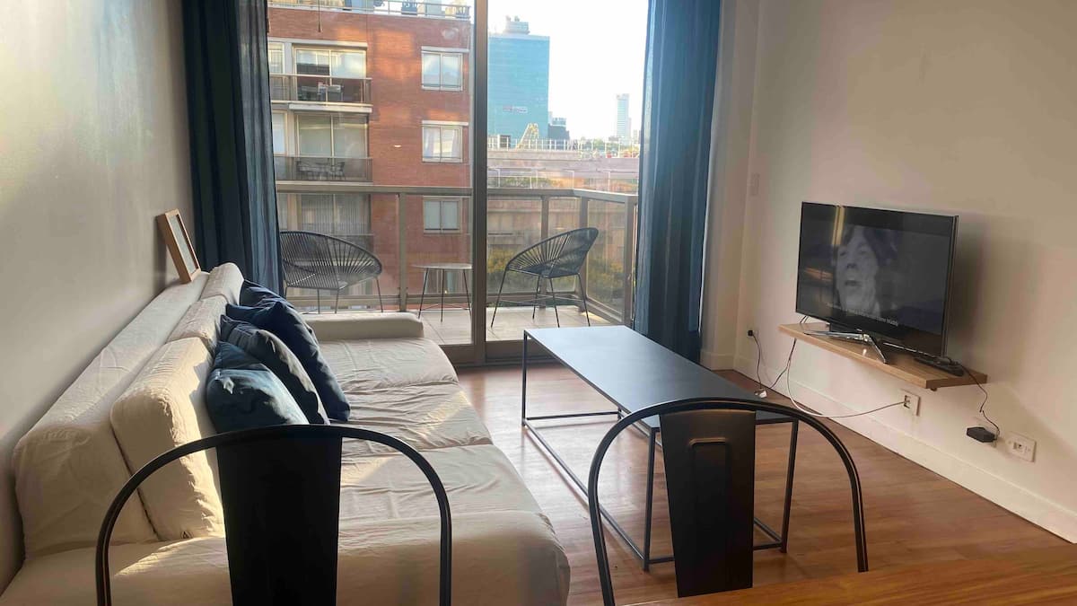 Квартира с 1 спальней расположена на 6-м этаже. Есть балкон с видом на внутренний двор квартала и бассейн. В здании предусмотрены тренажёрный зал, зона стирки и круглосуточная охрана.